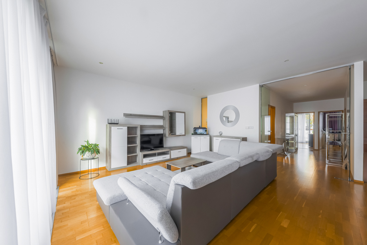 Hlavní obytná část tvoří velkorysý obývací pokoj s plně zařízenou kuchyní. Díky velkoplošným francouzským oknům je prostor maximálně prosvětlen a propojen s balkonem. Z chodby do obývacího pokoje vedou elegantní celoskleněné dvoukřídlé dveře. Kuchyňská linka je vybavena veškerými spotřebiči a nabízí dostatek úložného prostoru.