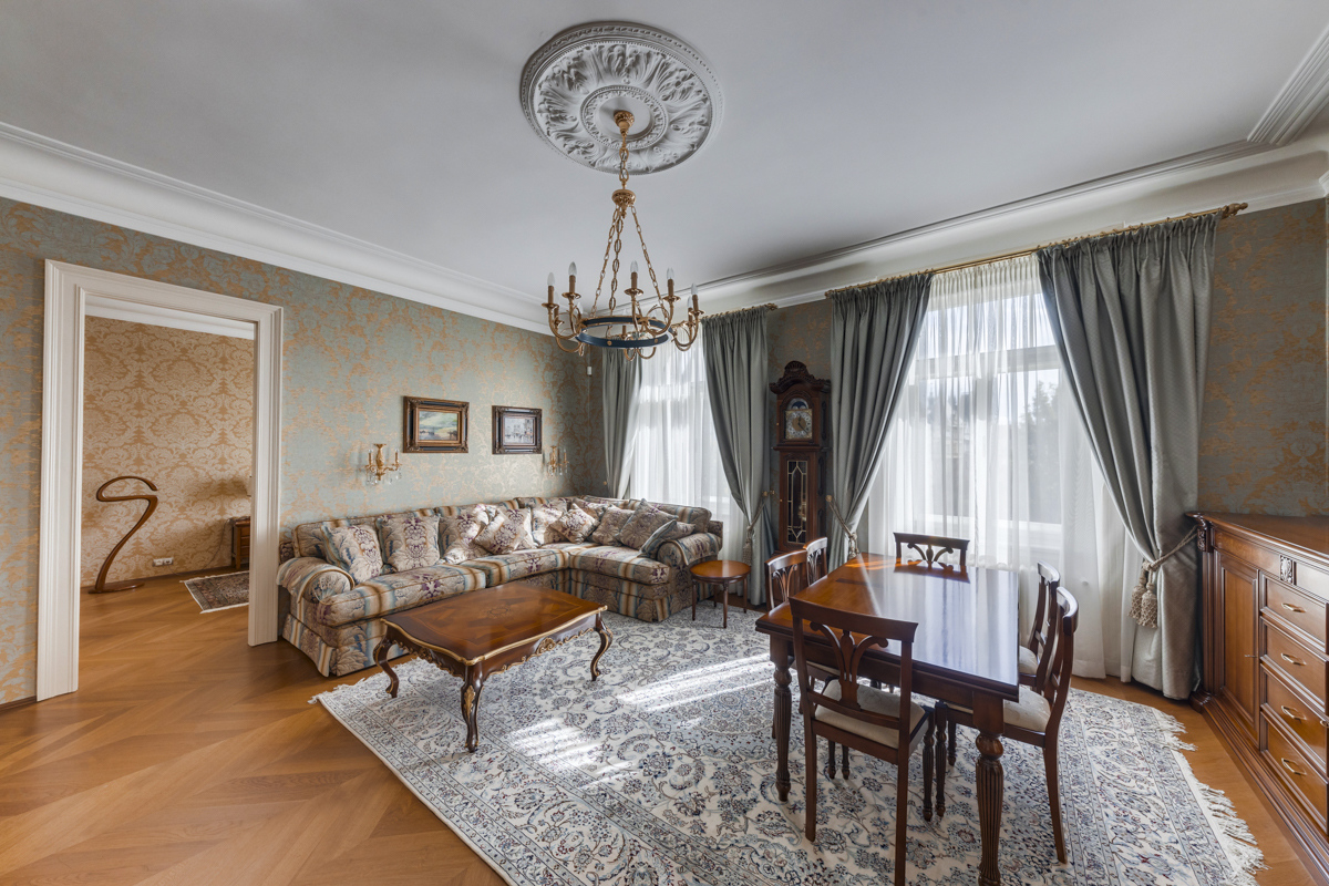 Apartmán uchvátí svou elegancí a historickými prvky s jedinečným geniem loci. Kromě toho je velmi slunný a prosvětlený díky množství špaletových oken, které byly nově zrestaurovány a odhlučněny. Bytu dominuje reprezentativní obývací pokoj s historickými stropními štuky a odpočinkovým prostorem s pohovkou a jídelní částí. Dále v bytě nalezneme prostornou vstupní halu, koupelnu s vanou a oddělenou toaletou, dvě soukromé ložnice a plně vybavenou kuchyň.