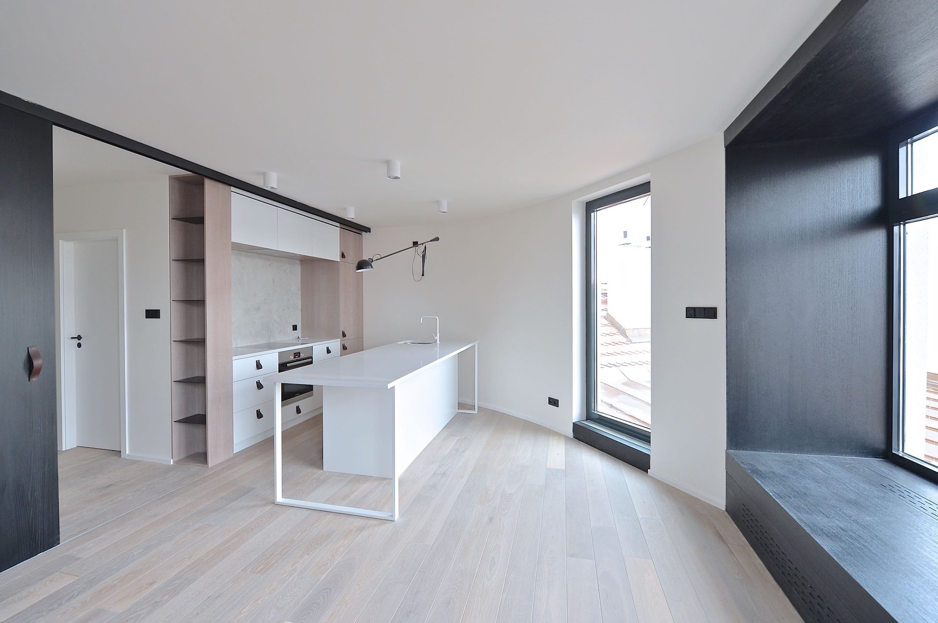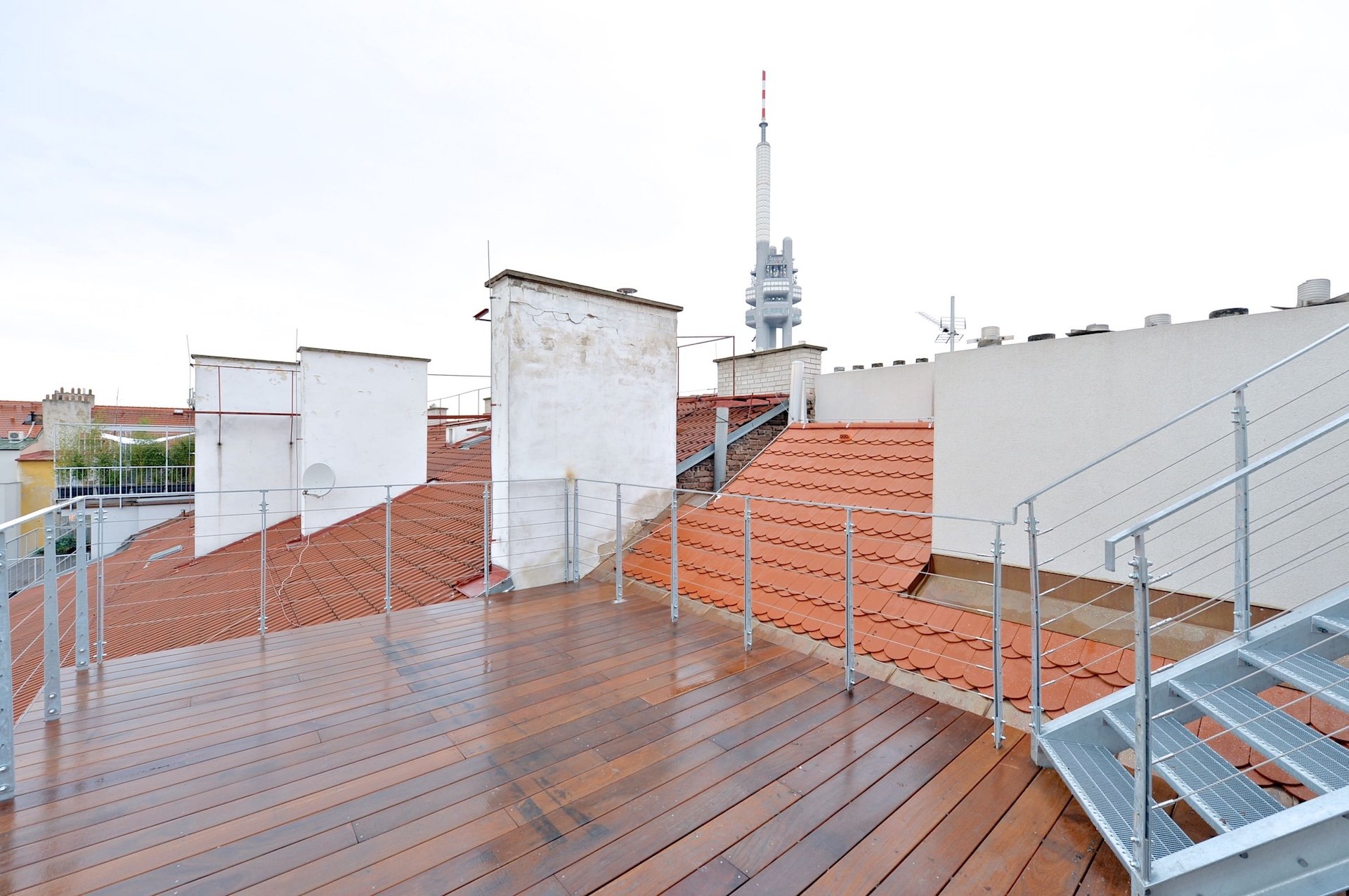 Moderní byt s dispozicí 2+kk o celkové výměře 60 m² disponuje nadstandardně prostornou terasou (40 + 60 m²) s úžasnými výhledy na blízké okolí i pražské panorama včetně Žižkovského vysílače. Tento moderně řešený byt se nachází v posledním patře budovy a je dokončen ve vysokém standardu včetně dubových podlah, nových oken s dvouvrstvým sklem nebo klimatizace. Design v minimalistickém stylu v neutrálních barvách uspokojí nároky i toho nejnáročnějšího klienta.