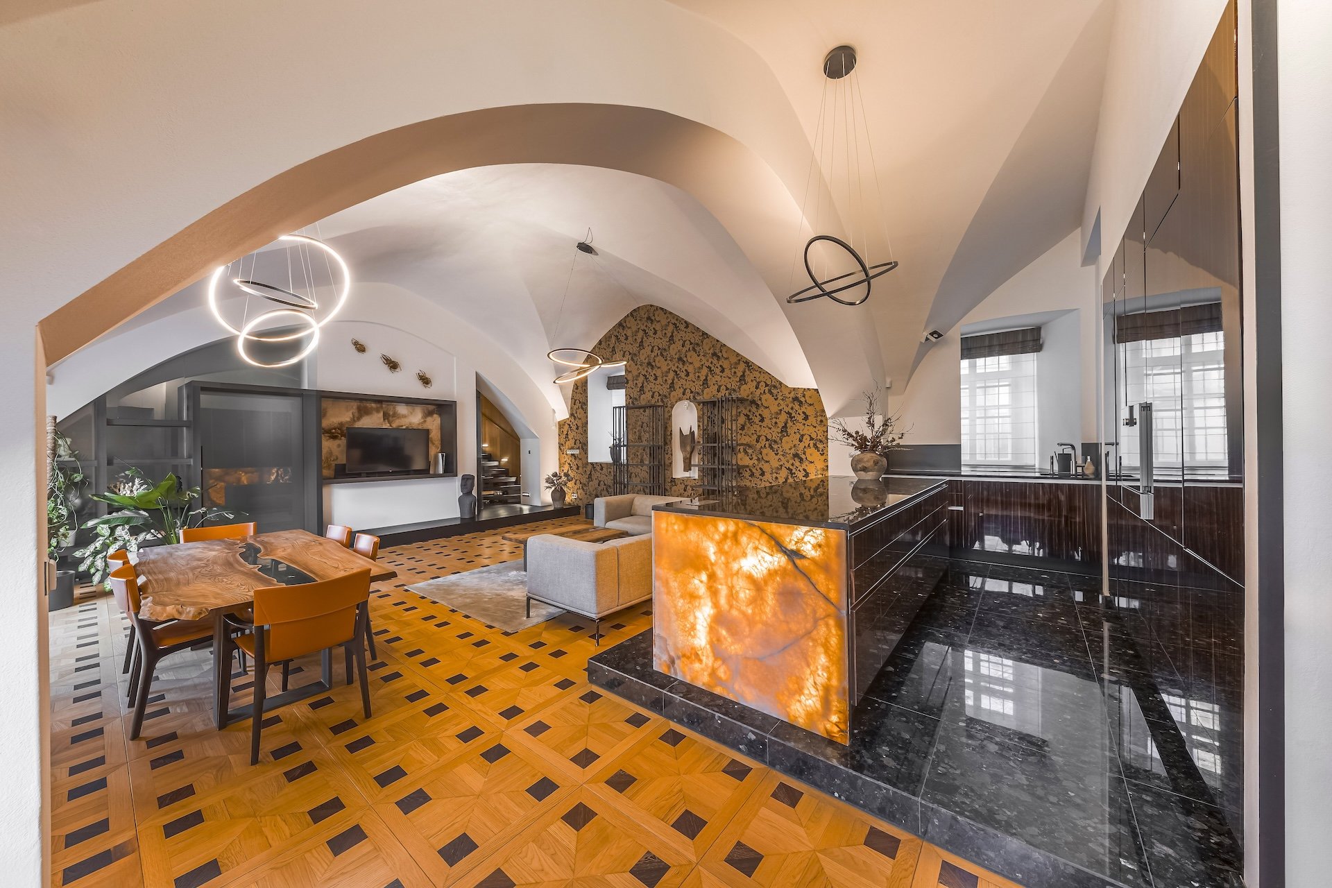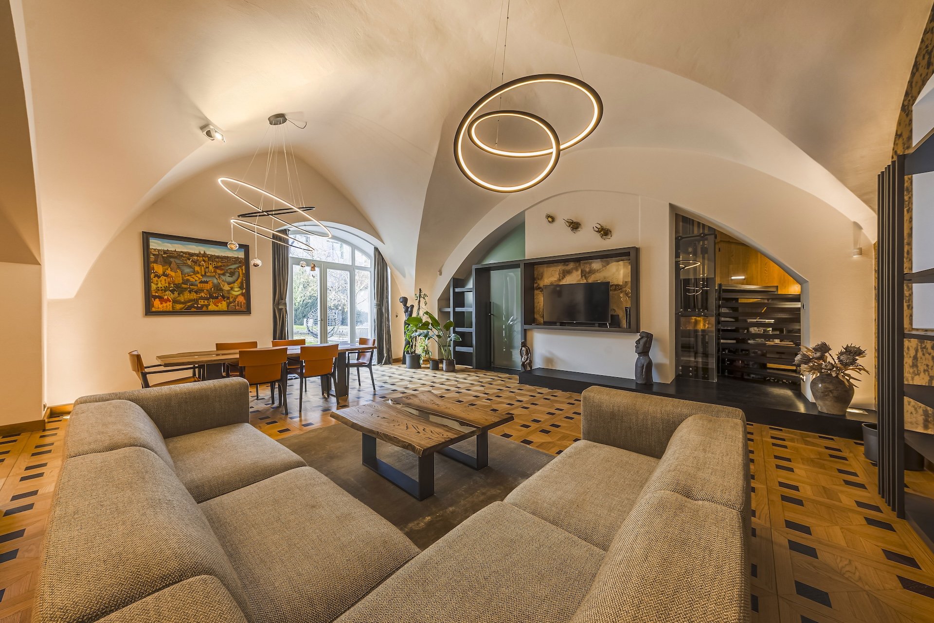 Koncept této jednotky kombinuje prostor rodinné vily s vlastní zahradou zasazené do uzavřeného areálu s recepcí, parkováním a společným dvorem, a to vše pouhých pár kroků od Staroměstského náměstí, Pařížské ulice nebo Dvořákova nábřeží.