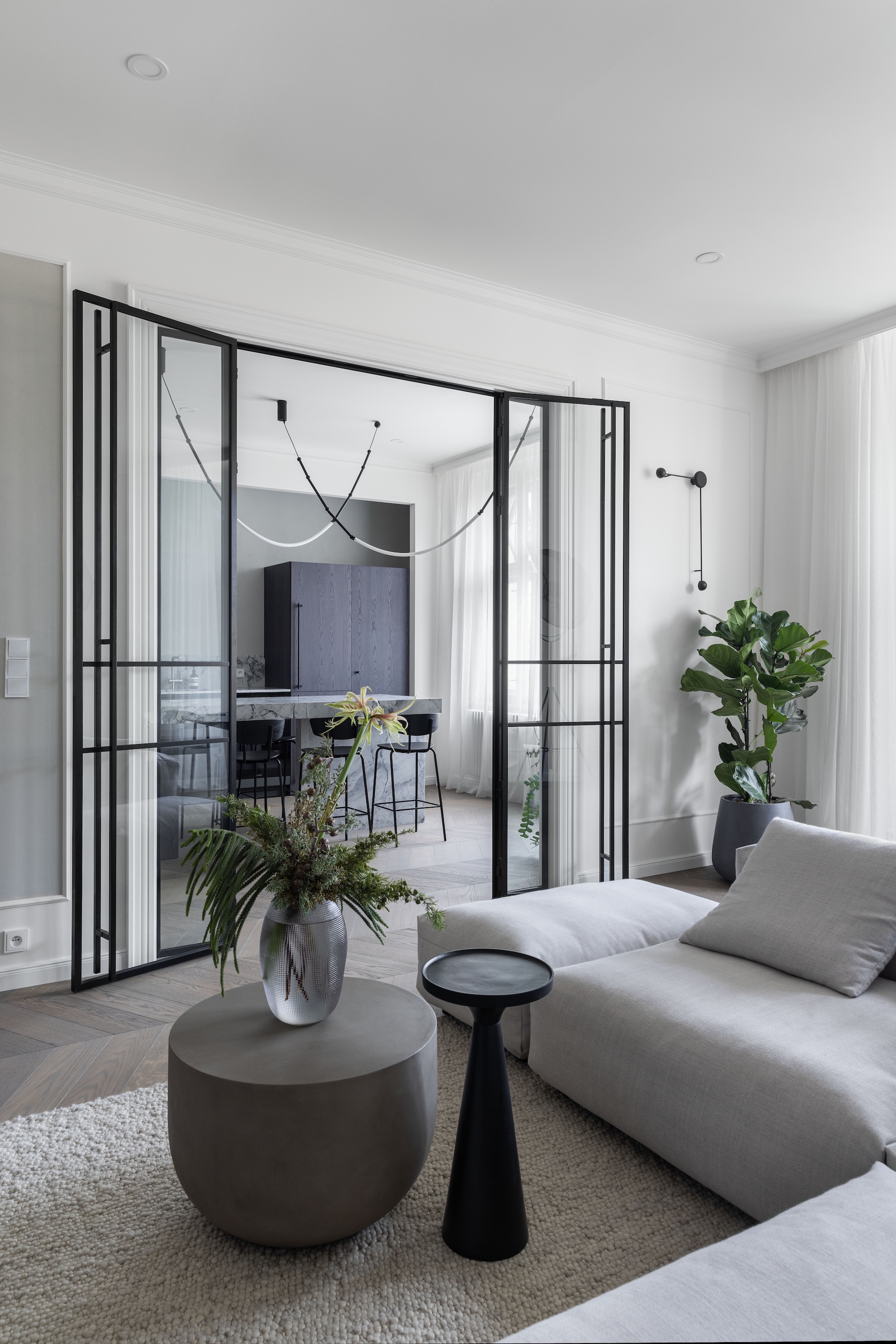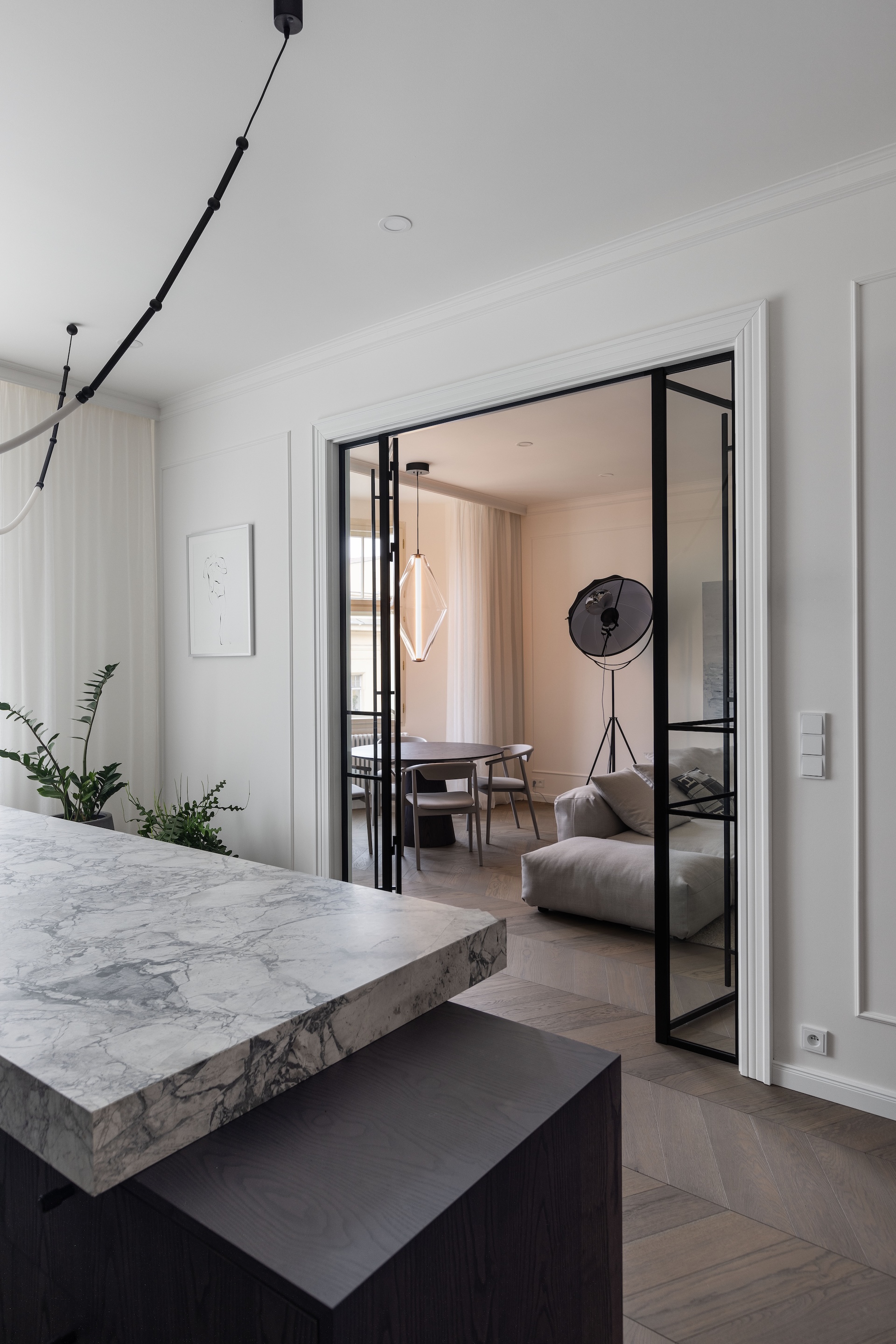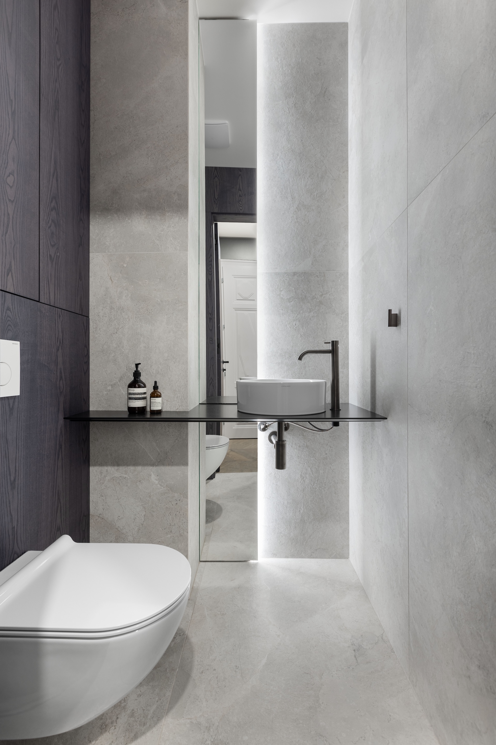 Byt nabízí dvě ložnice a koupelnu s toaletou, zařízenou v minimalistickém stylu s důrazem na detail a funkčnost. Světlé barevné tóny, dřevěné podlahy a prosklené prvky vytvářejí vzdušnou a harmonickou atmosféru celého bytu.