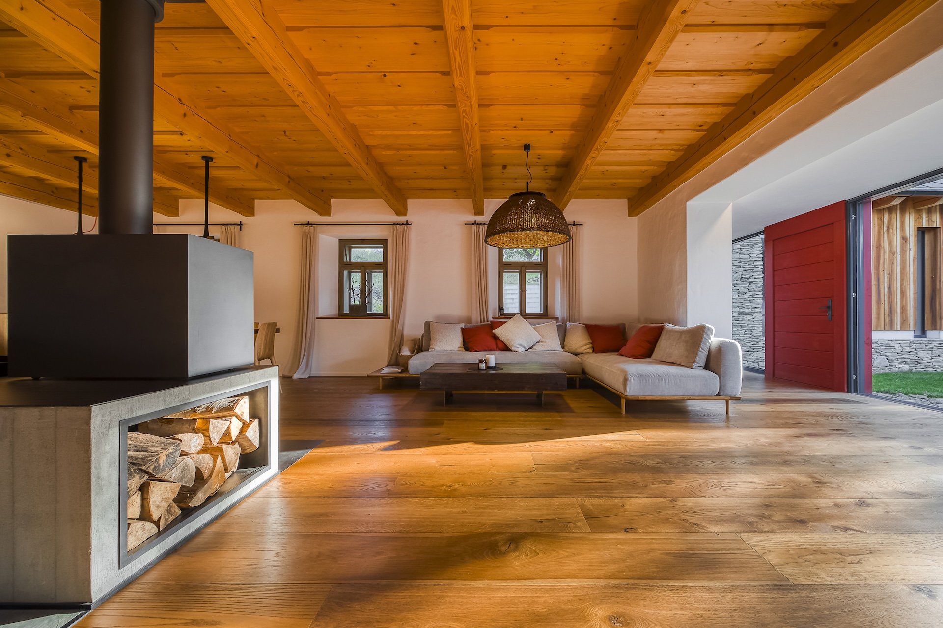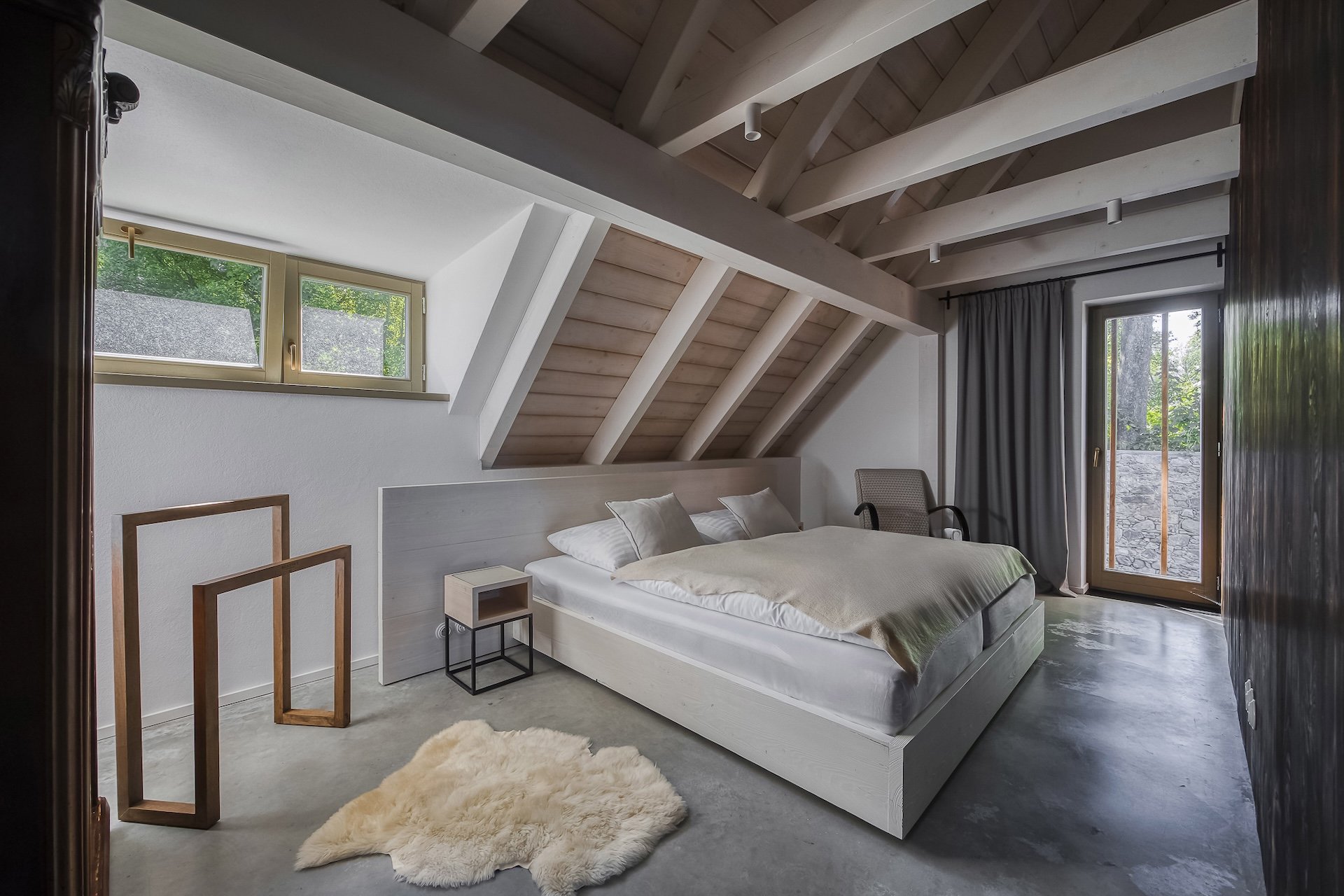 Srdcem celé nemovitosti je prostorná světnice v přízemí jedné z chalup s moderně vybavenou kuchyní, jídelním koutem a kamny. Díky velkoformátovým posuvným proskleným oknům je místnost zalita světlem a zároveň nabízí krásný výhled na zatravněné nádvoří – v letních měsících je možné světnici propojit s venkovním prostorem. Dispozici spodního patra doplňuje velkorysá koupelna s vanou, technická místnost a schodiště vedoucí jak do praktického sklepa, tak do horního patra. V něm se nacházejí dvě prostorné ložnice – obě mají velikost přes třicet metrů čtverečních a otevřené podkroví s přiznanými trámy, díky nimž působí vzdušně a plné přirozeného světla. Atmosféru každé z nich dotvářejí autentické prvky: stěny z původních prken či velkoformátové dlaždice v jedné ložnici a masivní dřevěné parkety v druhé. Stylové detaily, jako je krb, venkovní dřevěné okenice na velkoformátových oknech a solitérní vana dodávají interiéru jedinečný charakter. V horním patře je navíc hostovská ložnice a koupelna s toaletou.