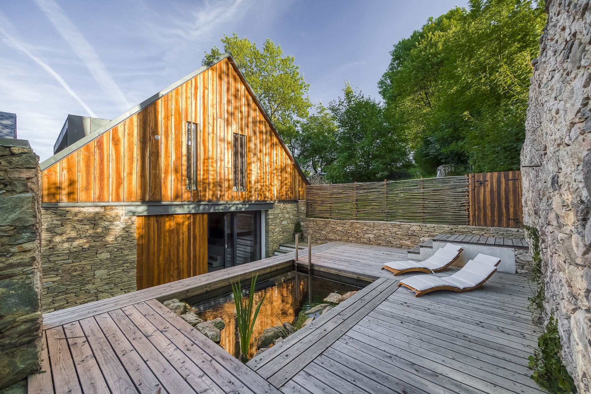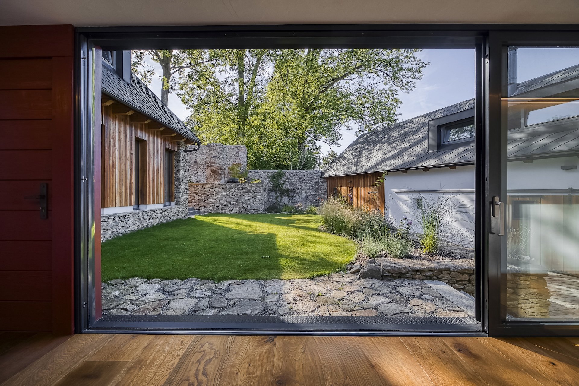 - Zatravněné nádvoří s terasou, relaxační zónou s bazénkem a přístupem k letní kuchyni