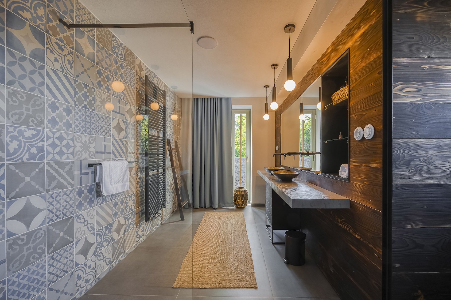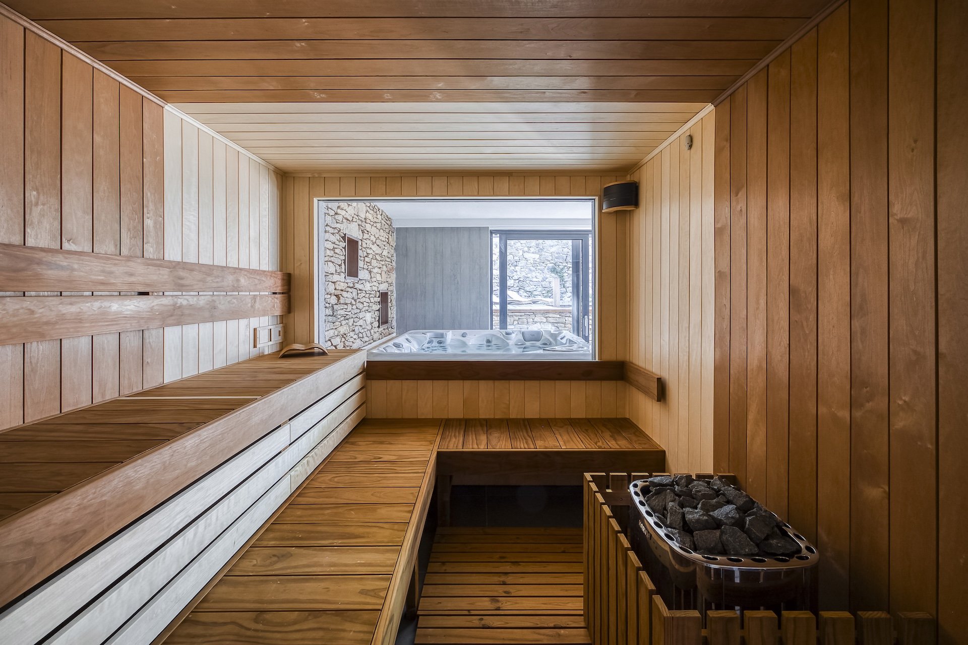 Druhá chalupa upoutá pozornost zejména luxusním domácím wellness s finskou saunou a vířivkou. Pro maximální pohodlí slouží velkoformátová dlažba, kamenné obložení v prostorné odpočívárně a přímý vstup na terasu s odpočinkovou zónou a ochlazovacím bazénkem. Kromě wellness zde najdete také technické zázemí, šatnu a zádveří se stylovým schodištěm do horního patra, kde jsou situovány dva samostatné pokoje se sdílenou velkou koupelnou s toaletou. Třetím objektem je původní stodola: v jejím přízemí je praktický sklad a letní kuchyně, v horním patře pak prostorný sál, ideální pro cvičení jógy nebo menší společenské akce.