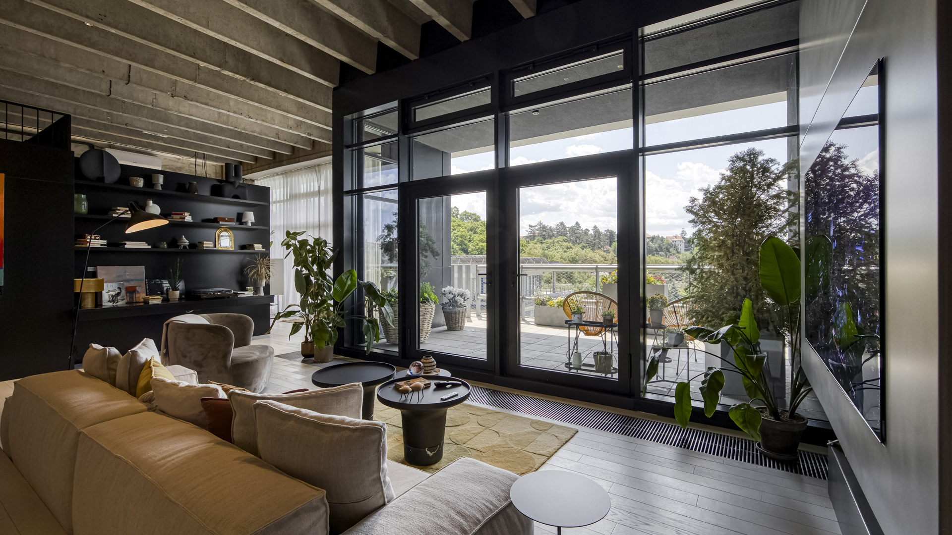 Zajímavé je i řešení celého loftu, kdy je maximálně využitý potenciál otevřeného prostoru, ale zároveň je zachováno soukromí v privátní části. Ze zádveří s denní toaletou se vstupuje přímo do hlavního obývacího prostoru, kterému dominuje na míru stavěná kuchyňská linka se značkovými spotřebiči a kuchyňským ostrůvkem a jídelní stůl. Hned vedle se nachází obývací kout s pohovkou, kterému dodává útulnou atmosféru moderní plynový krb. Na něj navazuje prostorná, jižně orientovaná terasa s krásnými výhledy jak do blízké zeleně, tak směrem k brdským Hřebenům za Prahou. Samozřejmostí je vyvedení vody i elektřiny na terasu, stejně jako elektricky ovládané stínění oken. Stranou každodenního ruchu je pak elegantní ložnice laděná do decentních pastelových barev s vlastním vstupem na terasu. En suite koupelna s prostorným sprchovým koutem a toaletou hned vedle je díky luxferové stěně plná přirozeného světla. Nad zázemím je pak vybudováno praktické spací patro pro přespání návštěv.