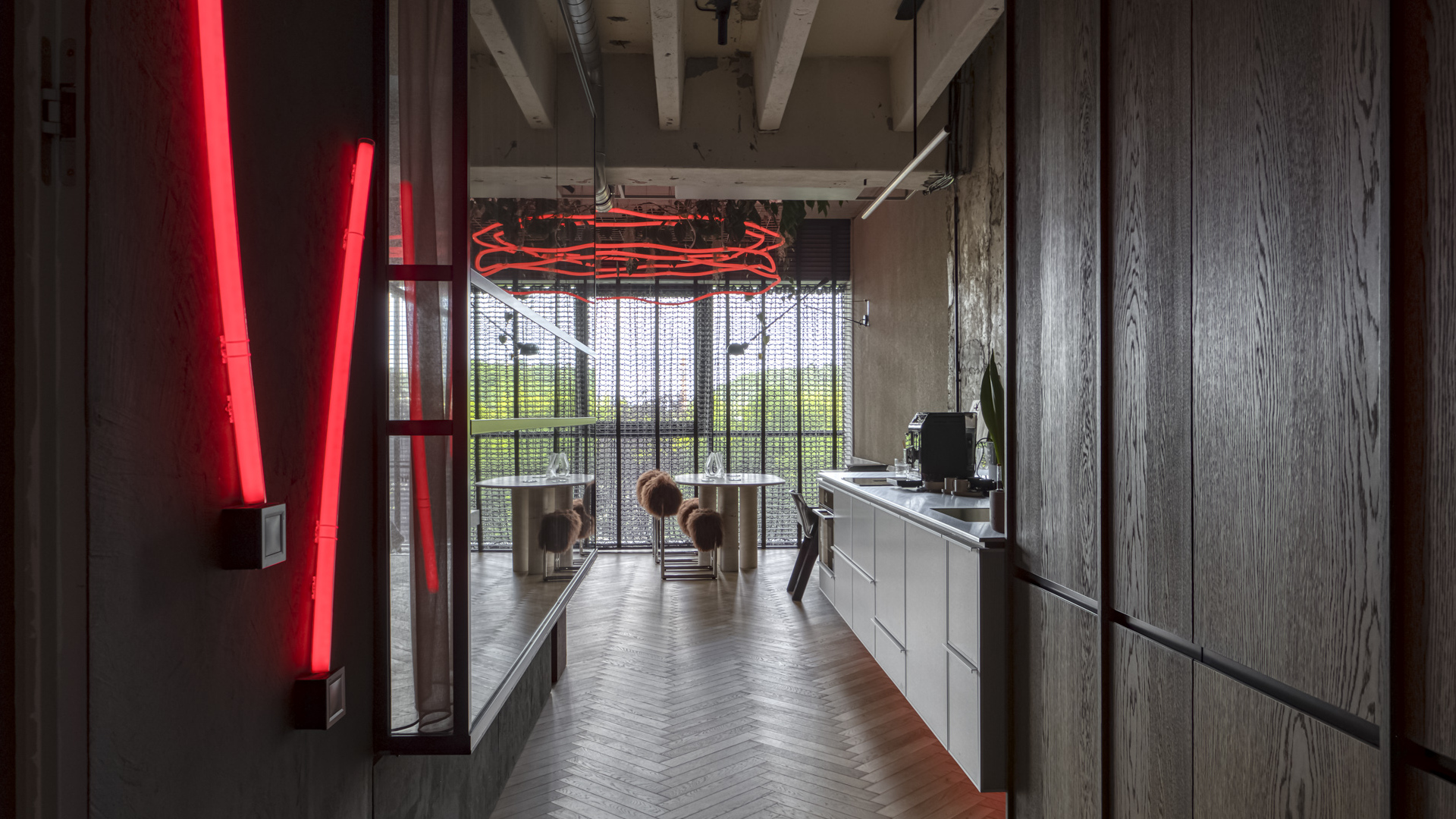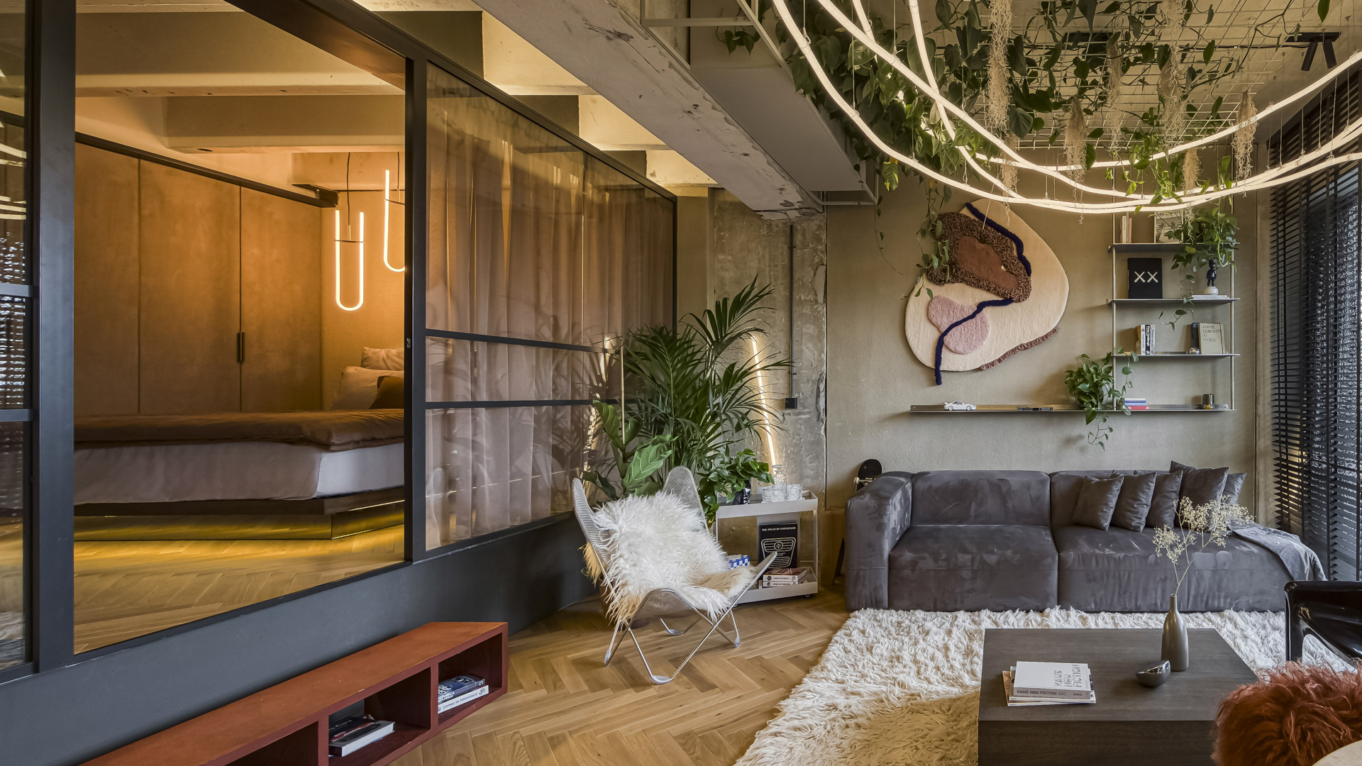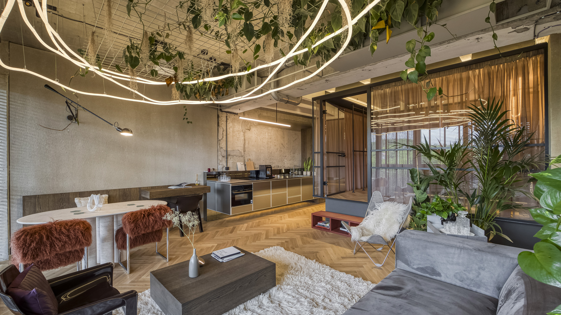 Dalším výrazným rysem loftu je variabilita při vytváření atmosféry. Sofistikované ambientní osvětlení umožňuje měnit charakter prostoru podle nálady či příležitosti. Útulný byt s osvětlením v hřejivých a teplých barvách se tak může v jednom okamžiku změnit v moderní a stylový interiér s futuristickým nádechem – rozdíl, který je patrný i ve dne, ale nejvíce vynikne v nočních hodinách. Celek doplňuje originální stropní konstrukce určená k pokrytí popínavou zelení, která přináší do interiéru svěží přírodní prvek a vytváří působivý kontrast k industriálnímu charakteru loftu. Byt se prodává kompletně vybavený.