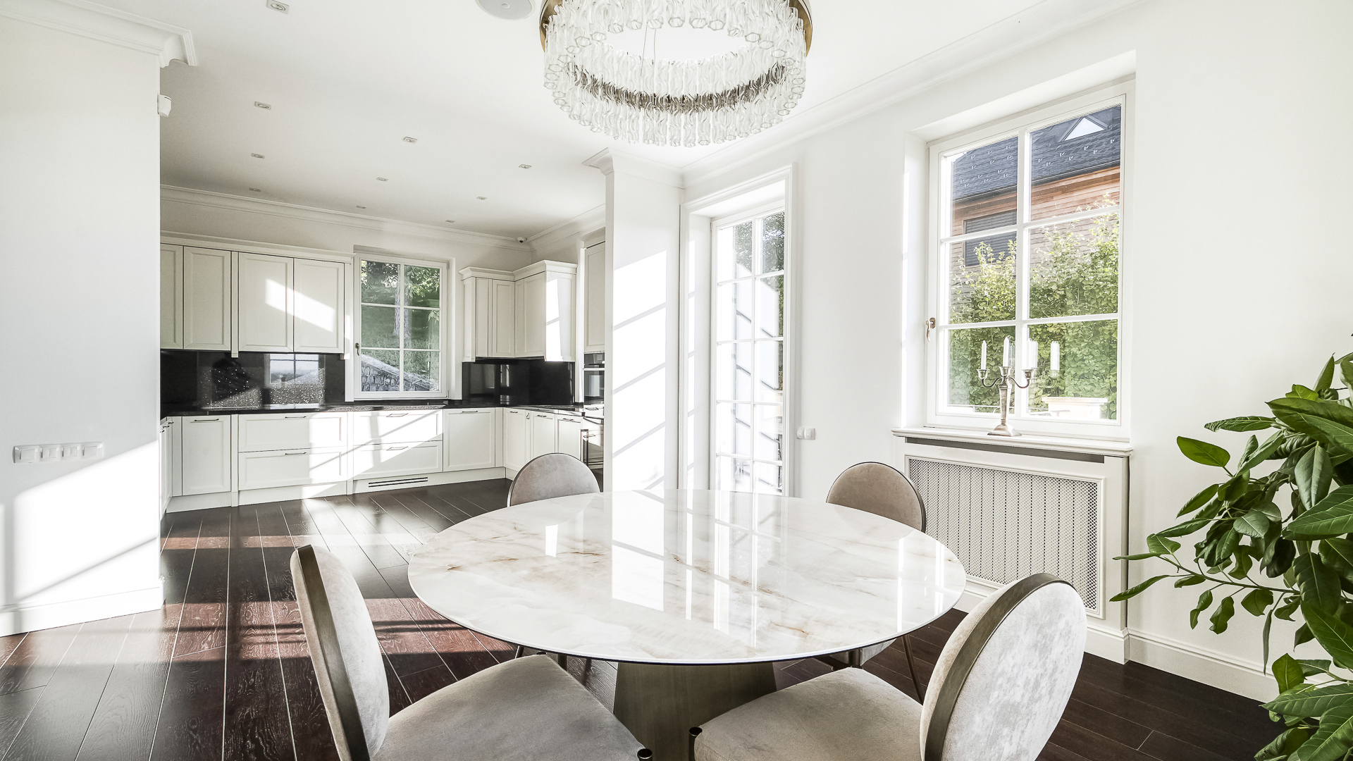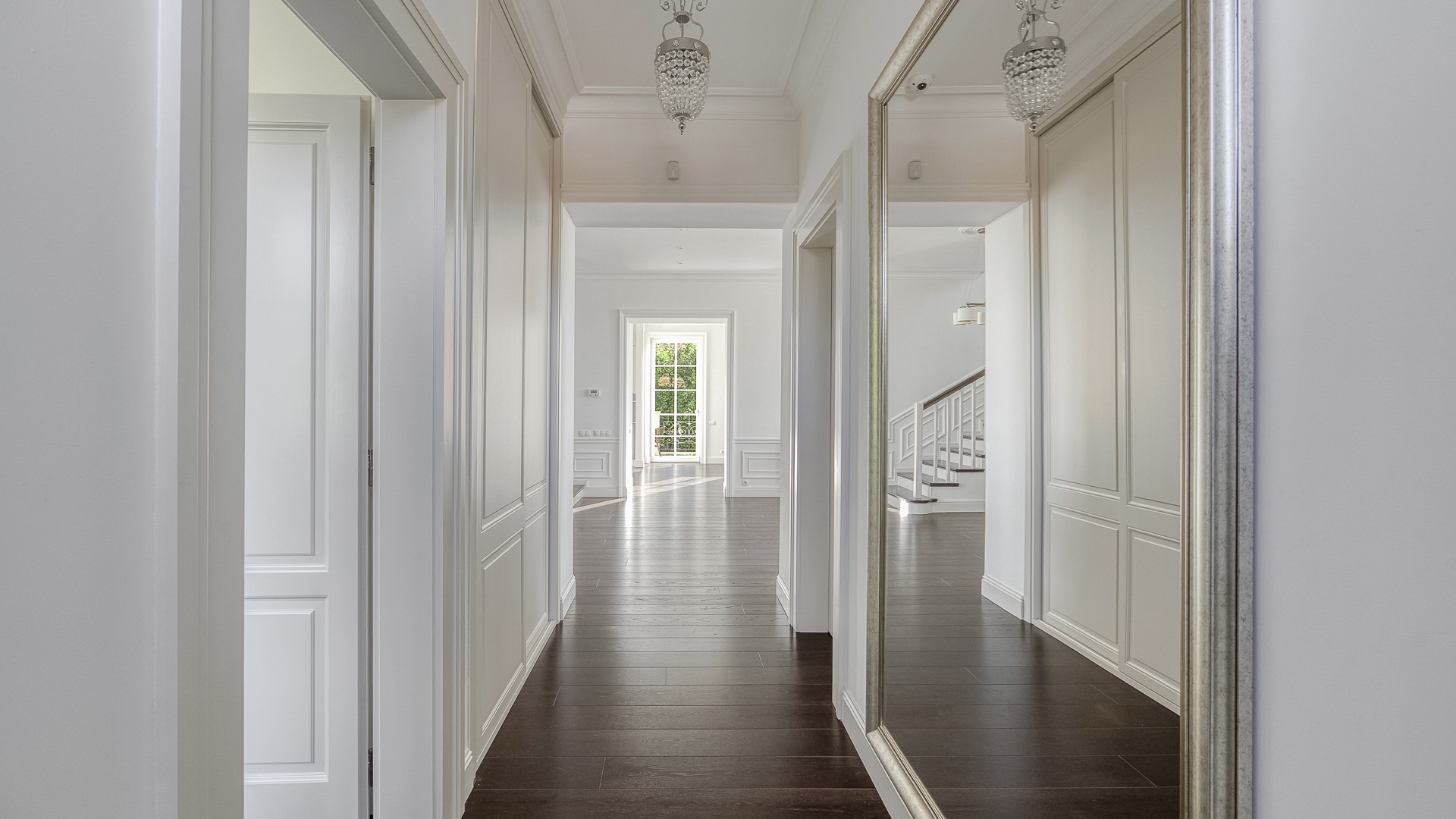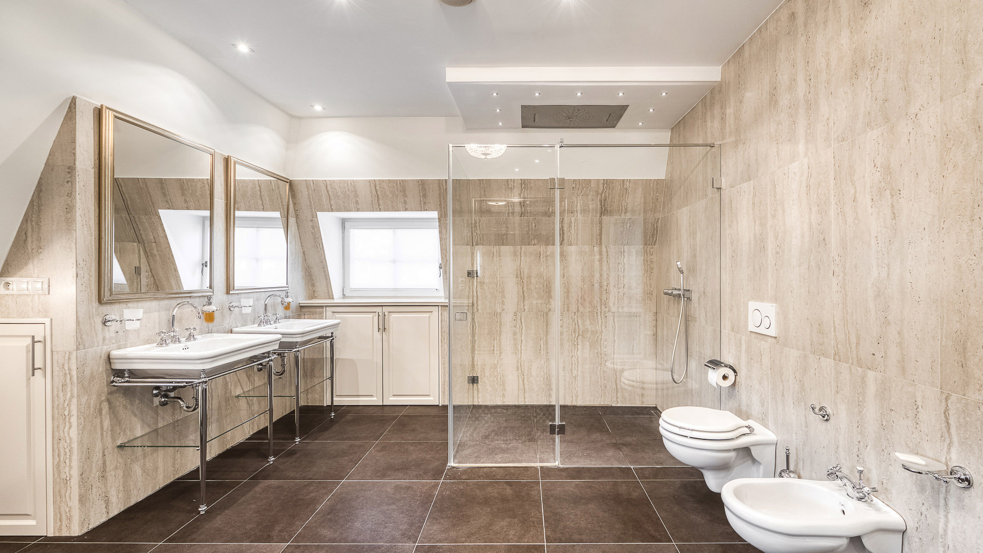 Interiér je zpracován s mimořádnou péčí a důrazem na kvalitu. Podlahy tvoří luxusní dřevěná krytina Kährs Dub Classic Nouveau Black mat, jejíž tmavý matný odstín dodává prostoru eleganci a hloubku. Kuchyň i vestavěný nábytek byly realizovány na míru renomovanou italskou společností Old Line, která se podílela i na vybavení šaten. Koupelny jsou osazeny exkluzivní sanitární technikou Devon & Devon, symbolem italského designu a precizního řemesla. Vila nabízí čtyři koupelny, prostornou terasu a balkon s výhledem do pečlivě udržované zahrady.