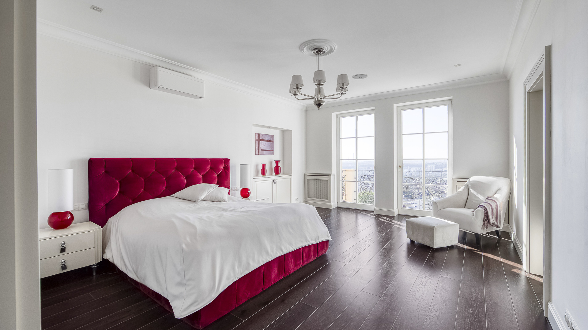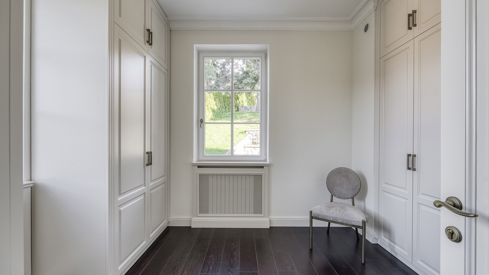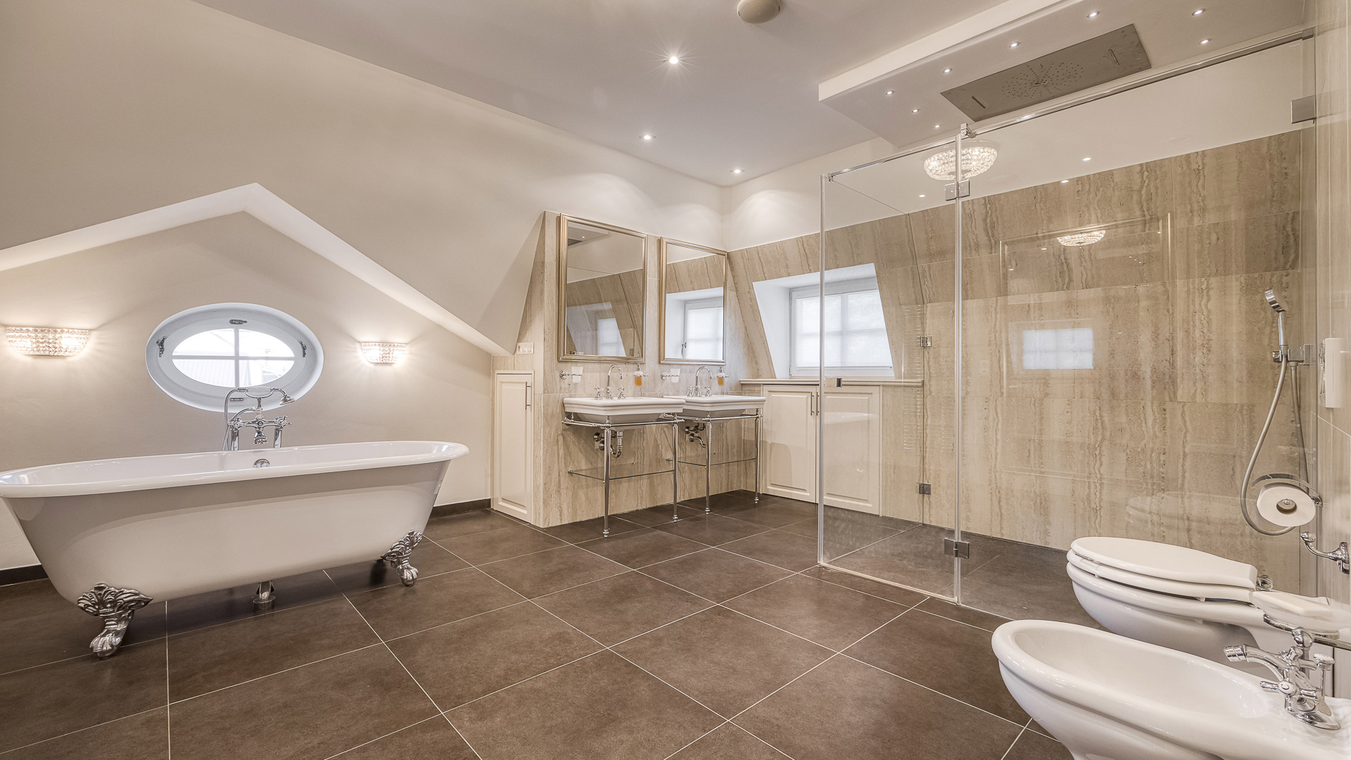 Interiér je zpracován s mimořádnou péčí a důrazem na kvalitu. Podlahy tvoří luxusní dřevěná krytina Kährs Dub Classic Nouveau Black mat, jejíž tmavý matný odstín dodává prostoru eleganci a hloubku. Kuchyň i vestavěný nábytek byly realizovány na míru renomovanou italskou společností Old Line, která se podílela i na vybavení šaten. Koupelny jsou osazeny exkluzivní sanitární technikou Devon & Devon, symbolem italského designu a precizního řemesla. Vila nabízí čtyři koupelny, prostornou terasu a balkon s výhledem do pečlivě udržované zahrady.
