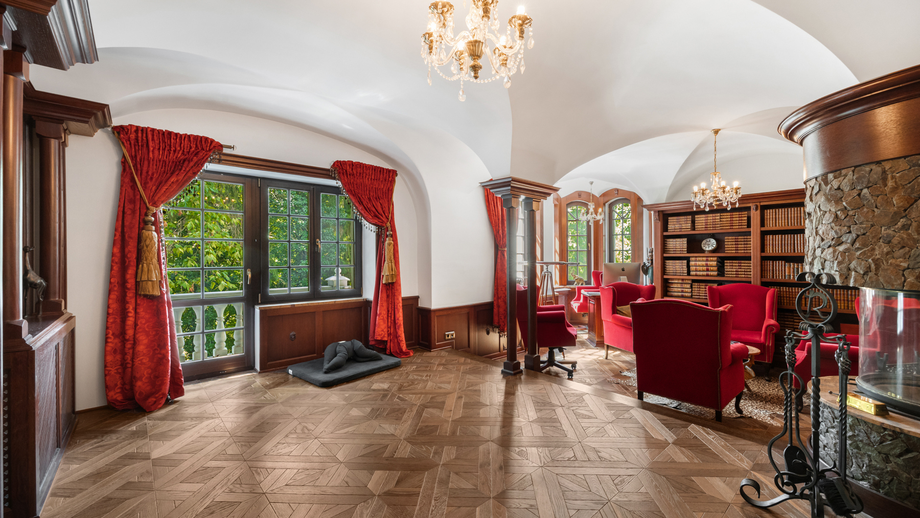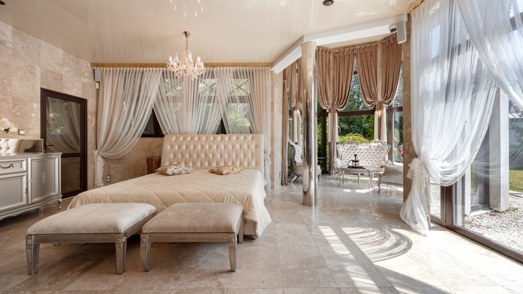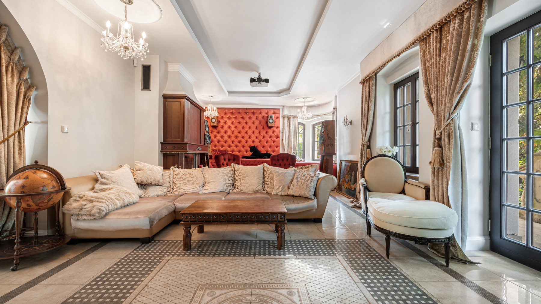 Interiér, podtržený renomovanou italskou značkou Versace Home Design, kombinuje prvky historické architektury (keramická dlažba, štukové stropy, tapety, krby a křišťálové lustry) s moderními technologiemi (klimatizace, podlahové vytápění, solární panely, smart home a audio systém a dřevěné).