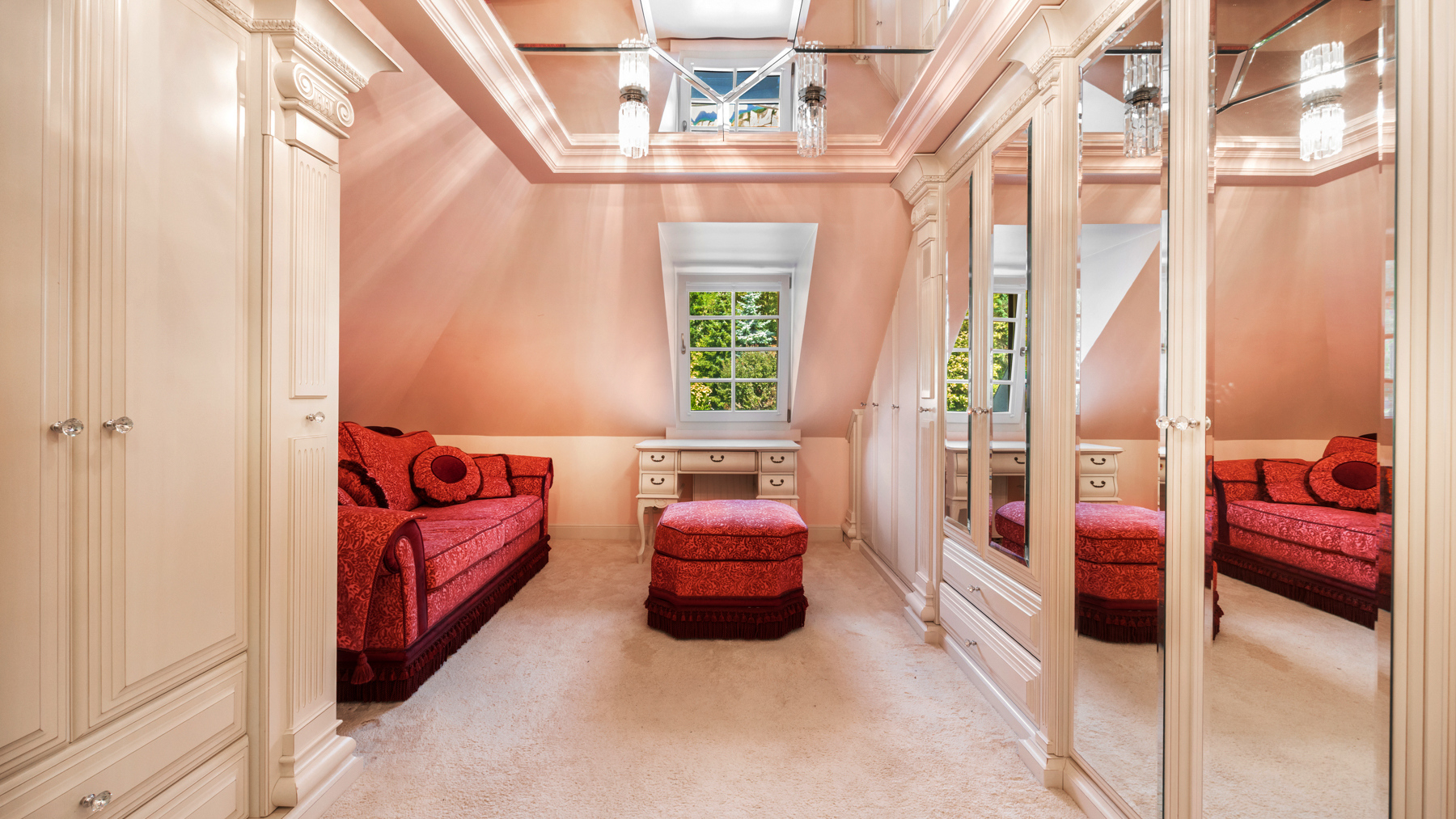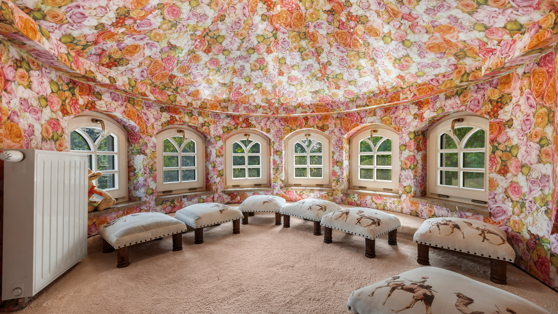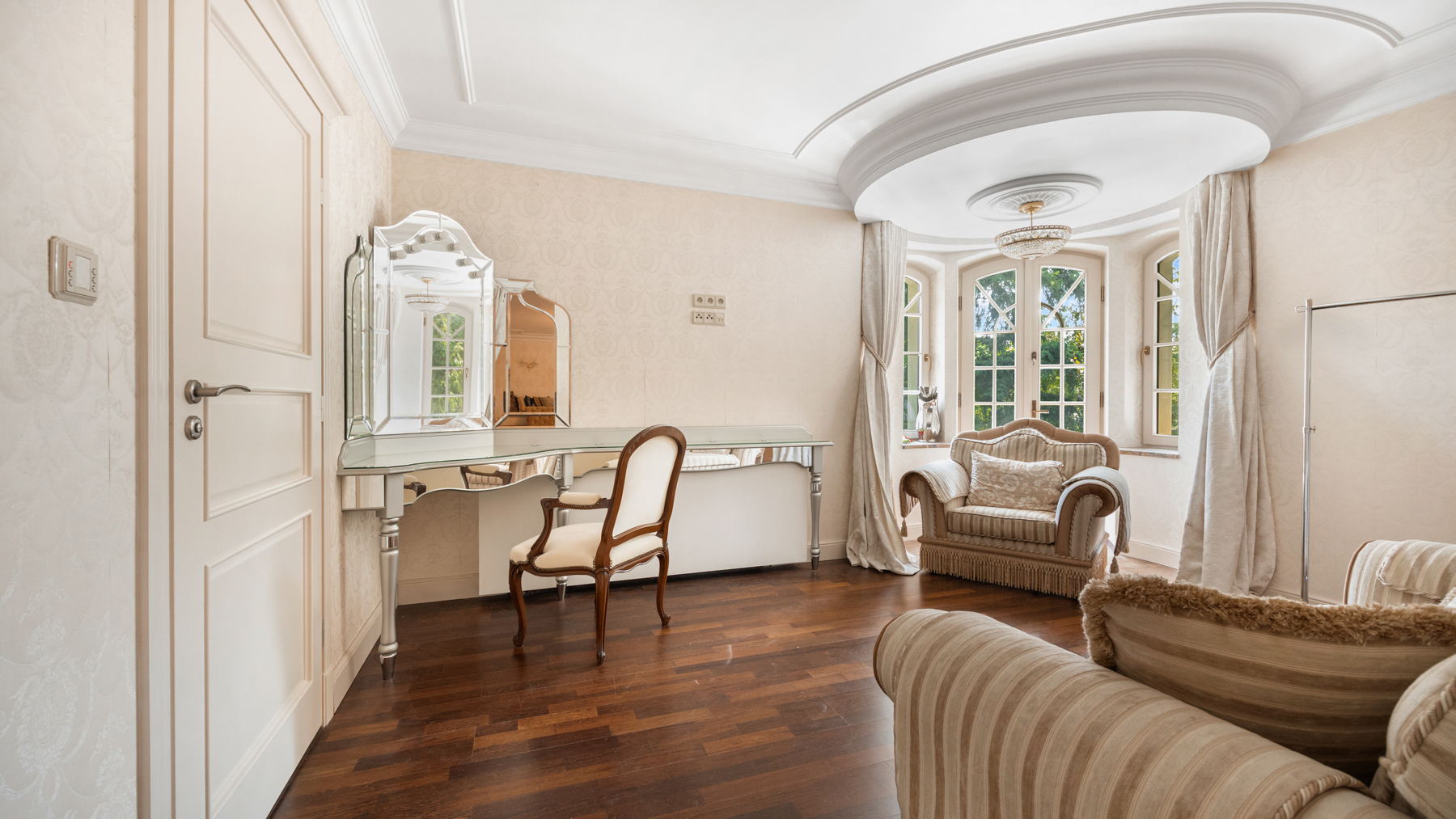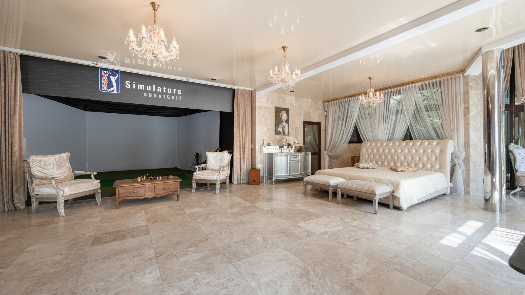 Interiér, podtržený renomovanou italskou značkou Versace Home Design, kombinuje prvky historické architektury (keramická dlažba, štukové stropy, tapety, krby a křišťálové lustry) s moderními technologiemi (klimatizace, podlahové vytápění, solární panely, smart home a audio systém a dřevěné).