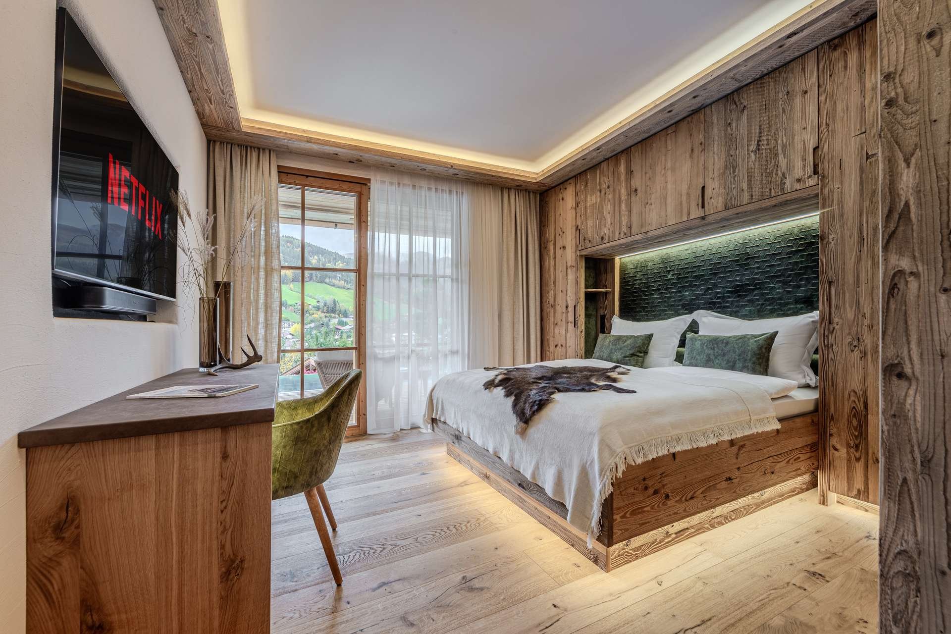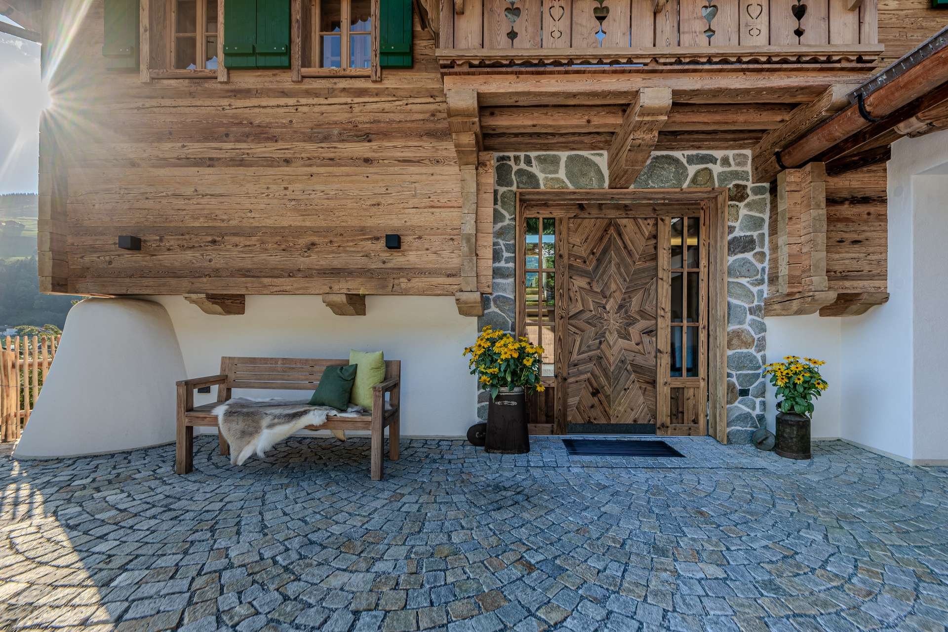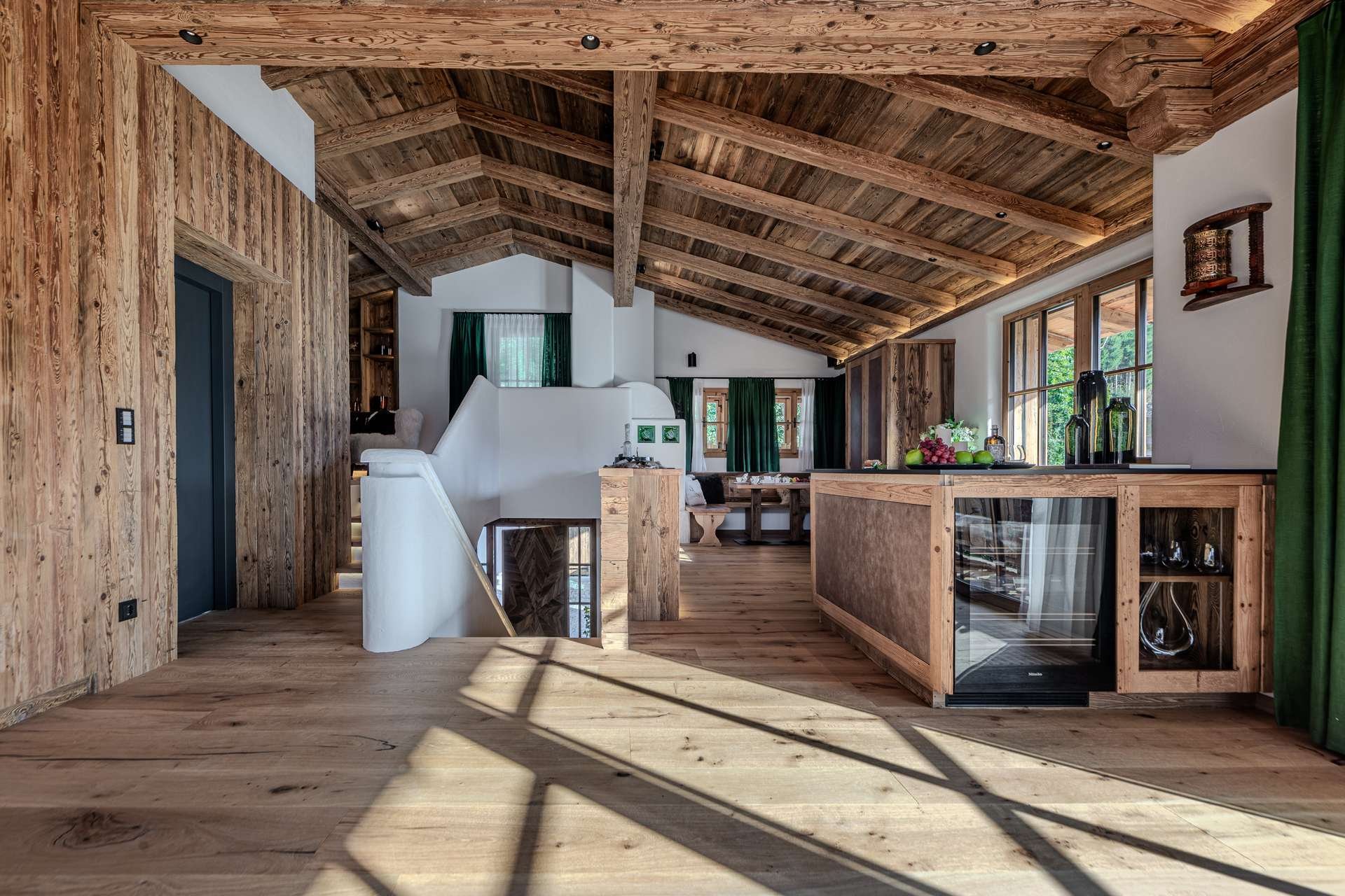 - Interiéry z autentických materiálů – přírodní kámen, masivní dřevo (Altholz)