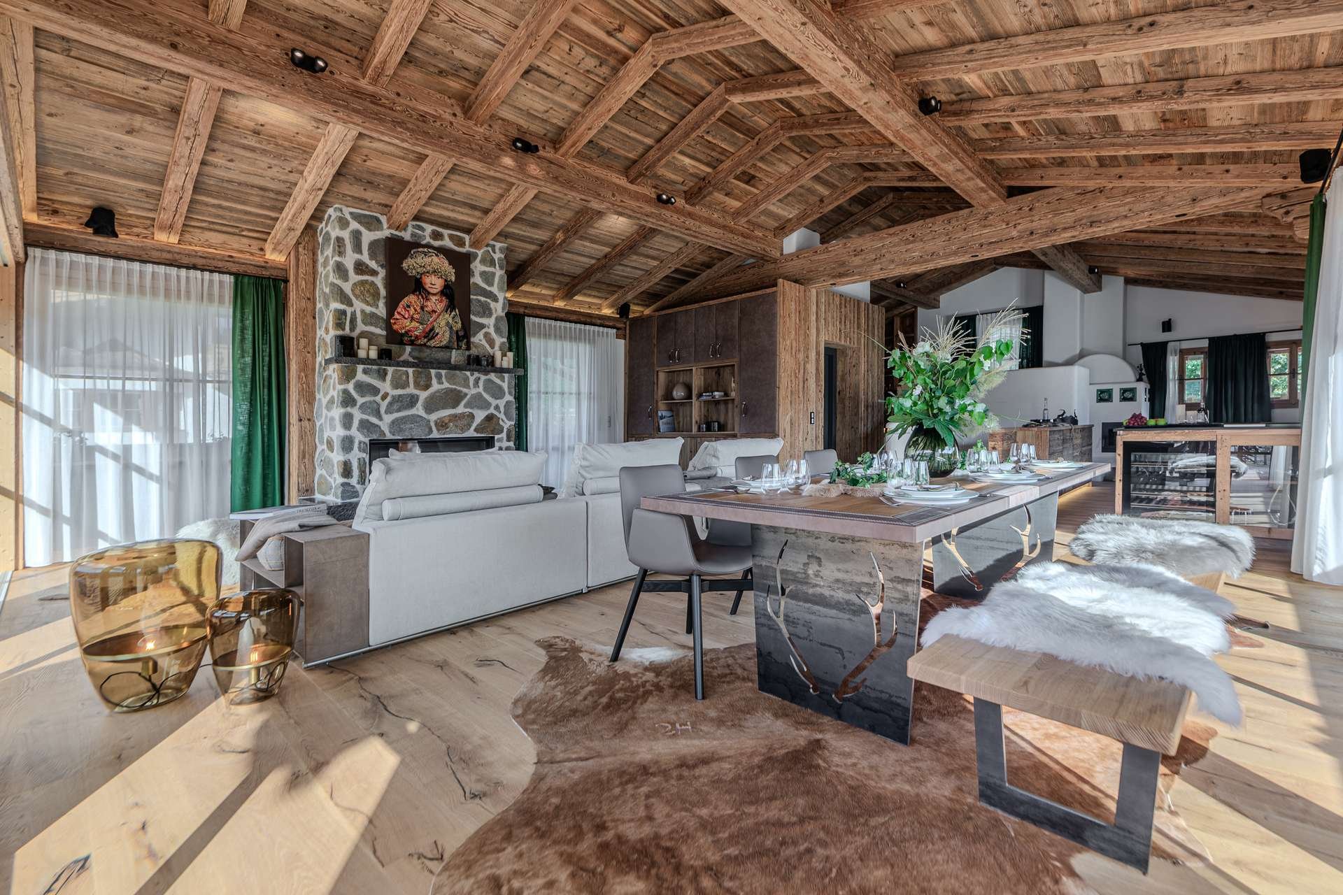 Užitná plocha 318 m² je rozdělena do několika podlaží s maximálním důrazem na souhru designu, komfortu a technologie. Interiéry jsou provedeny v harmonické kombinaci starého dřeva, přírodního kamene a velkoformátového skla, které vytvářejí pocit útulného luxusu a otevírají panoramatické výhledy na okolní vrcholky.