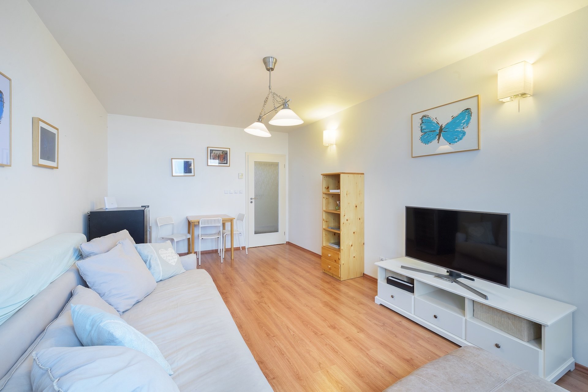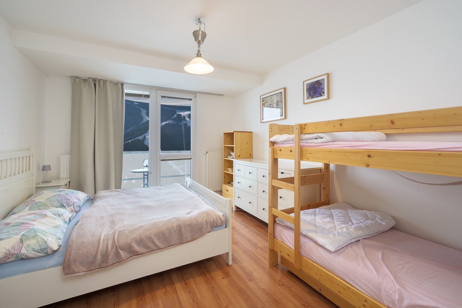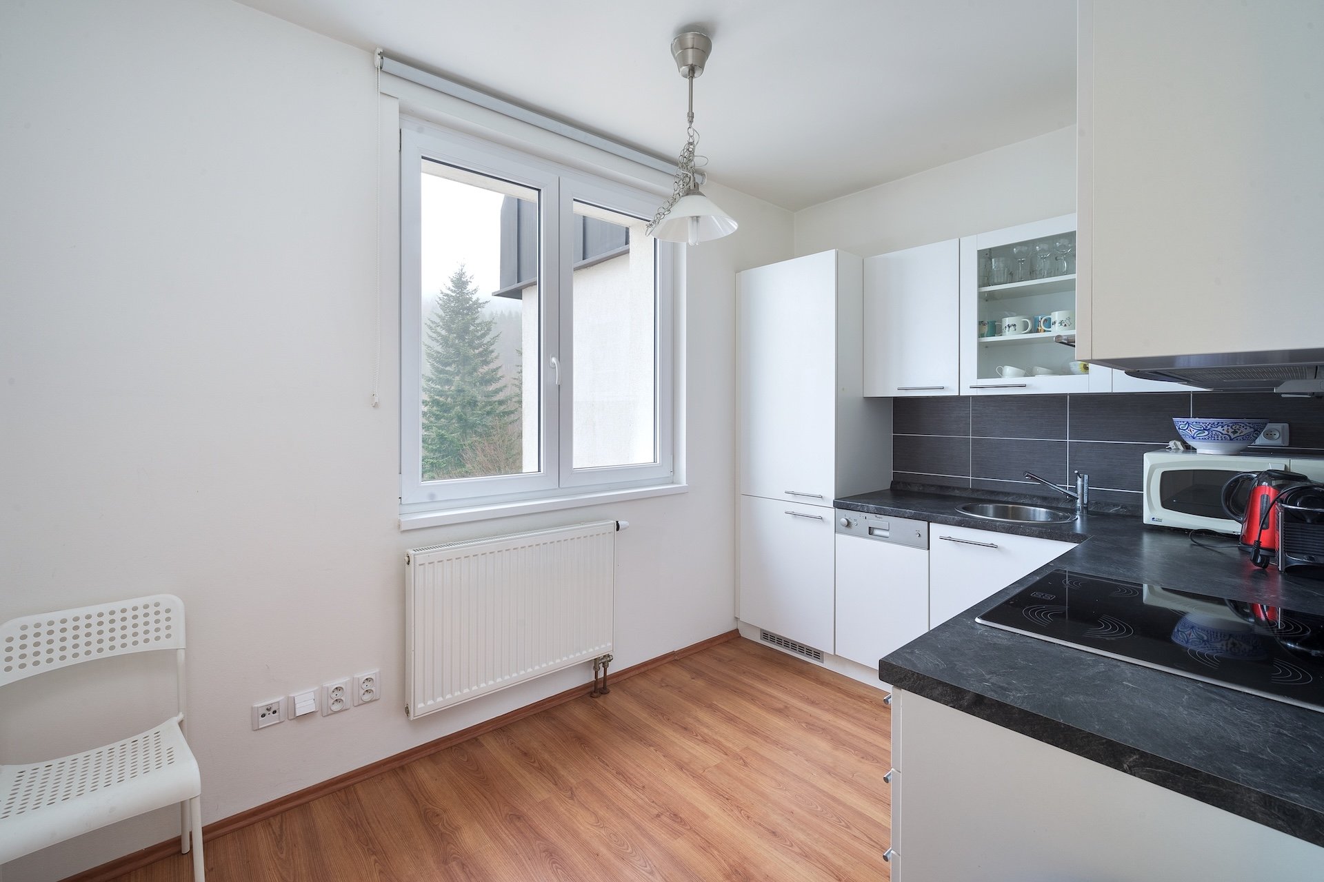 Byt zaujme především svou polohou ve vyšším podlaží, která nabízí otevřené výhledy na okolní horskou krajinu a pocit klidu i soukromí. Dispozice zahrnuje dva samostatné pokoje (obývací pokoj a samostatnou ložnici s balkonem), dále kuchyni s plně vybavenou kuchyňskou linkou, koupelnu s vanou a samostatnou toaletu.