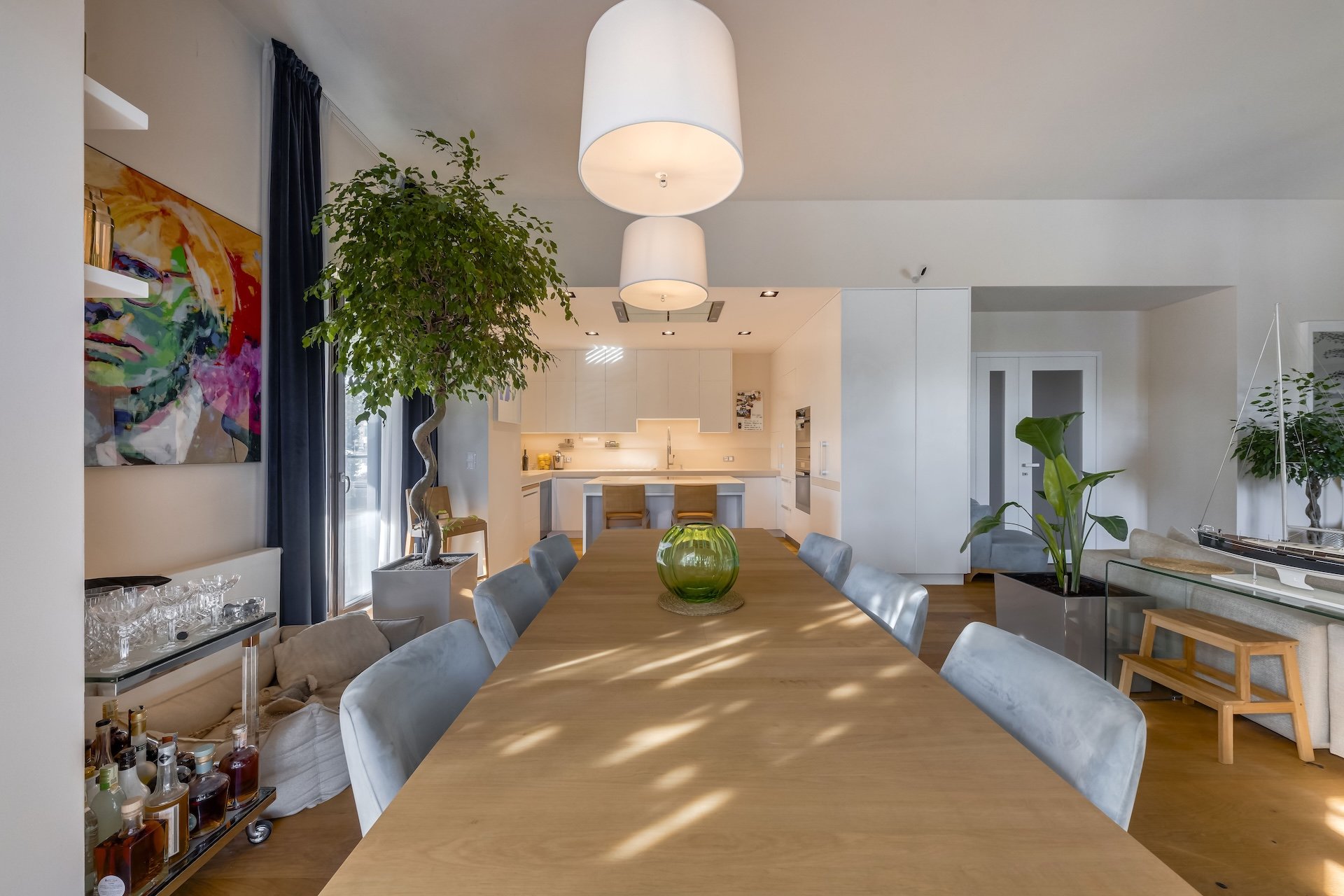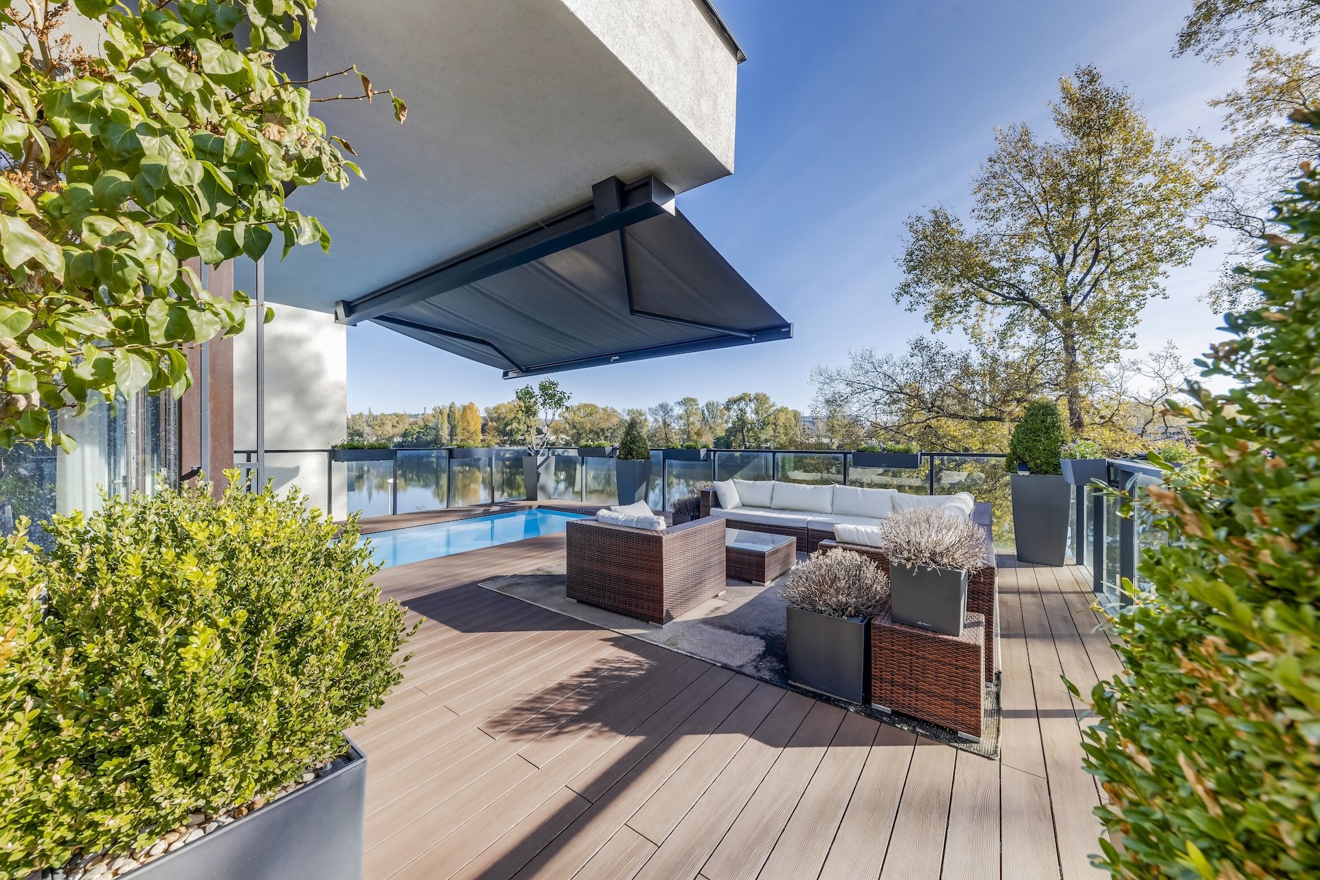 Sotheby's Int. Realty Czech Republic offers for rent an exclusive two-storey apartment in the Marina Island residence with a view of the Vltava River, a spacious terrace with a heated pool and a perfect orientation ensuring sunlight throughout the day. This elegant 6 bedroom townhouse style apartment combines the benefits of living in a family home and modern city living. It is located on the first floor of a recently completed residential project with a reception and fitness area, all in the heart of the Holešovice peninsula with a marina.