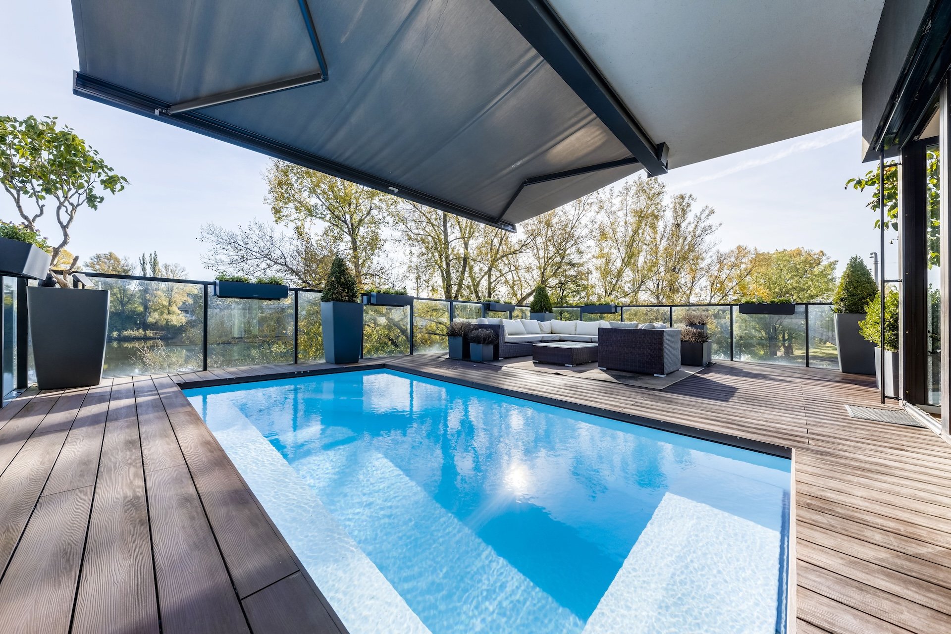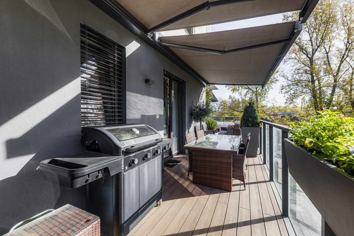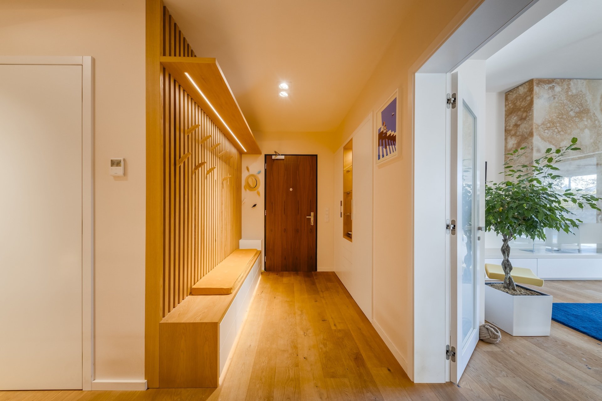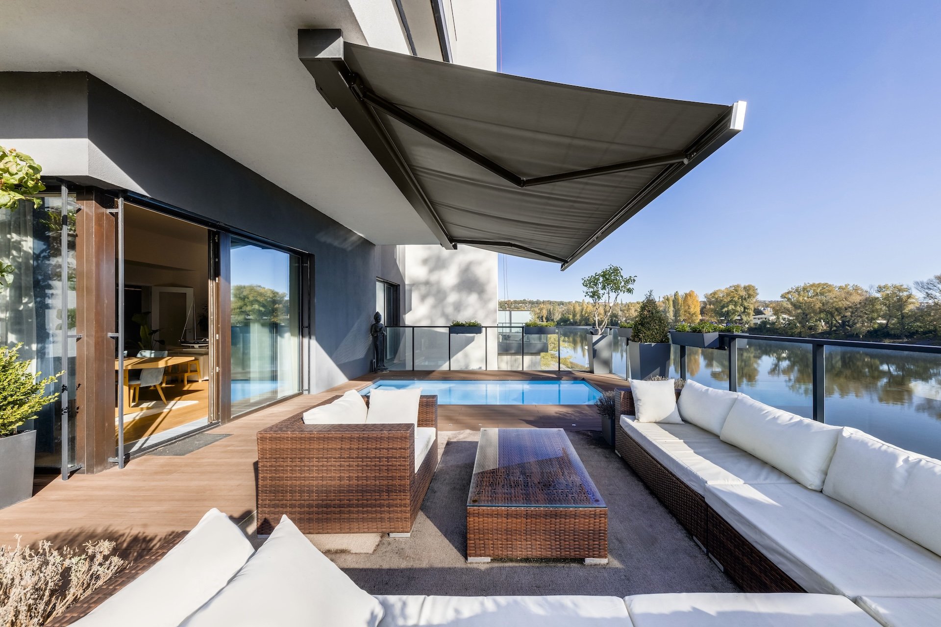 The first floor apartment has an open plan living room with fireplace, a bespoke kitchen with Miele appliances and space for a dining area on its eastern side. This room is not only very bright thanks to the south-east orientation and large windows, but also connected to the 79 sqm terrace with outdoor seating and dining table, barbecue, river view and heated saltwater pool with counter-current. The pool can be fully covered thanks to an electric awning. The location of the apartment within the residence ensures complete privacy from the neighbouring apartments on the terrace.