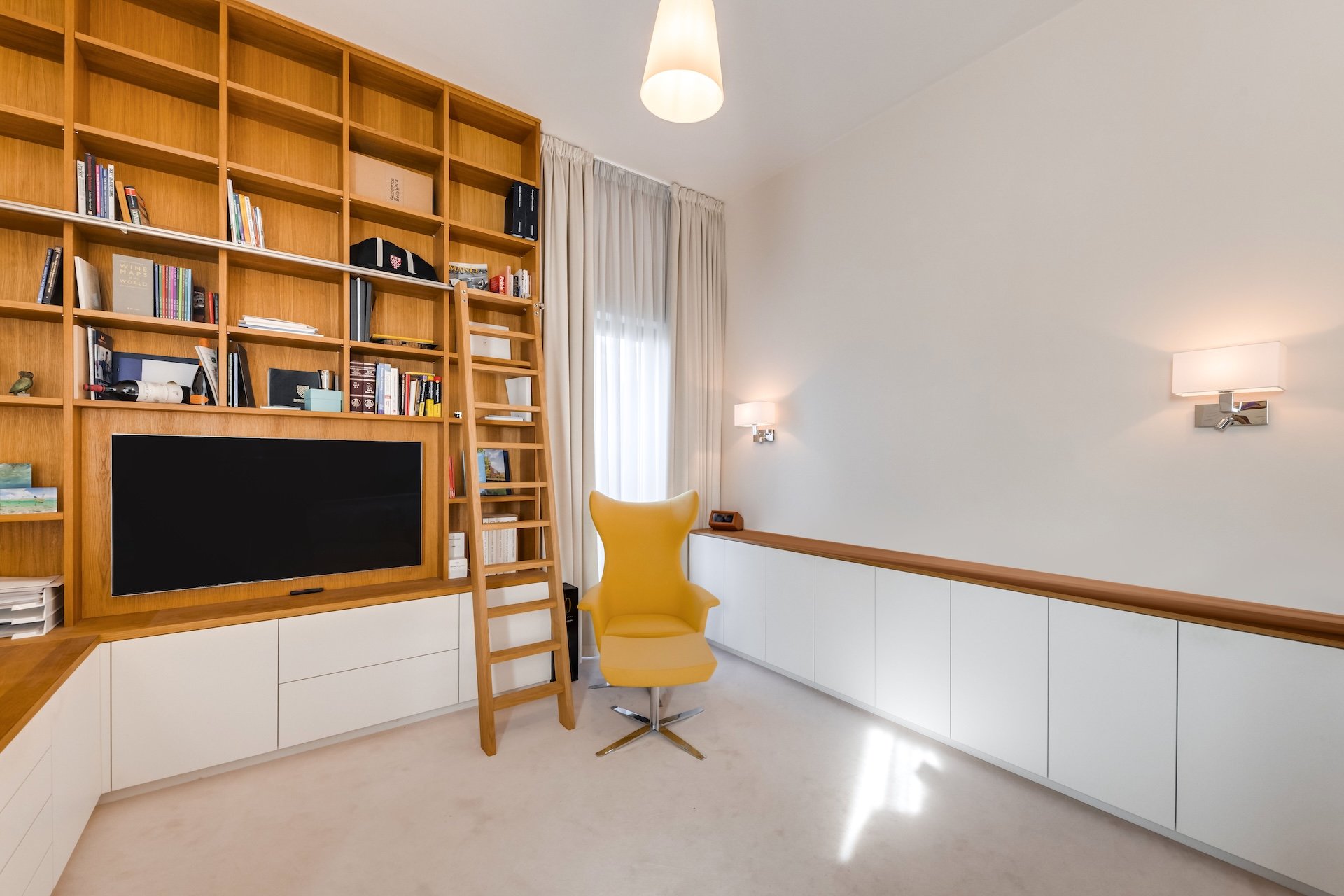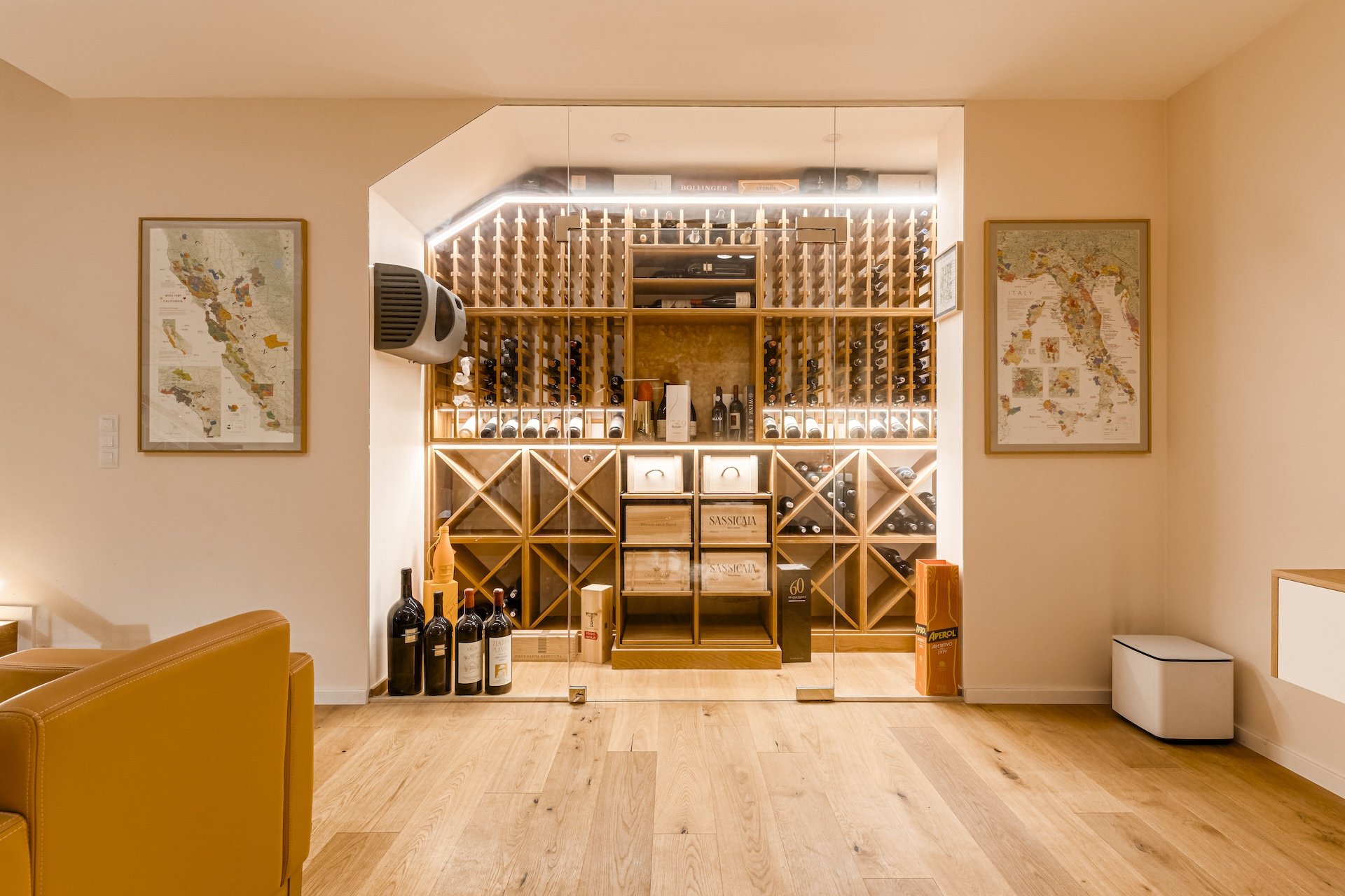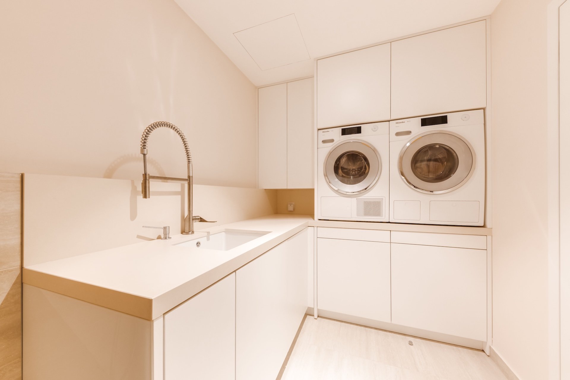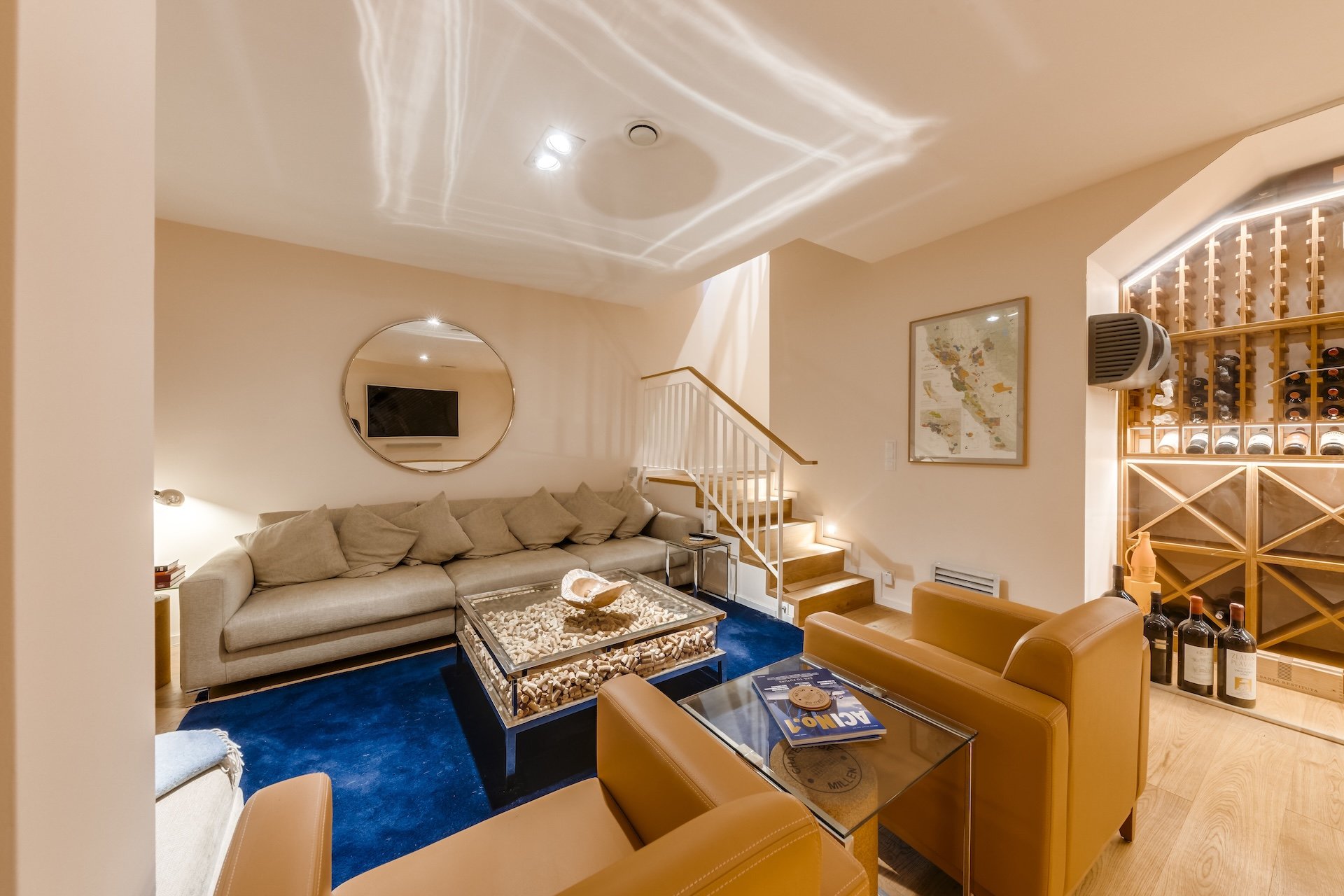 A flight of stairs leads to the lower floor of the apartment, the main space of which is designed as a lounge and TV room with a bespoke tempered British oak walk-in wine cellar. There is also a fully equipped laundry room with Miele washing machine and tumble dryer and a lounge with built-in storage and Liebherr freezer. There is direct access to the private enclosed 2-car garage via the lower level hall.