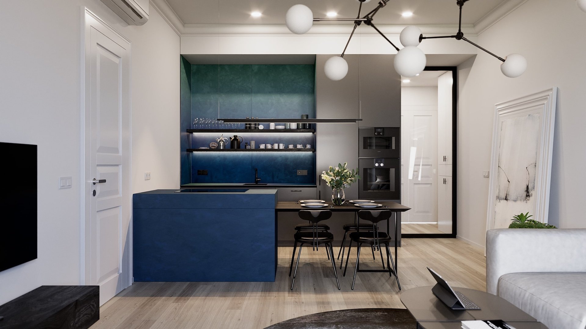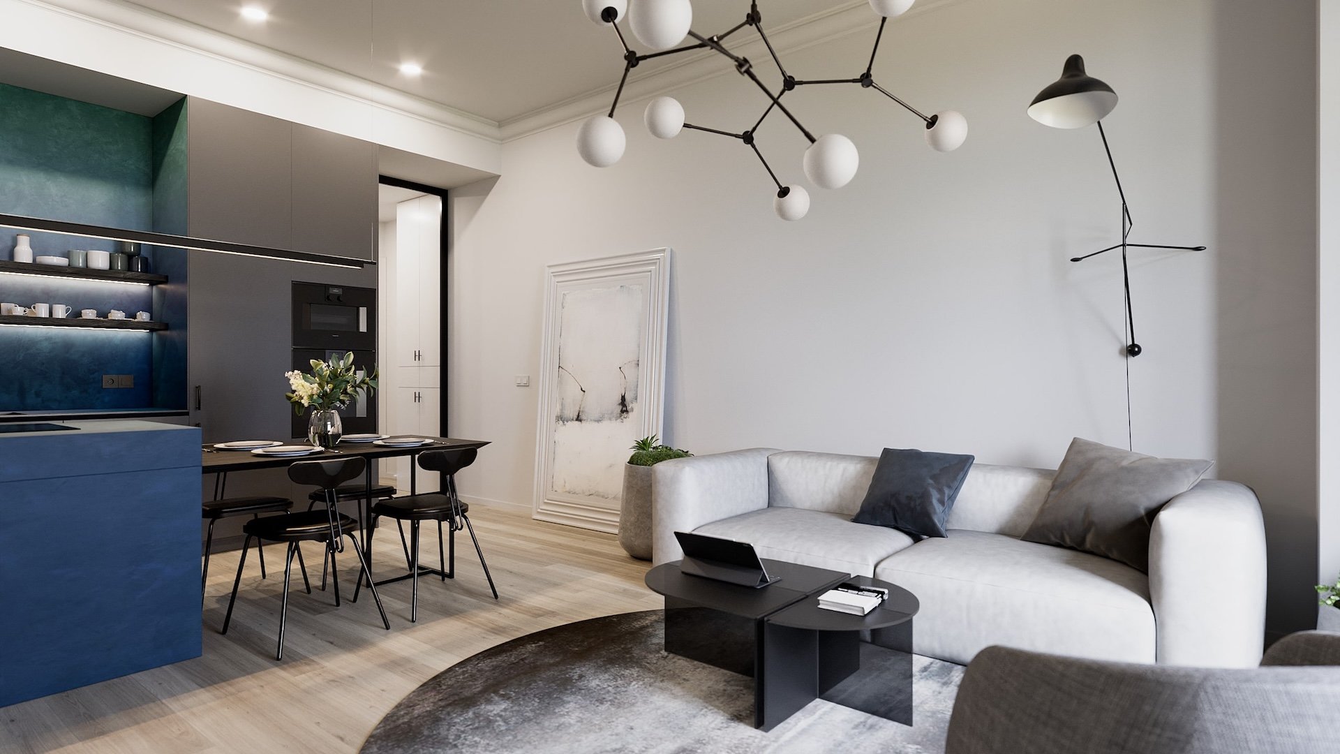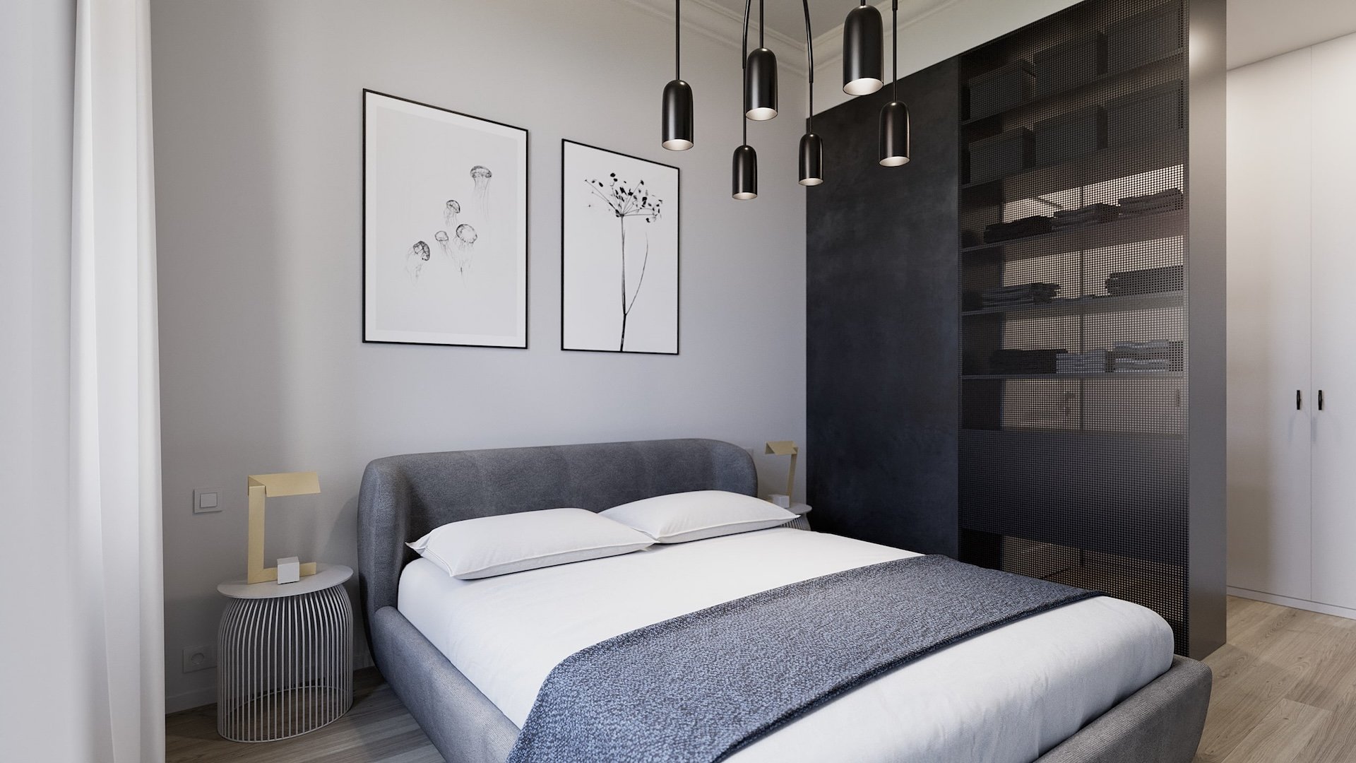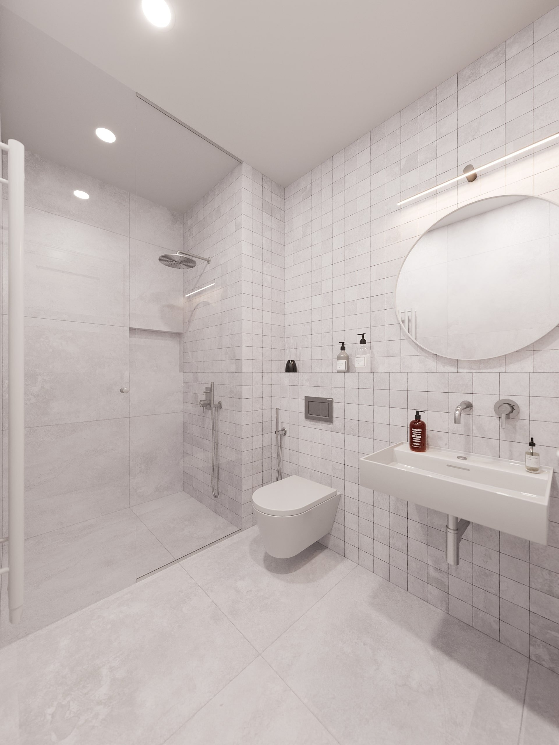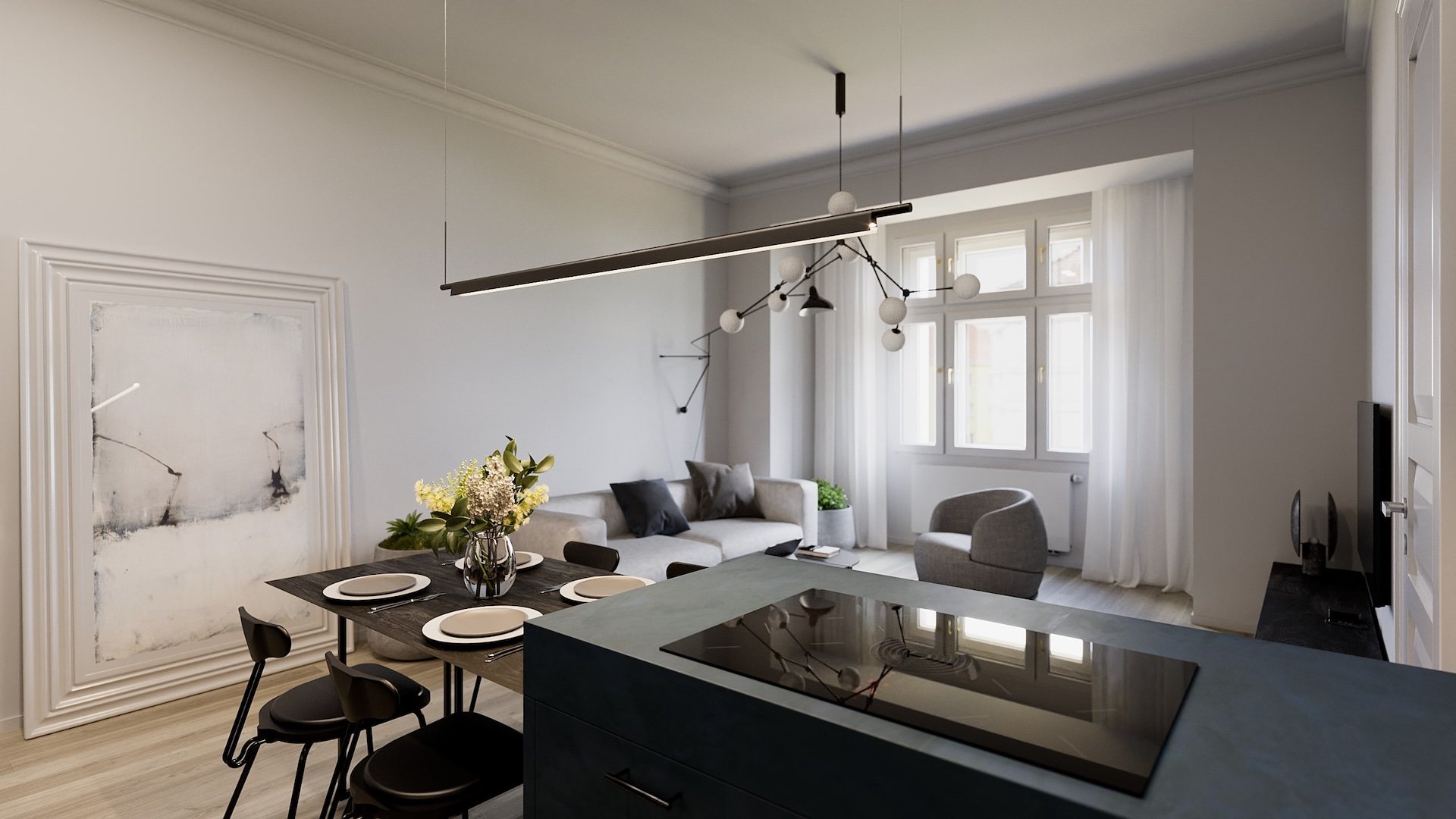 The interior is designed with an emphasis on functionality and timeless style, with the possibility of individual fine-tuning of the final elements. Thanks to its location on the upper floor and orientation to a quiet part of the house, the apartment offers a pleasant atmosphere and plenty of natural light.