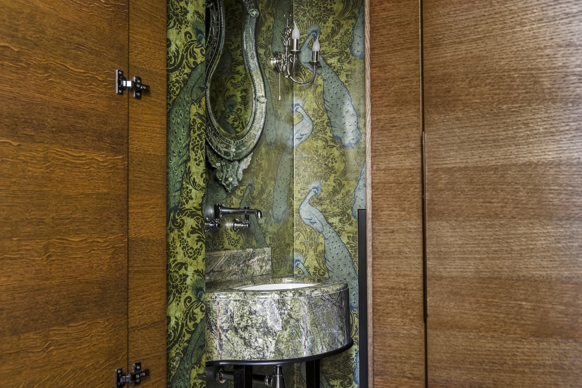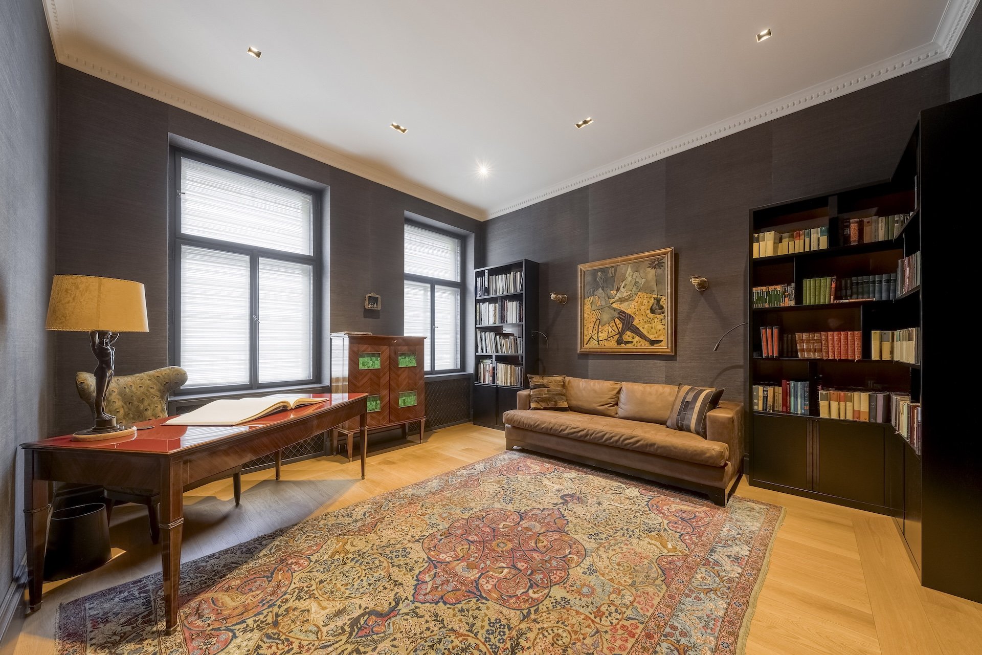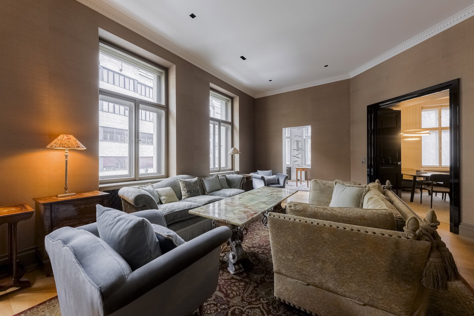 The apartment will captivate with its elegance and preserved historical elements with a unique genius loci. The floors are solid parquet, carpets, silk, hand-woven wallpaper on the walls, marble or stone in the bathrooms. In the entrance hall there are custom built-in wardrobes and a guest toilet. In the left wing there is a bathroom with a bathtub, then the first bedroom conceived as a children's room. There is also a spacious study, which is connected to the bedroom.