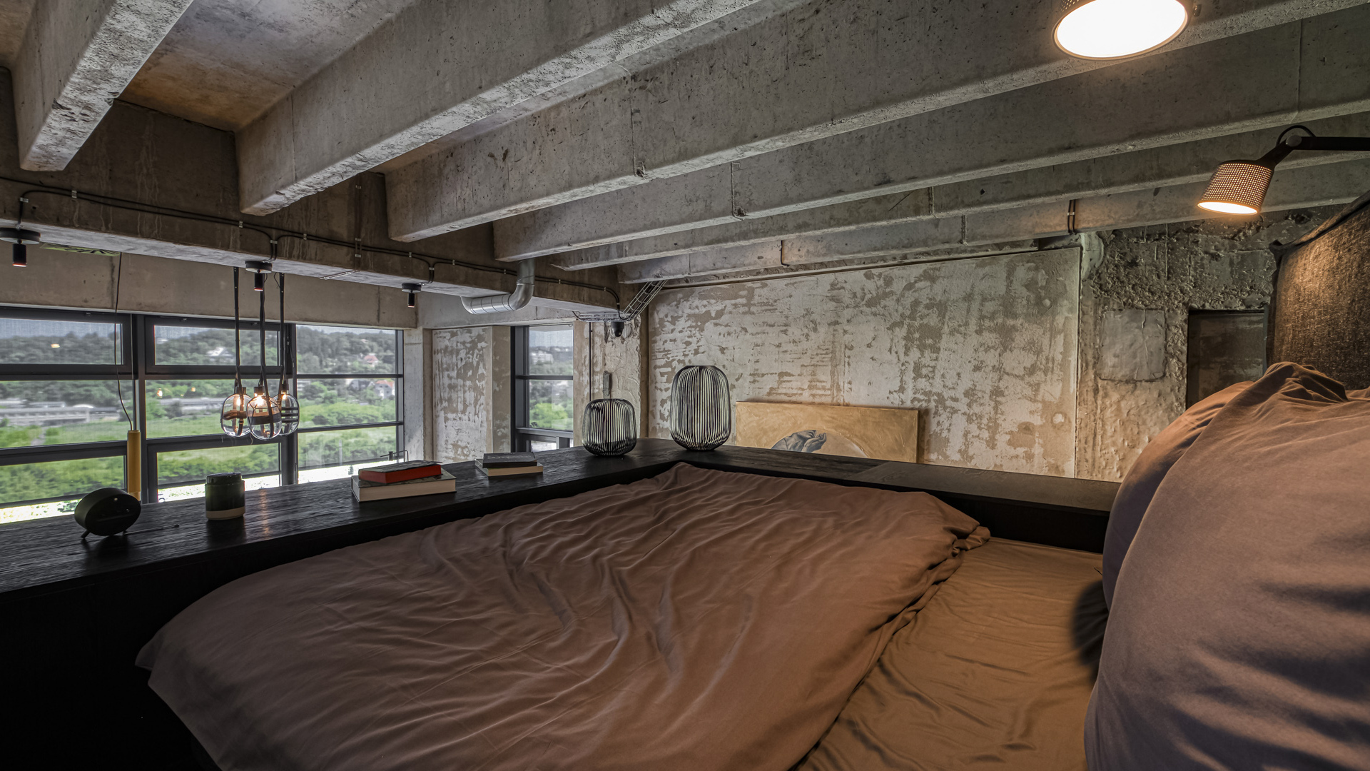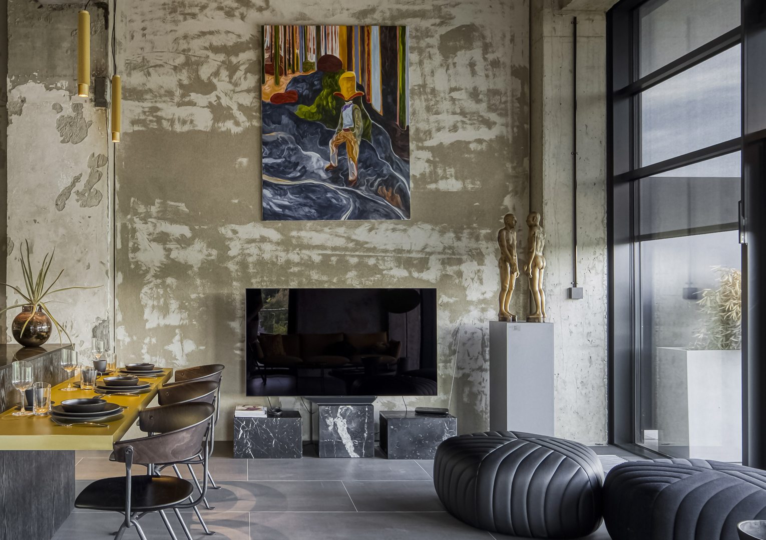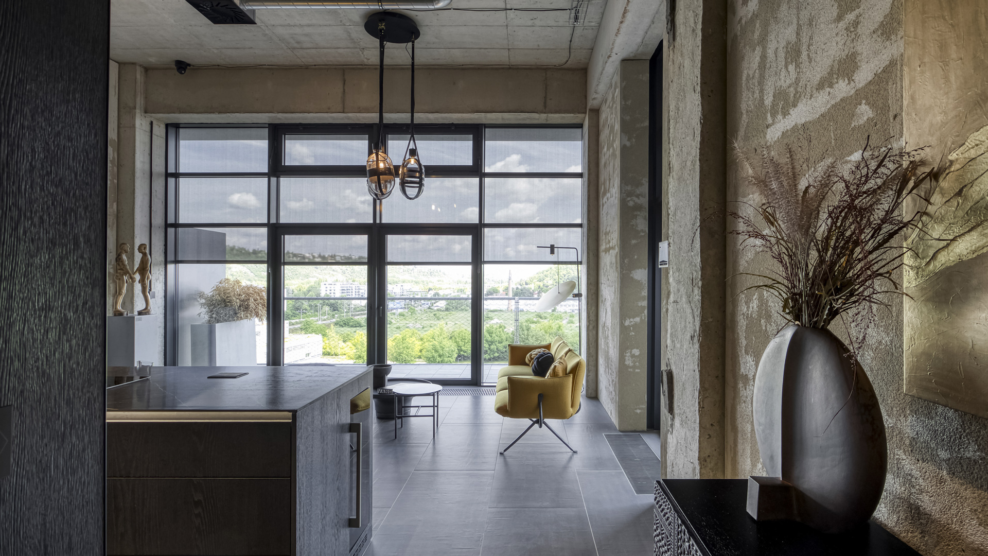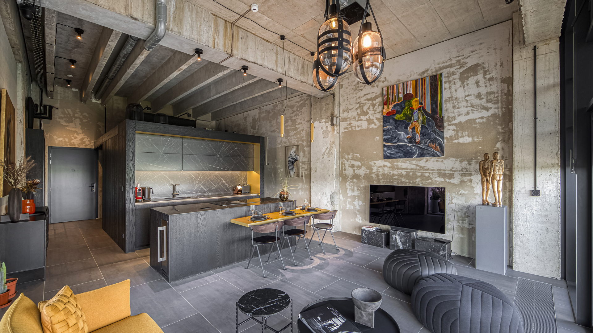 The interior, designed by the prestigious architectural studio OOOX, equally emphasizes simplicity and functionality while preserving the raw atmosphere of the original building. The main living area retains exposed concrete on the walls and ceilings, visible ceiling beams typical of industrial structures, and exposed ductwork. The raw concrete tones are echoed throughout the rest of the interior, where black, grey, and anthracite shades dominate, accented by touches of gold, brass, and yellow in decorative elements, lighting, and furniture. Thanks to large-format windows covering an entire wall, the loft is flooded with natural light, while the high ceilings provide an exceptional sense of openness and space.