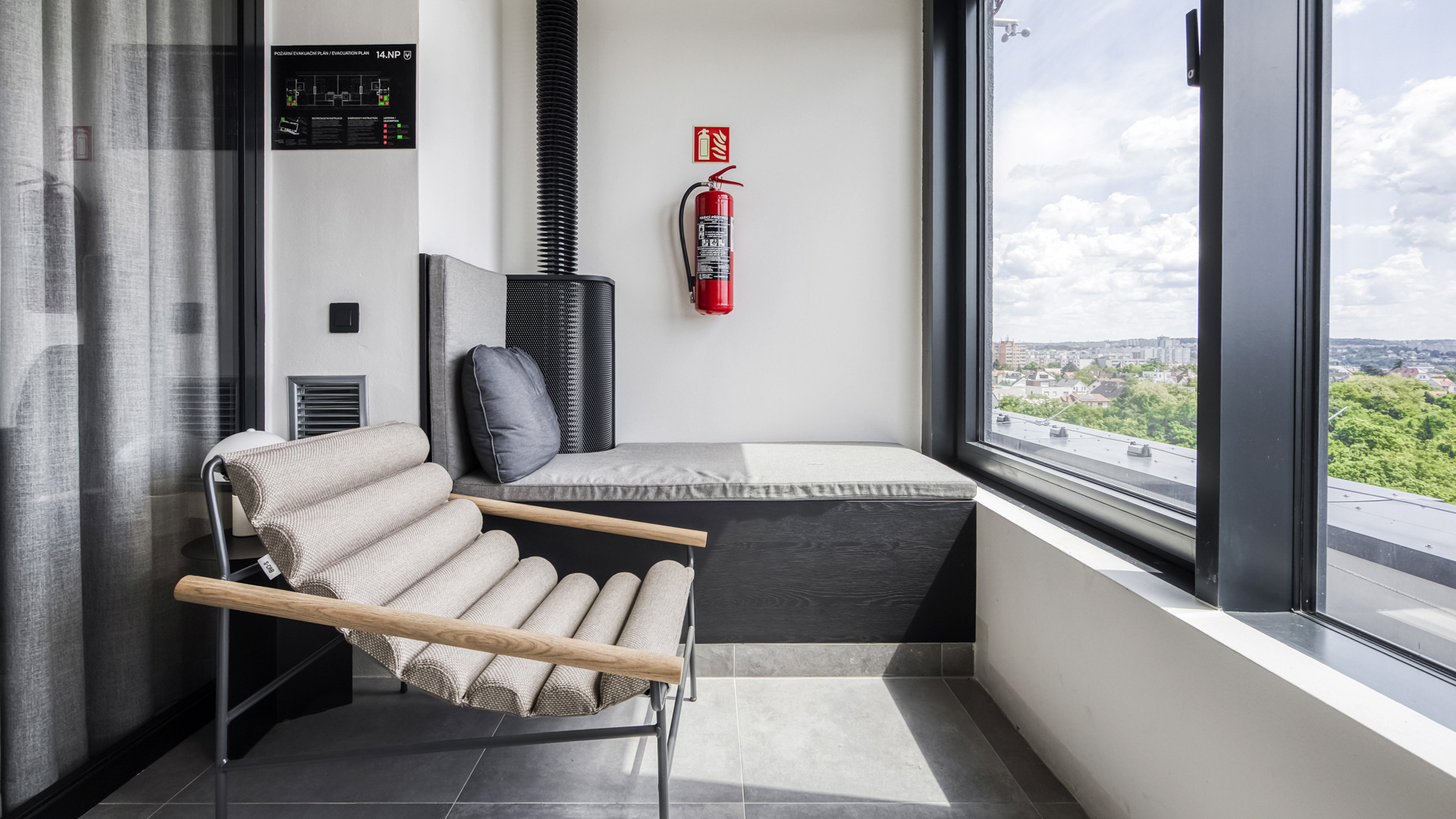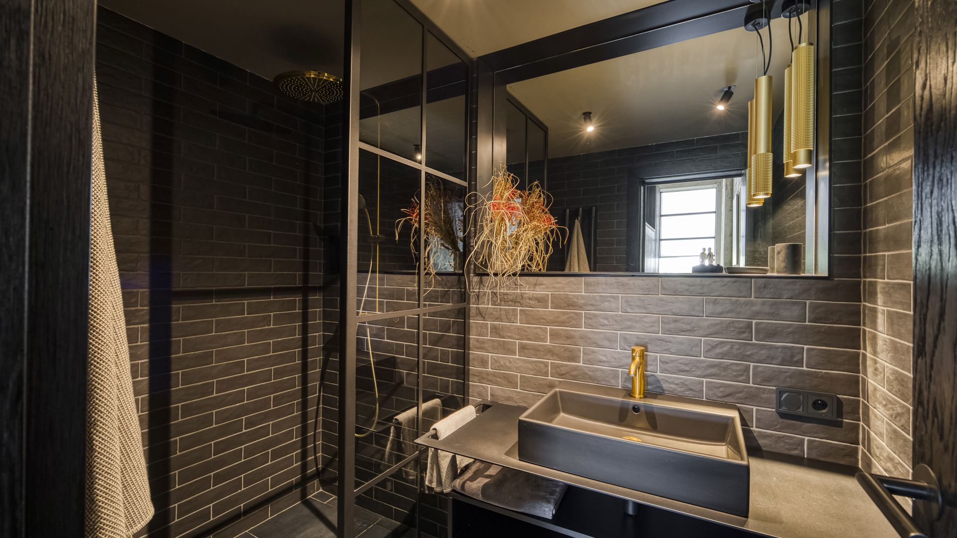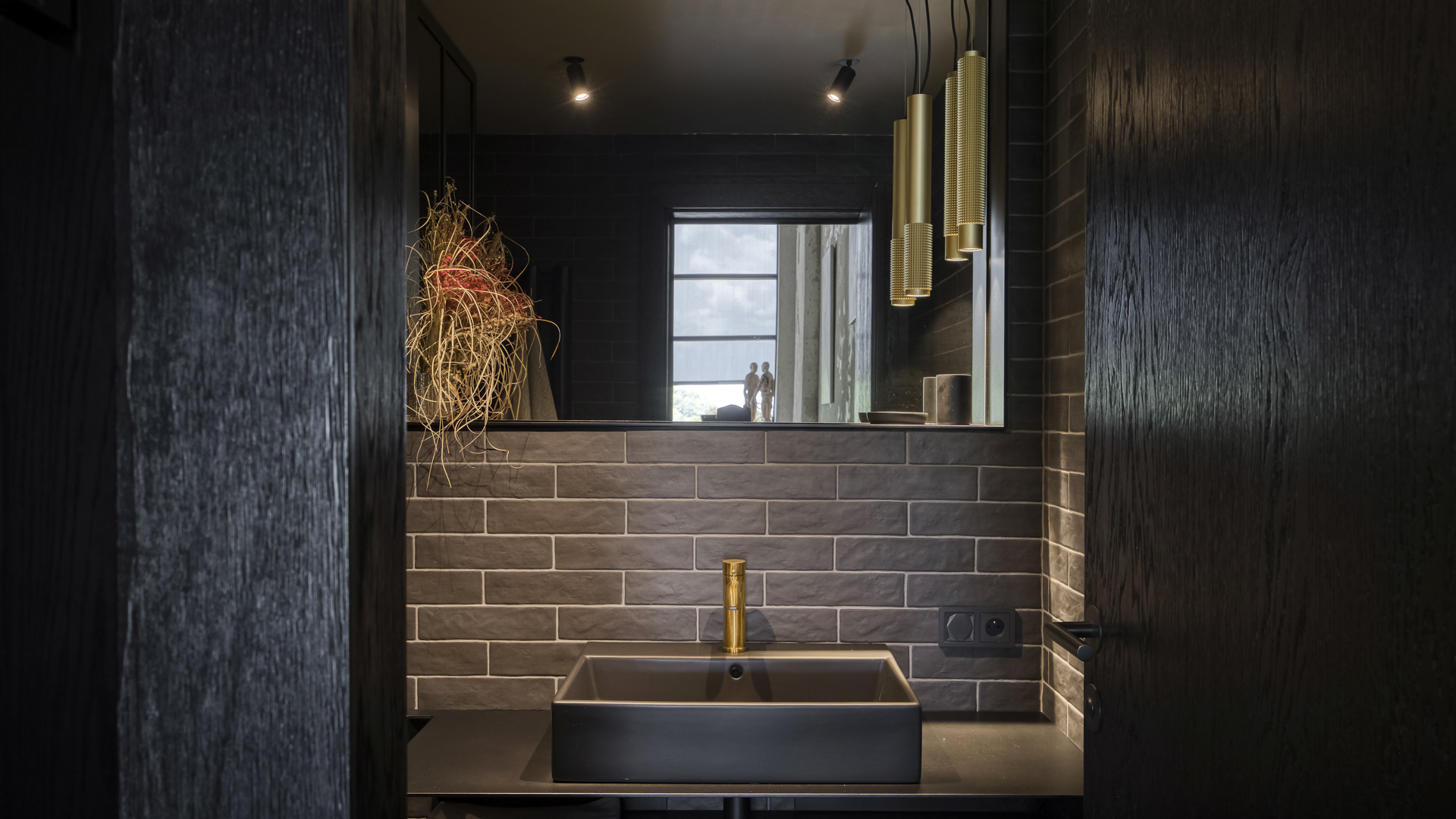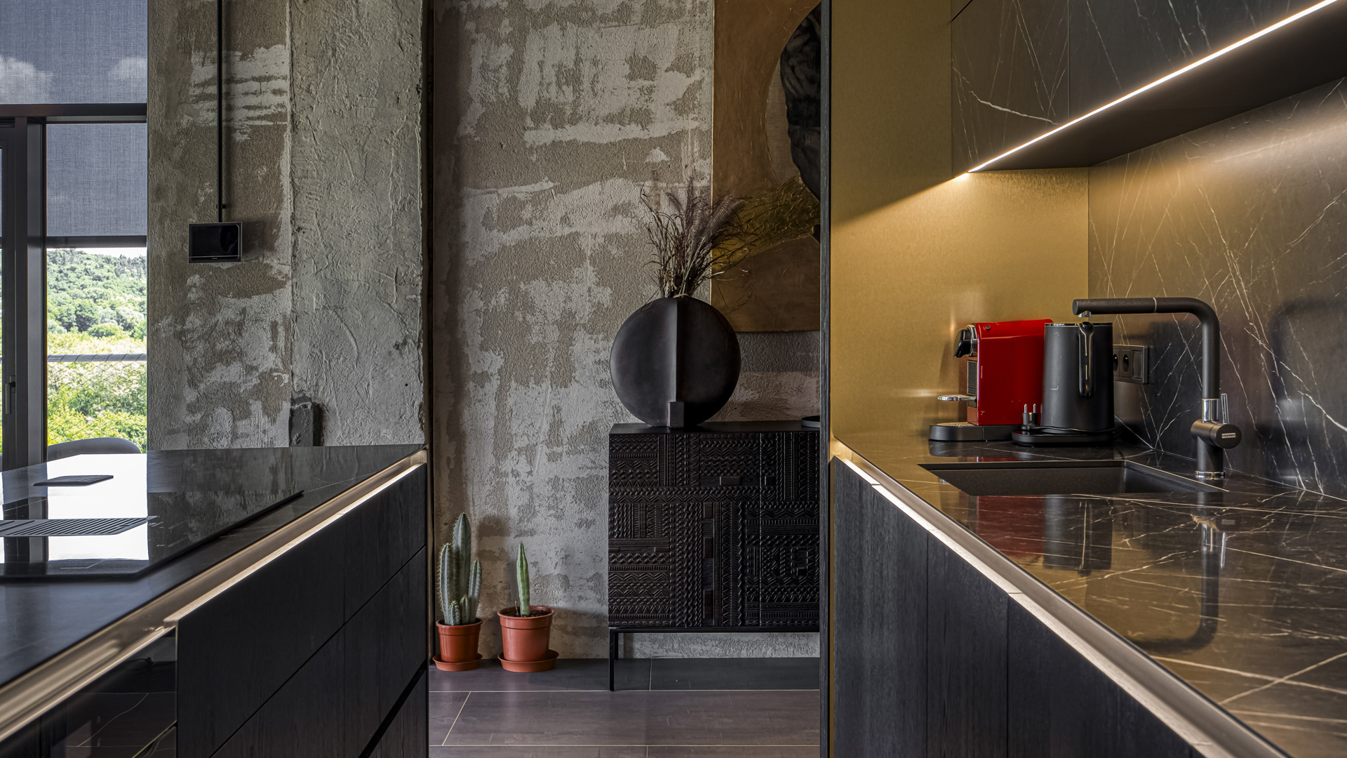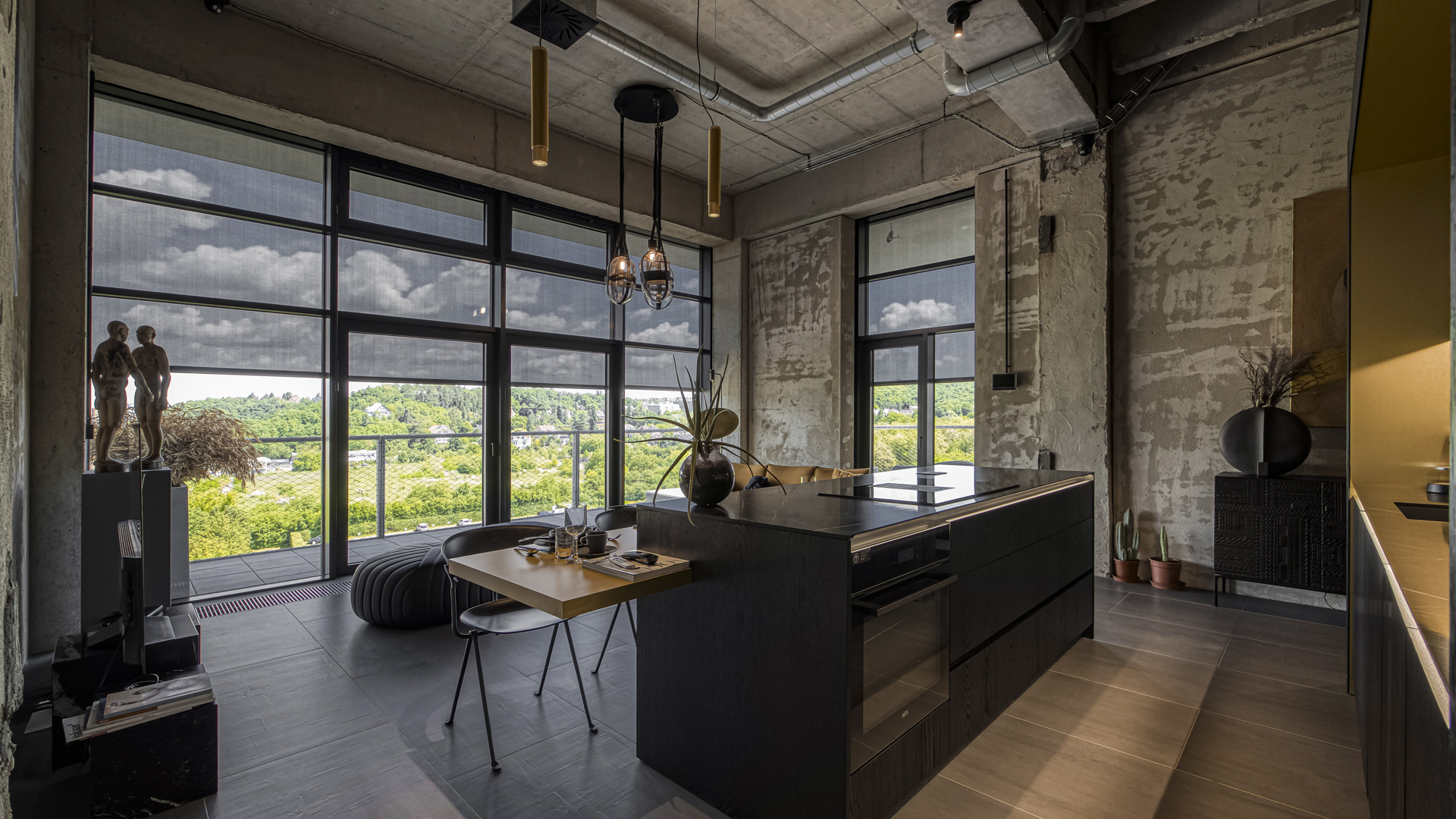 The interior, designed by the prestigious architectural studio OOOX, equally emphasizes simplicity and functionality while preserving the raw atmosphere of the original building. The main living area retains exposed concrete on the walls and ceilings, visible ceiling beams typical of industrial structures, and exposed ductwork. The raw concrete tones are echoed throughout the rest of the interior, where black, grey, and anthracite shades dominate, accented by touches of gold, brass, and yellow in decorative elements, lighting, and furniture. Thanks to large-format windows covering an entire wall, the loft is flooded with natural light, while the high ceilings provide an exceptional sense of openness and space.