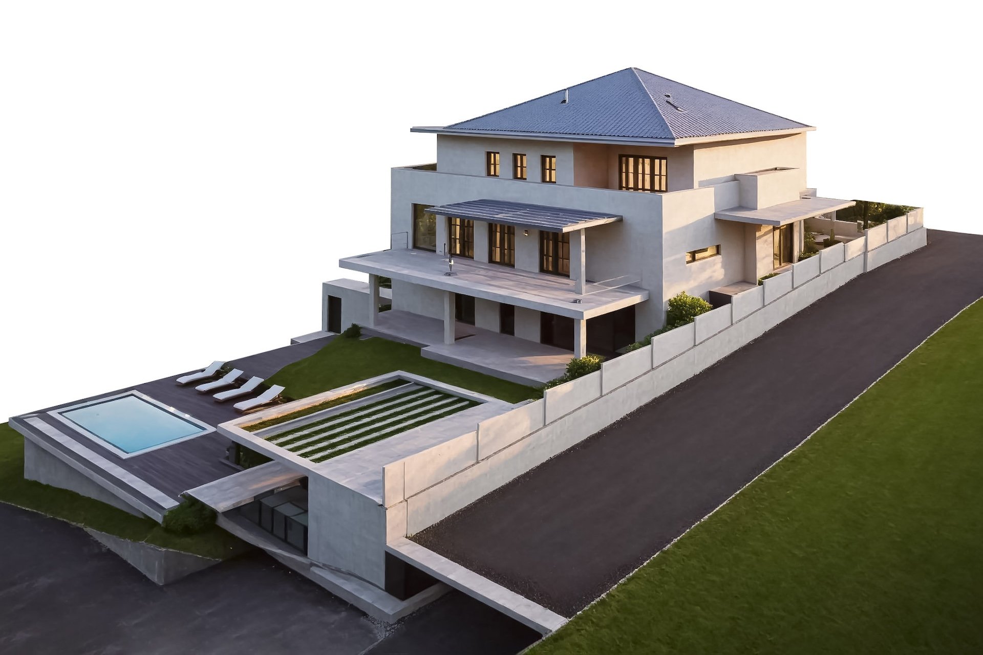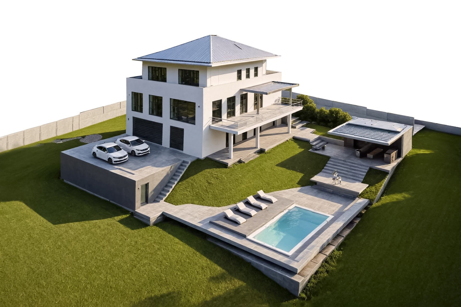 The permitted project envisages the construction of a family house with three floors. The lowest floor of the house is used for a garage for two cars, a separate studio apartment for guests, a relaxation room with a fitness or sauna, a laundry room and a utility room. Thanks to the sloping land, this floor also has large-format windows to the garden.