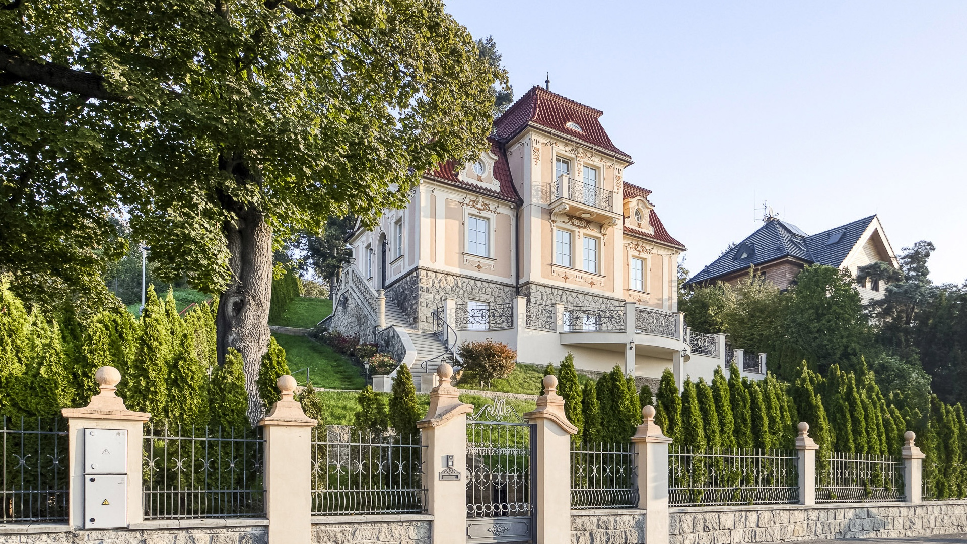 Leading craftsmen of the time also participated in the construction of the villa - the wrought iron grilles were created by J. Jindrák from Vysočany and the stucco work was done by Antonín Nejedlý. The result is a timeless residence that combines historical charm with the quality and elegance of the First Republic architecture.