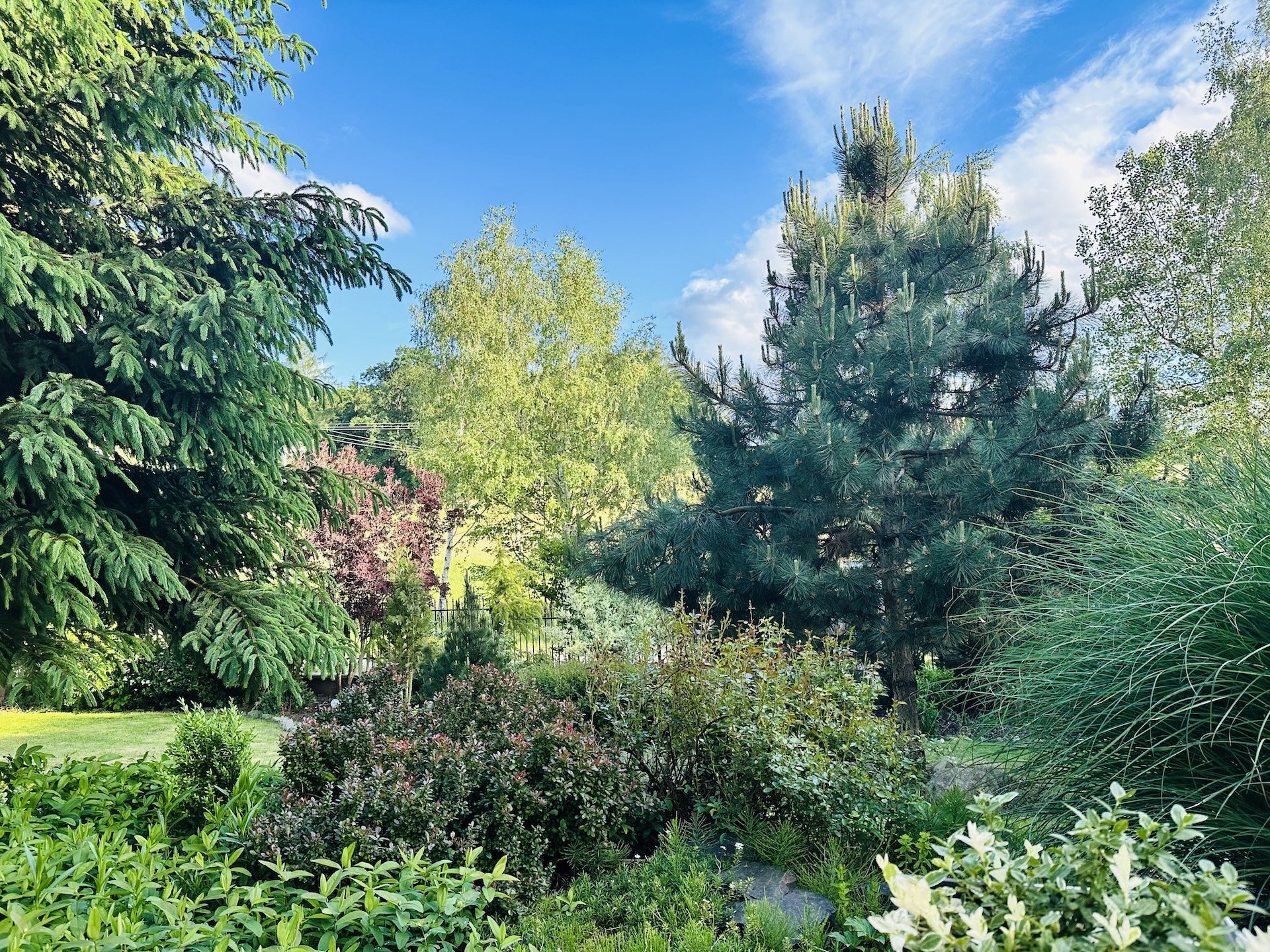 The first floor is designed as the private part of the house. The dominant feature is the spacious master bedroom with a view of the garden, complemented by two children's rooms, a guest room, and a study with a panoramic view of the greenery—ideal for a home office or a quiet studio. The main bathroom, decorated in cream tones, offers a bathtub, high-quality sanitary equipment, and plenty of space for relaxation.