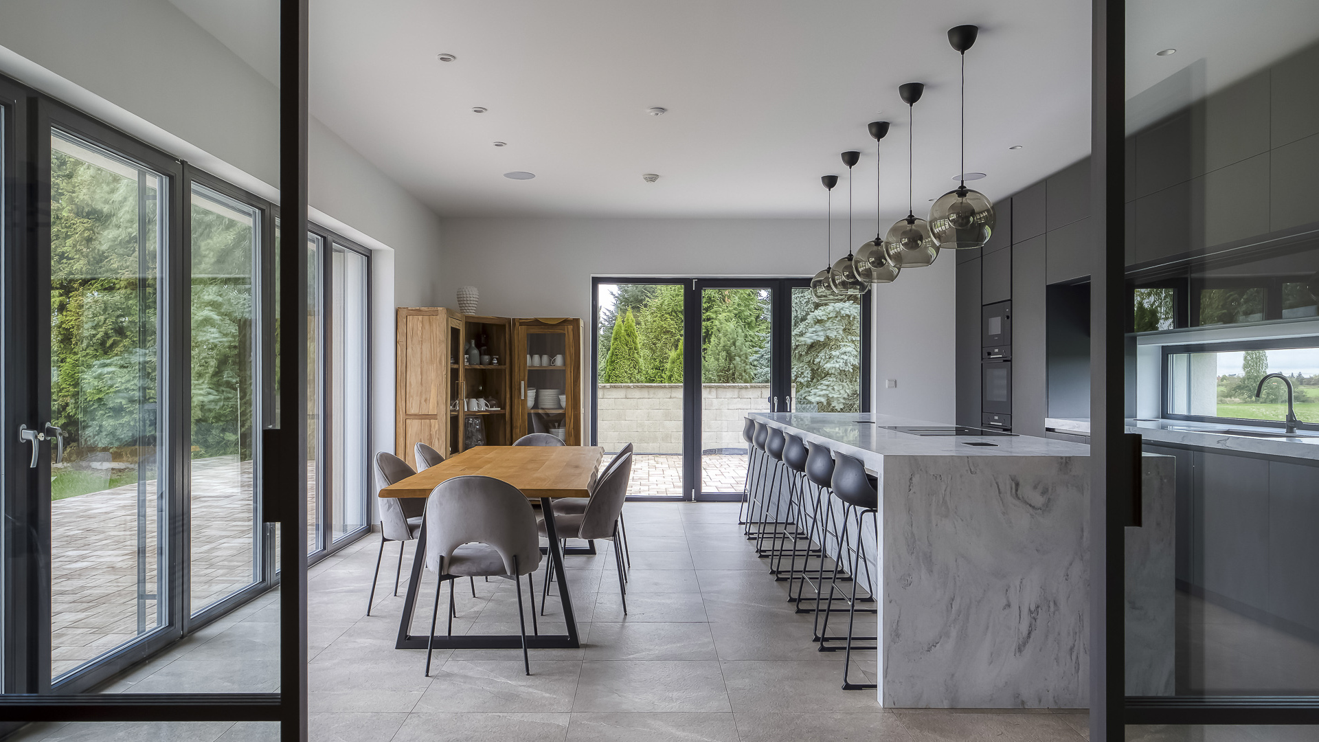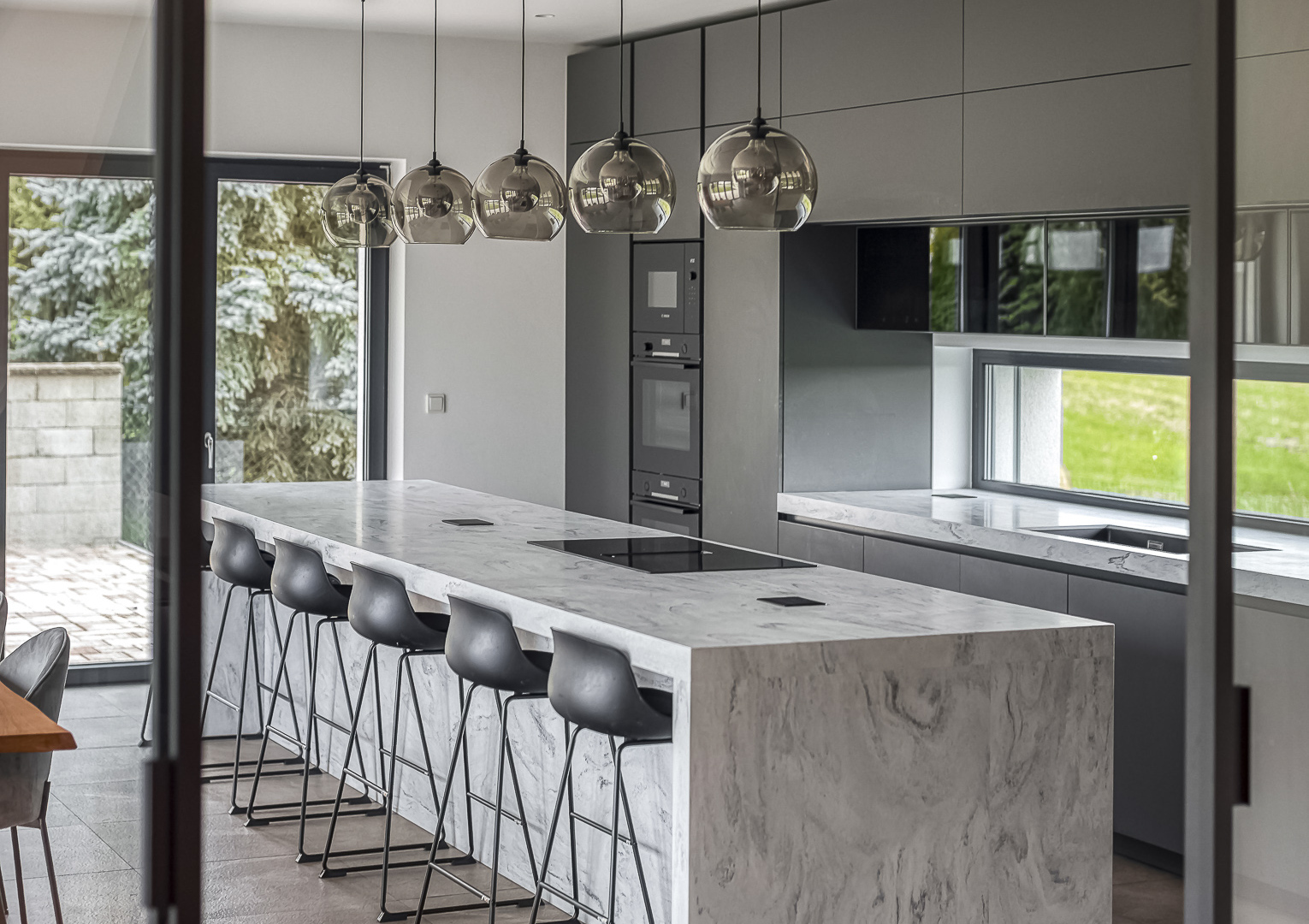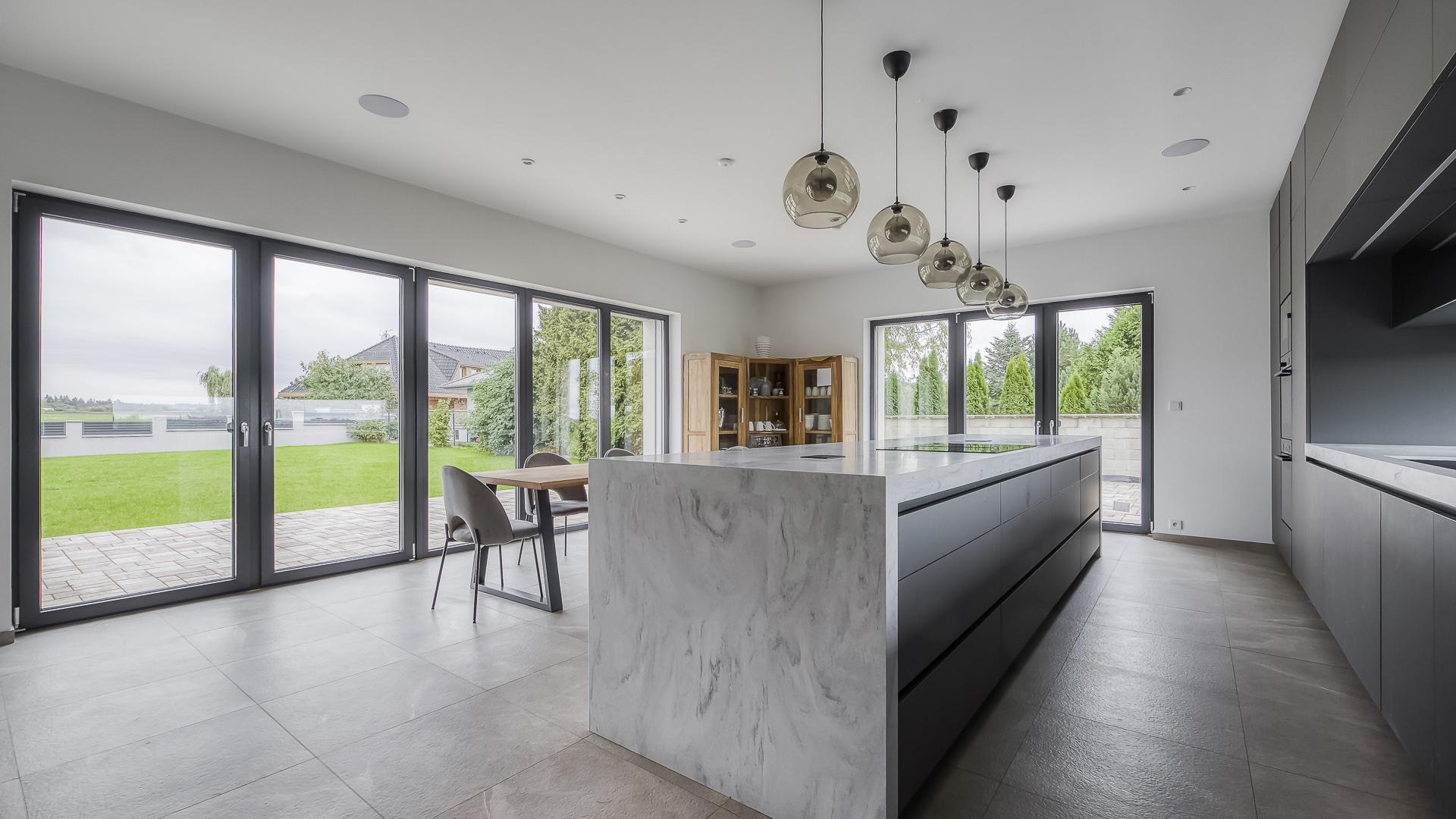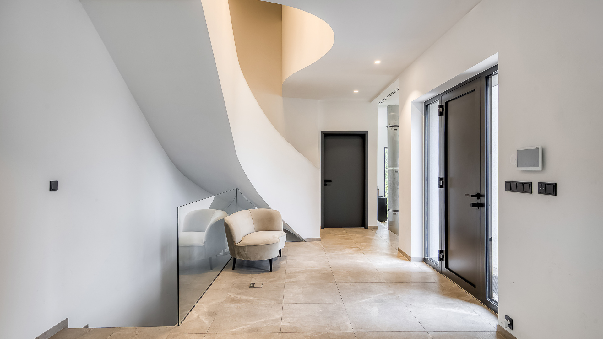 The ground floor of the villa is divided by a central entrance hall with a designer staircase, which dominates this space. In the entrance hall there is a spacious separate cloakroom and a day toilet for this floor. In the left wing of the house there is a modern kitchen equipped with Bosch appliances including 2 refrigerators and freezers for sufficient storage capacity. In the kitchen you can sit at the kitchen island or at the dining table, each for 6 people. From the kitchen you can exit through all the windows to the outdoor terrace and further into the garden.