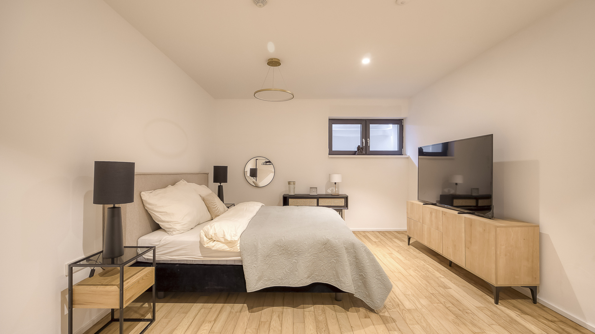 In the right wing of the ground floor there is a living room of 73 sqm with large windows to the garden, which provide not only a pleasant view, but also a lot of light to this room and direct access to the garden. There is also a separate room that can be used as a bedroom, study or playroom and has its own en-suite bathroom.