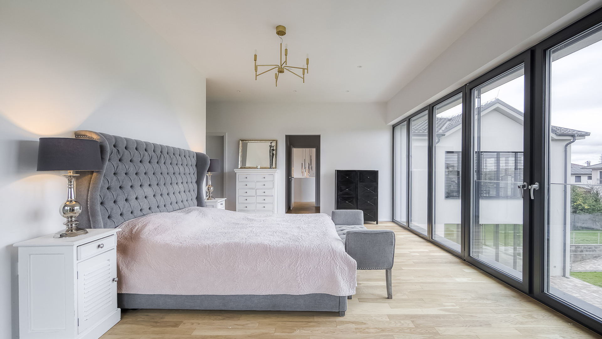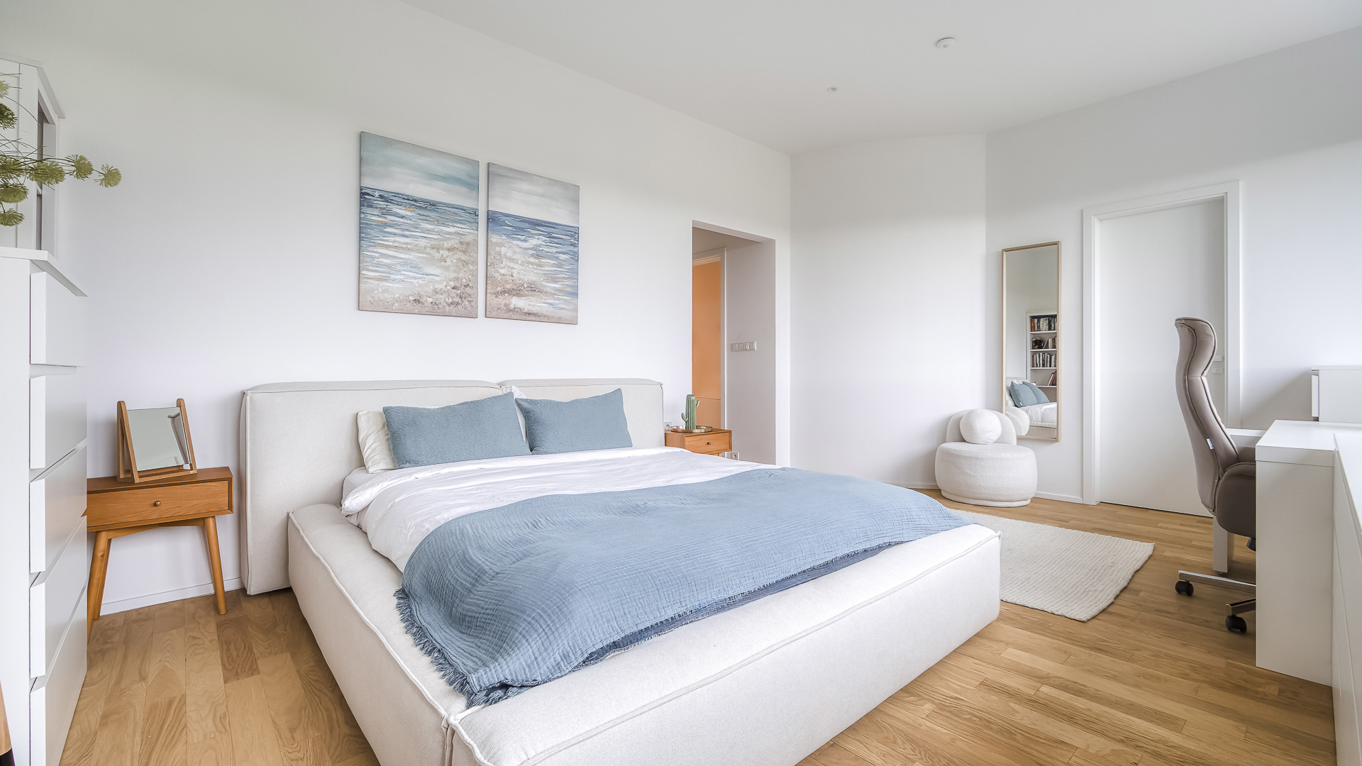 The first floor of the villa is a private part with bedrooms. In the left wing there is a master bedroom with two dressing rooms for him and her. The bedroom also has its own bathroom with a shower for two people and a bathtub.