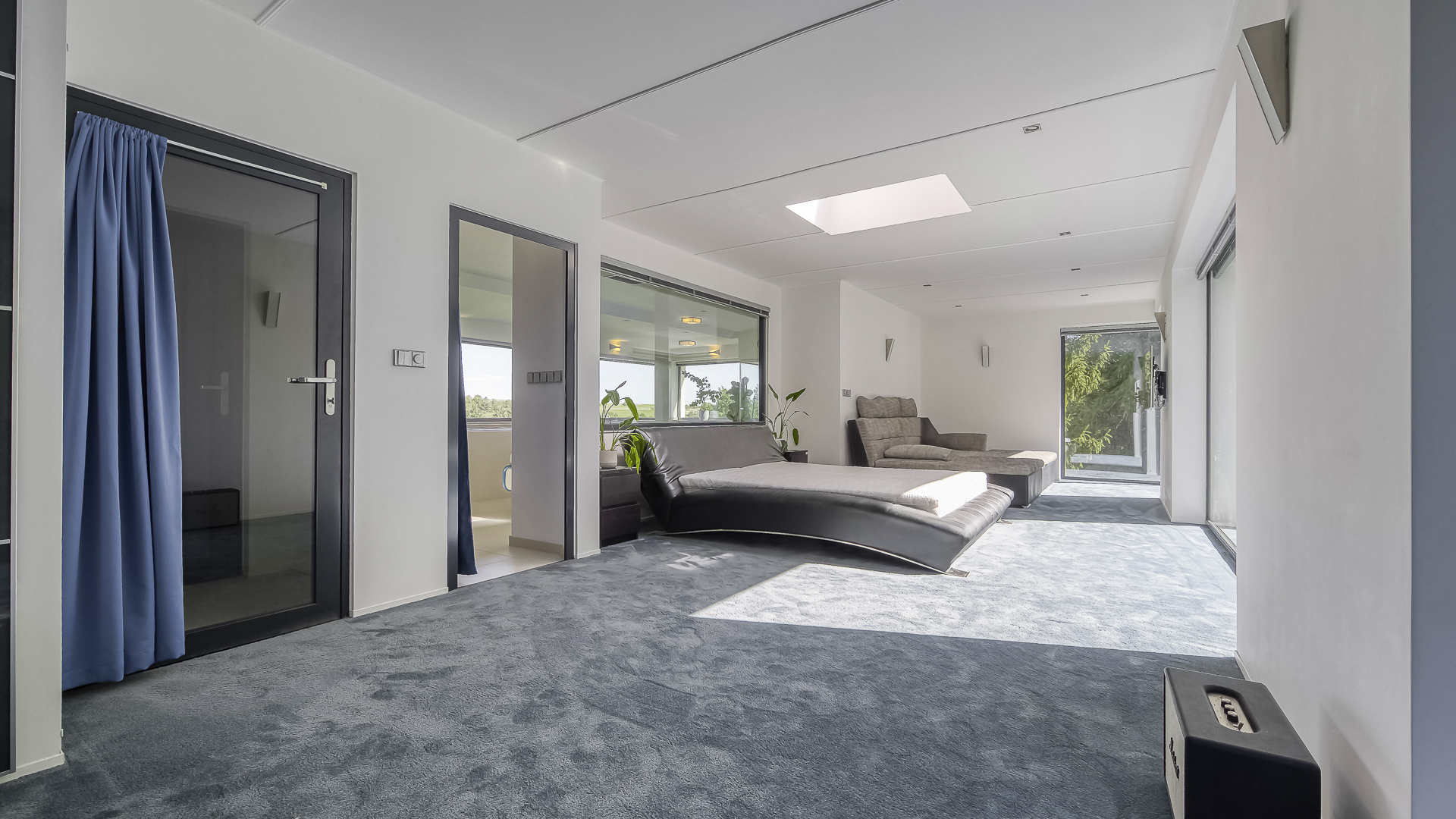 A stylish glass staircase leads to the middle floor, which contains most of the bedrooms. Here you will find one of the main bedrooms with an en-suite bathroom, a separate walk-in closet, and a balcony overlooking the garden. There are also two additional bedrooms, each with its own bathroom – one of them designed as a playful children’s room with hideaways. The top floor features the largest bedroom with a balcony once again facing the garden, along with a spacious home wellness area. This includes a twelve-meter swimming pool with counter-current, a steam shower, and a bathtub for several people, while a gas fireplace creates a cozy atmosphere for relaxation. The top floor can thus serve as a generous master suite with full facilities, yet the wellness area also has direct access from the corridor to ensure privacy if needed.