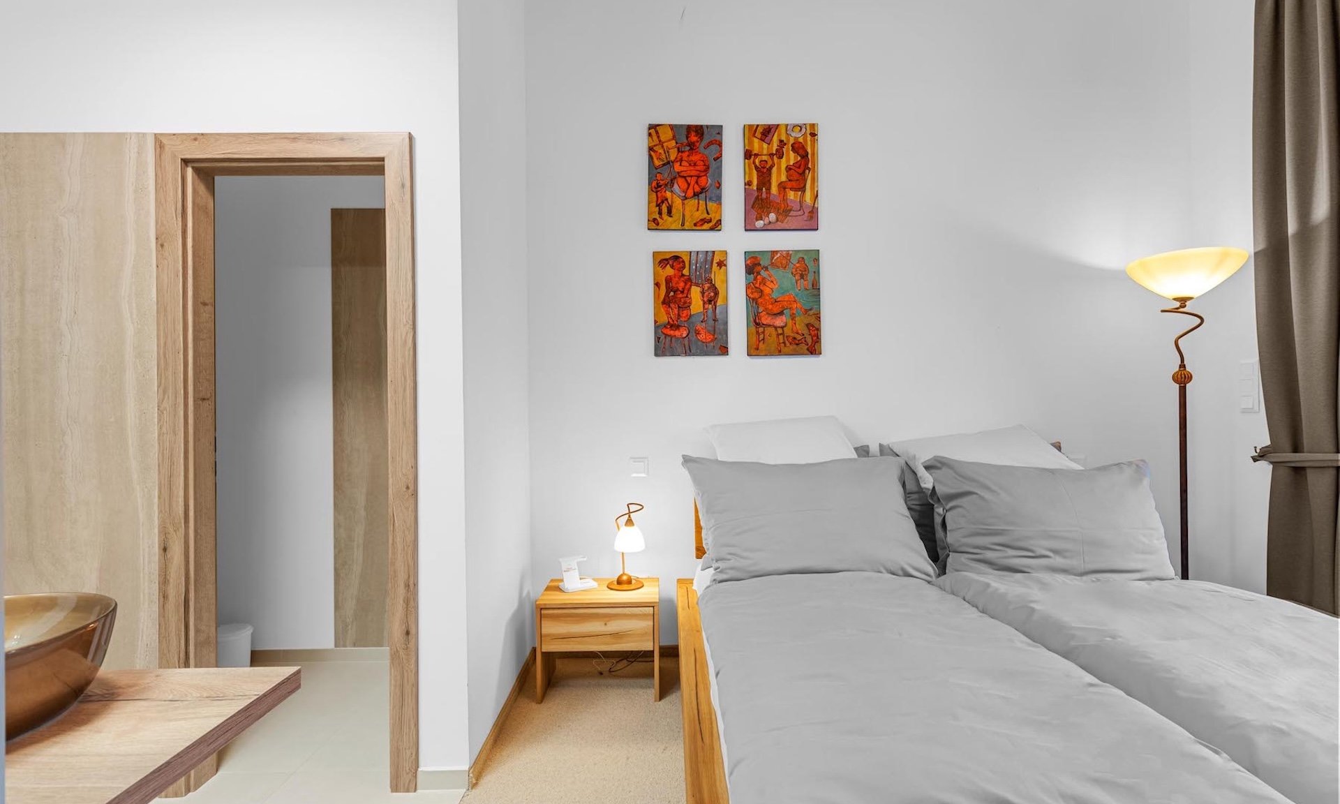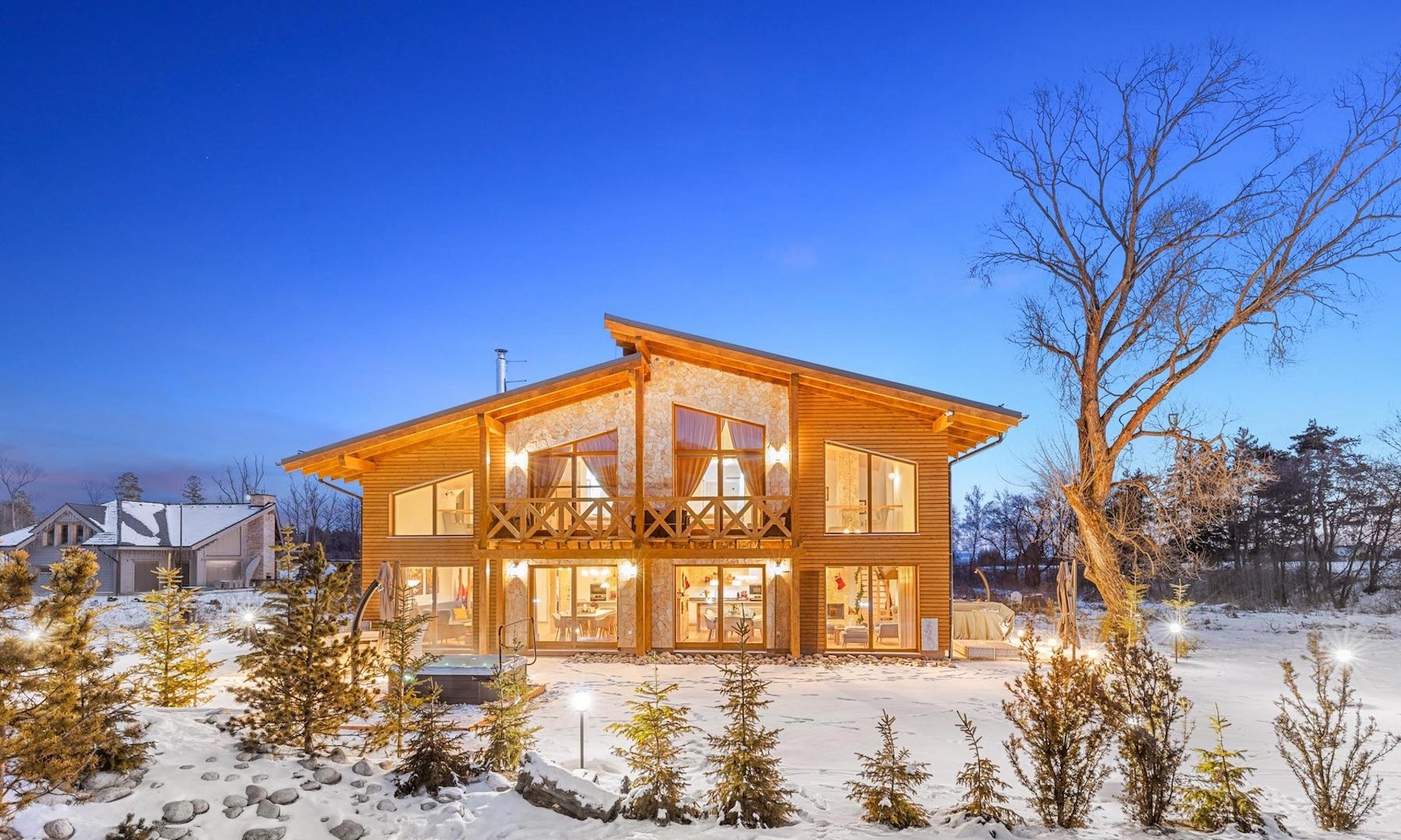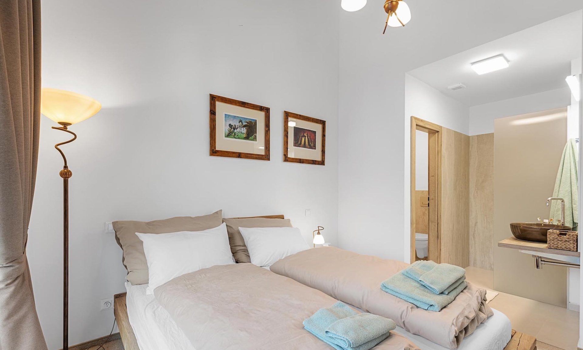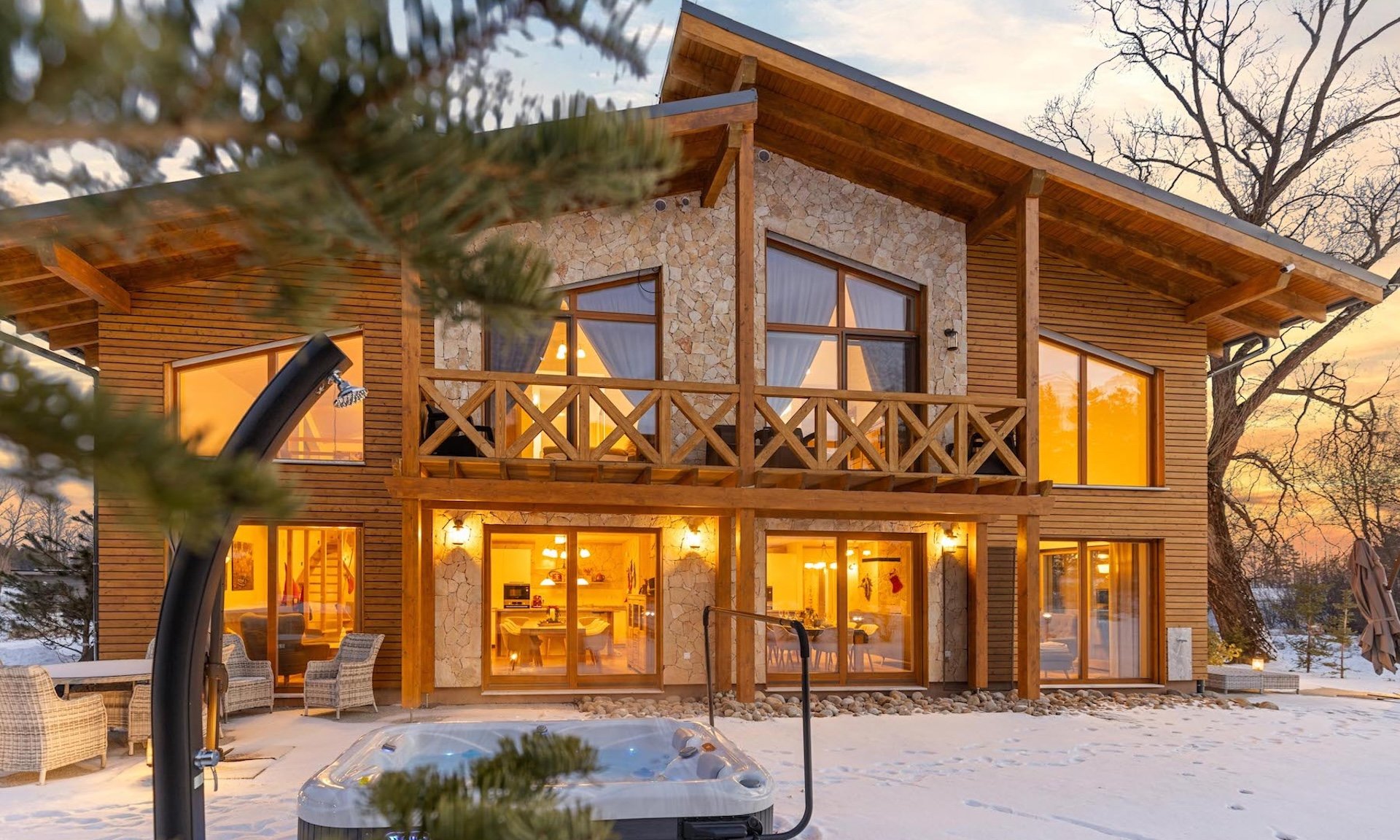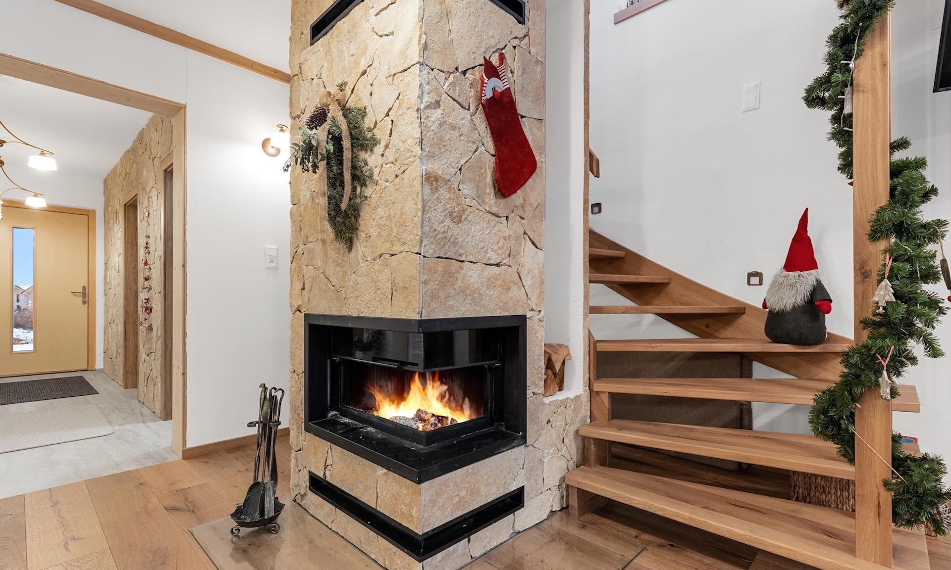 Each residential unit comprises five stylishly furnished rooms. The ground floor features a spacious living area with a stone fireplace, dining space and a fully fitted kitchen with integrated appliances. The day zone opens directly onto a terrace with a private whirlpool and outdoor seating. A guest bedroom with an en-suite bathroom is also located on this level.