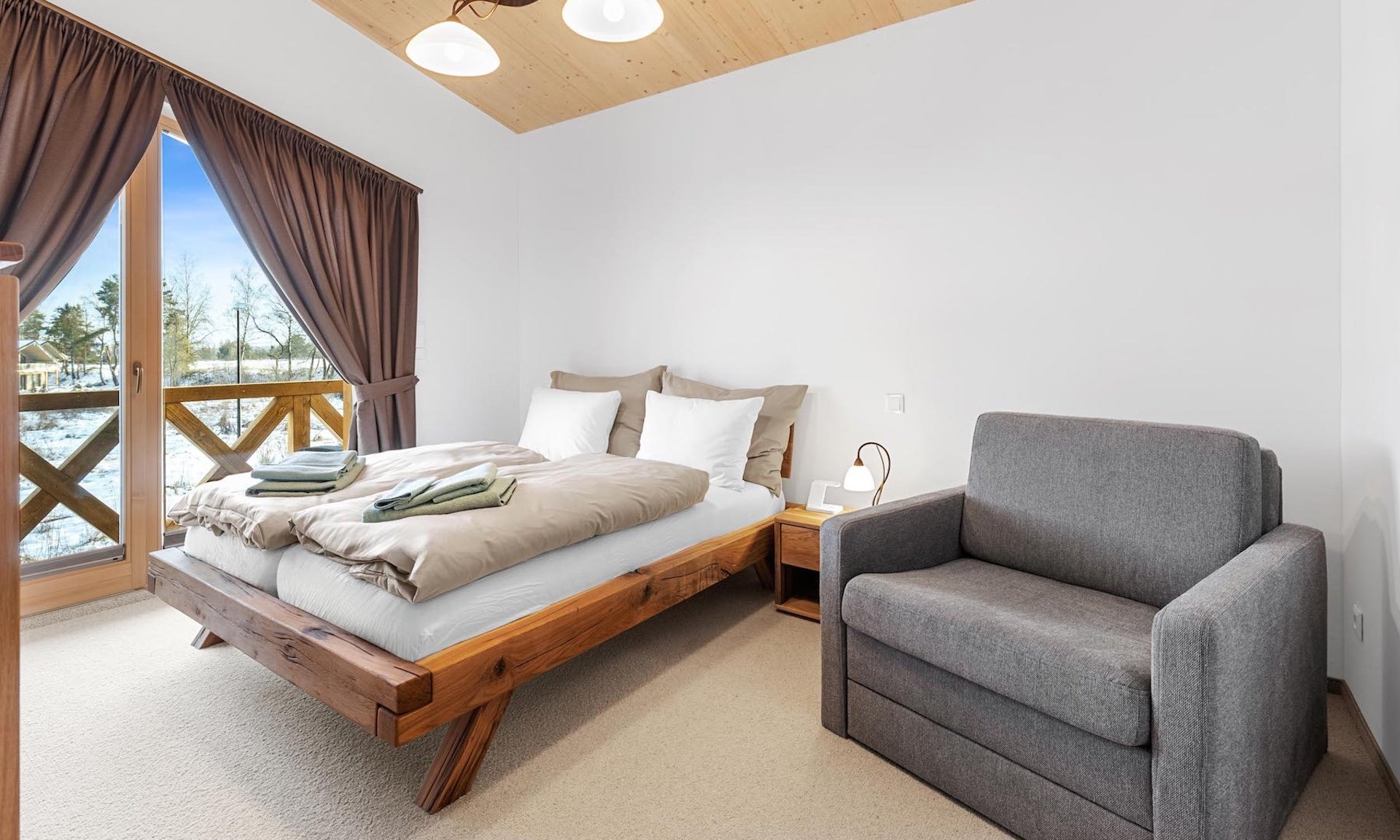 The chalet was constructed with maximum emphasis on ecological solutions and sustainability. The structure is made of natural materials with a solid wood frame, complemented by oak, natural stone and textiles made from wool and cotton. Year-round thermal comfort is provided by a 100-metre deep geothermal borehole, used as a renewable energy source for heating.