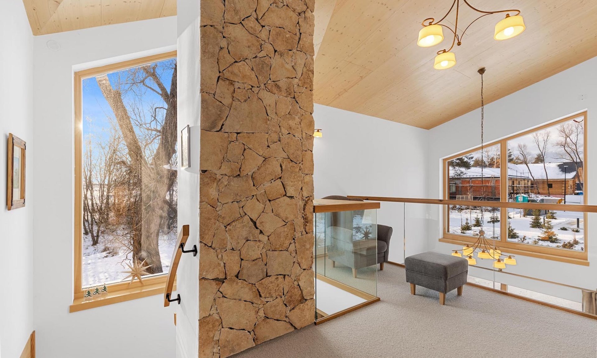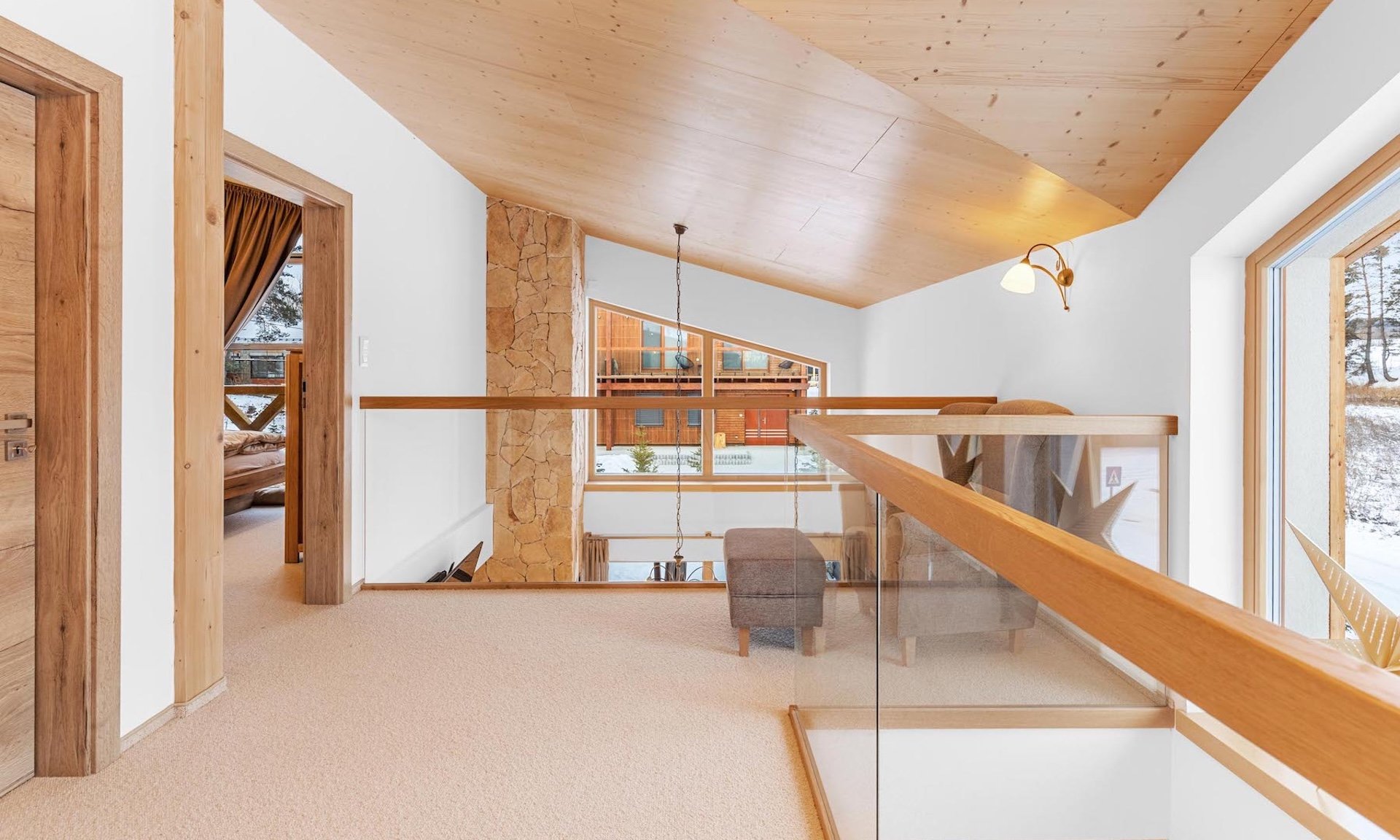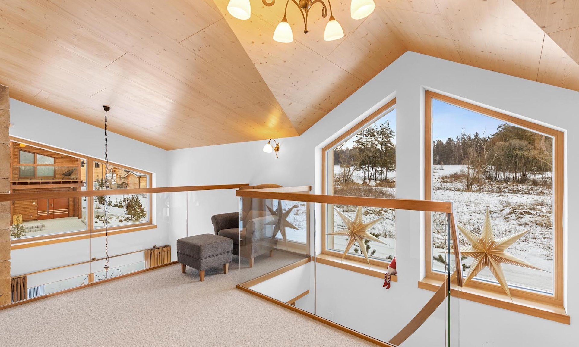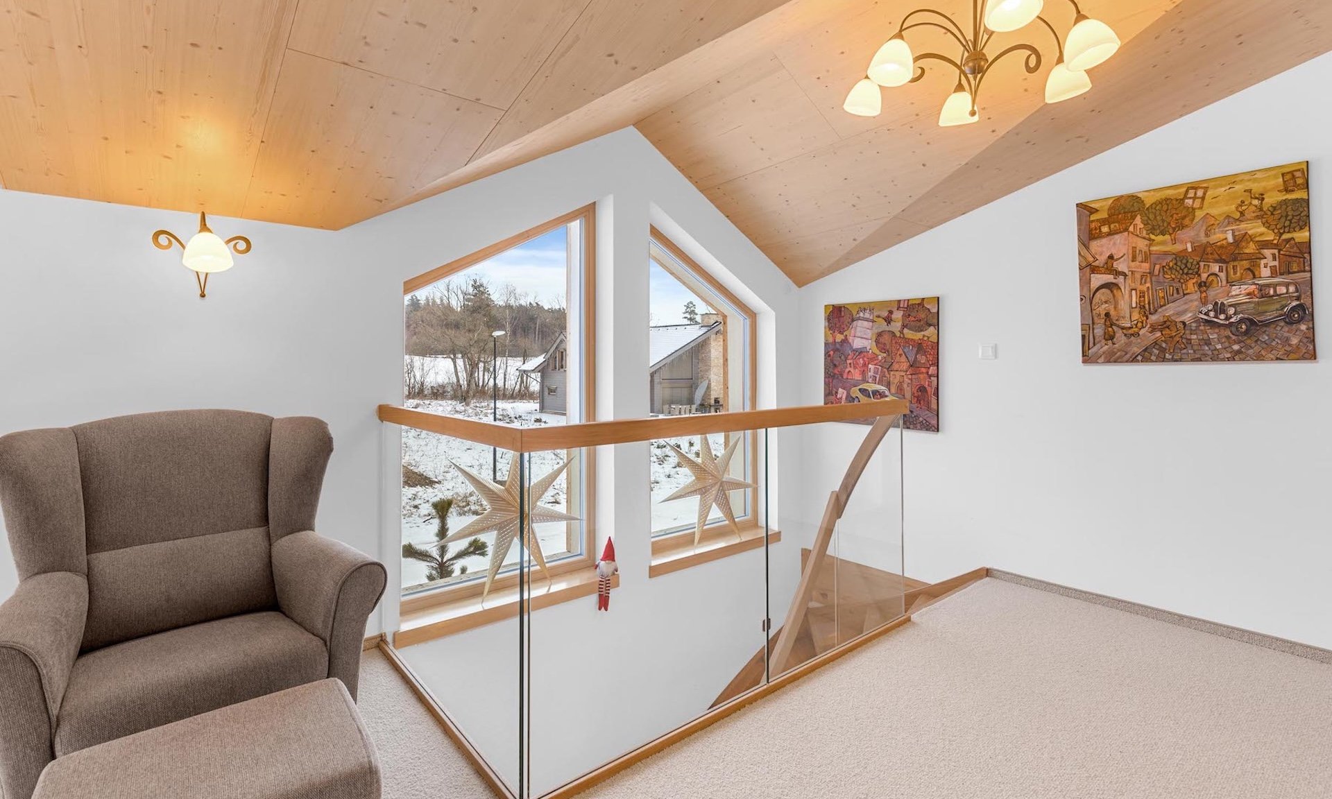 The upper floor is dedicated to the night zone with three bedrooms, including a master suite with en-suite bathroom and a balcony facing the panoramic views of the Tatras. The gallery mezzanine serves as an attractive relaxation area, library or home office with views of the surrounding landscape.
