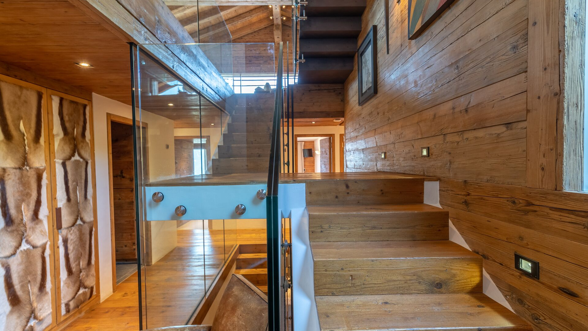 With a total living space of approximately 640 m², the residence spans several floors, designed with a focus on quality, aesthetics, and refined mountain style. The interiors combine solid wood, stone and glass, creating an atmosphere of understated luxury. The property features five generous bedrooms with en-suite bathrooms, a central living area with a fireplace, and a sun-bathed terrace offering spectacular valley views.