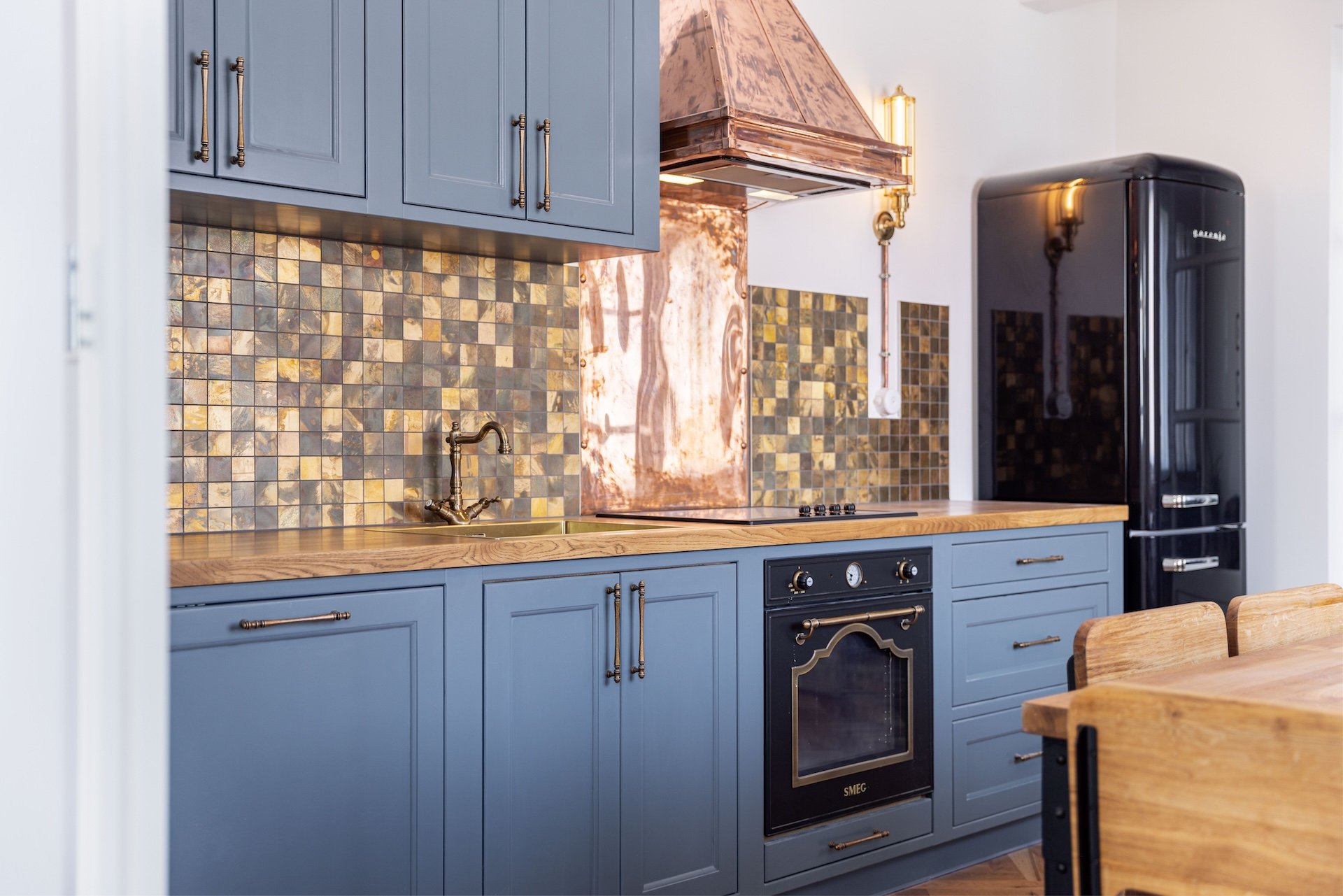 The solid wood kitchen in the colonial style is equipped with SMEG appliances, complemented by a custom-made copper hood and designer steel lamps. The art deco bathroom used Italian ceramics, sanitary ware and brass accessories.