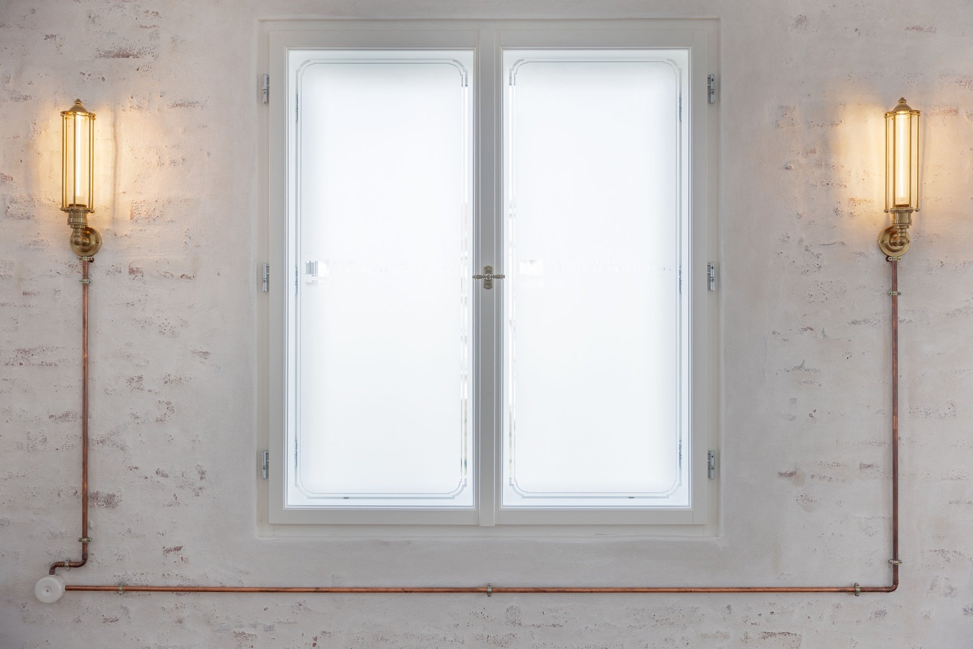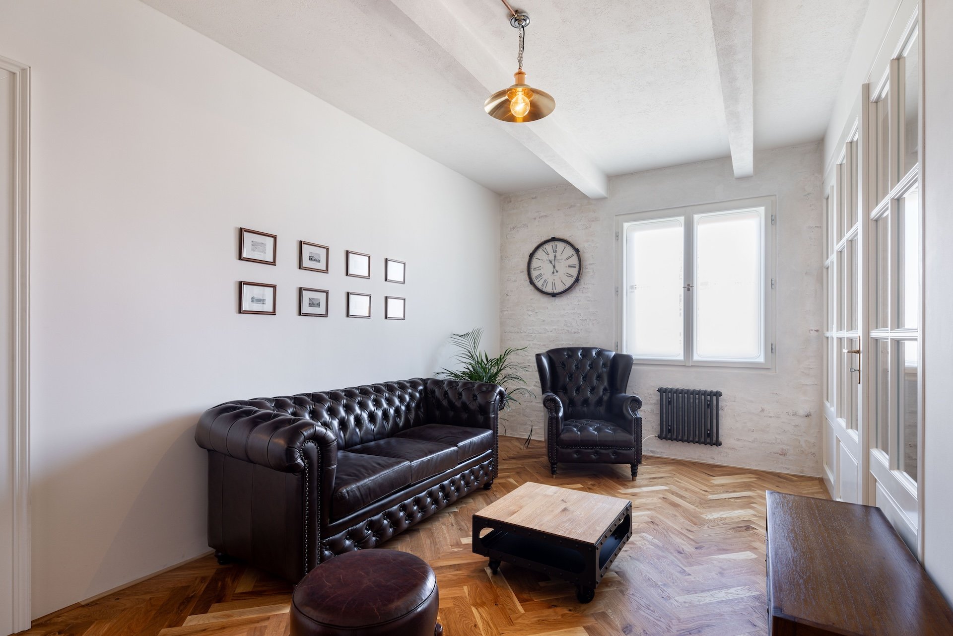 The interior is further complemented by custom-made furniture, including a steel dining and conference table, and The Original Chesterfield sofa made of genuine cowhide, imported from Holland. The apartment is also equipped with porcelain switches and dimmers, an air conditioning unit, replicas of castle windows with brass fittings and massive doors with historical milling.