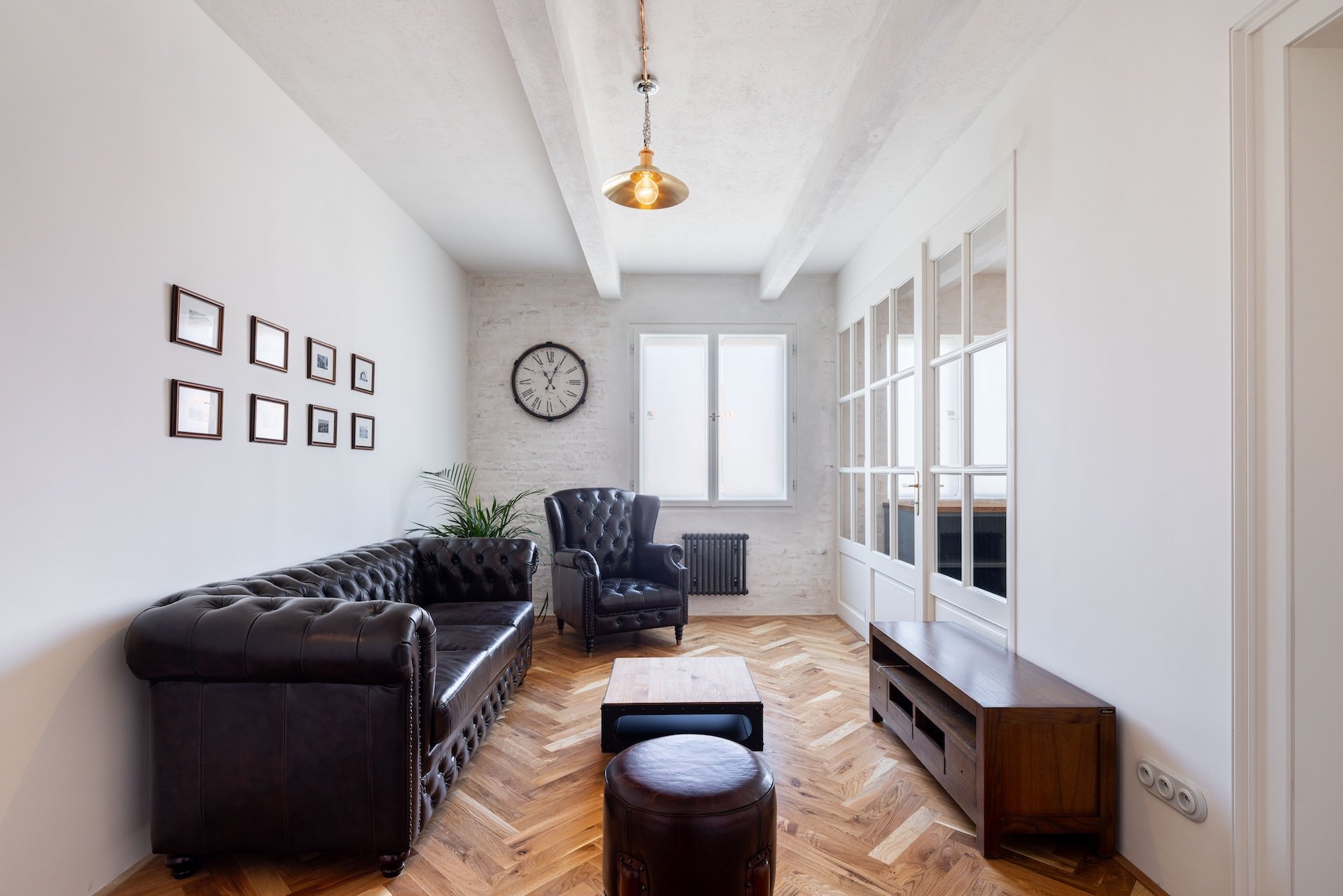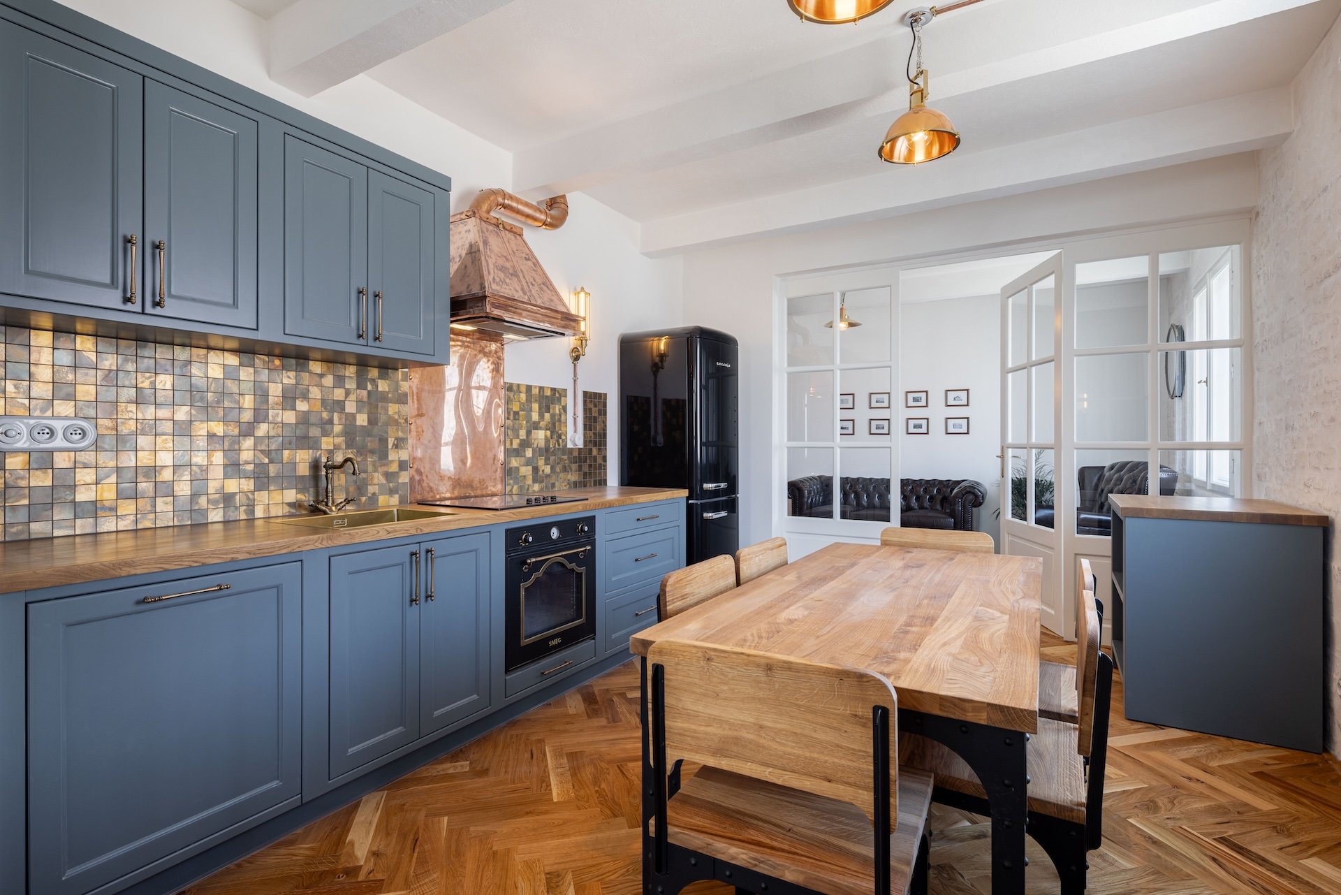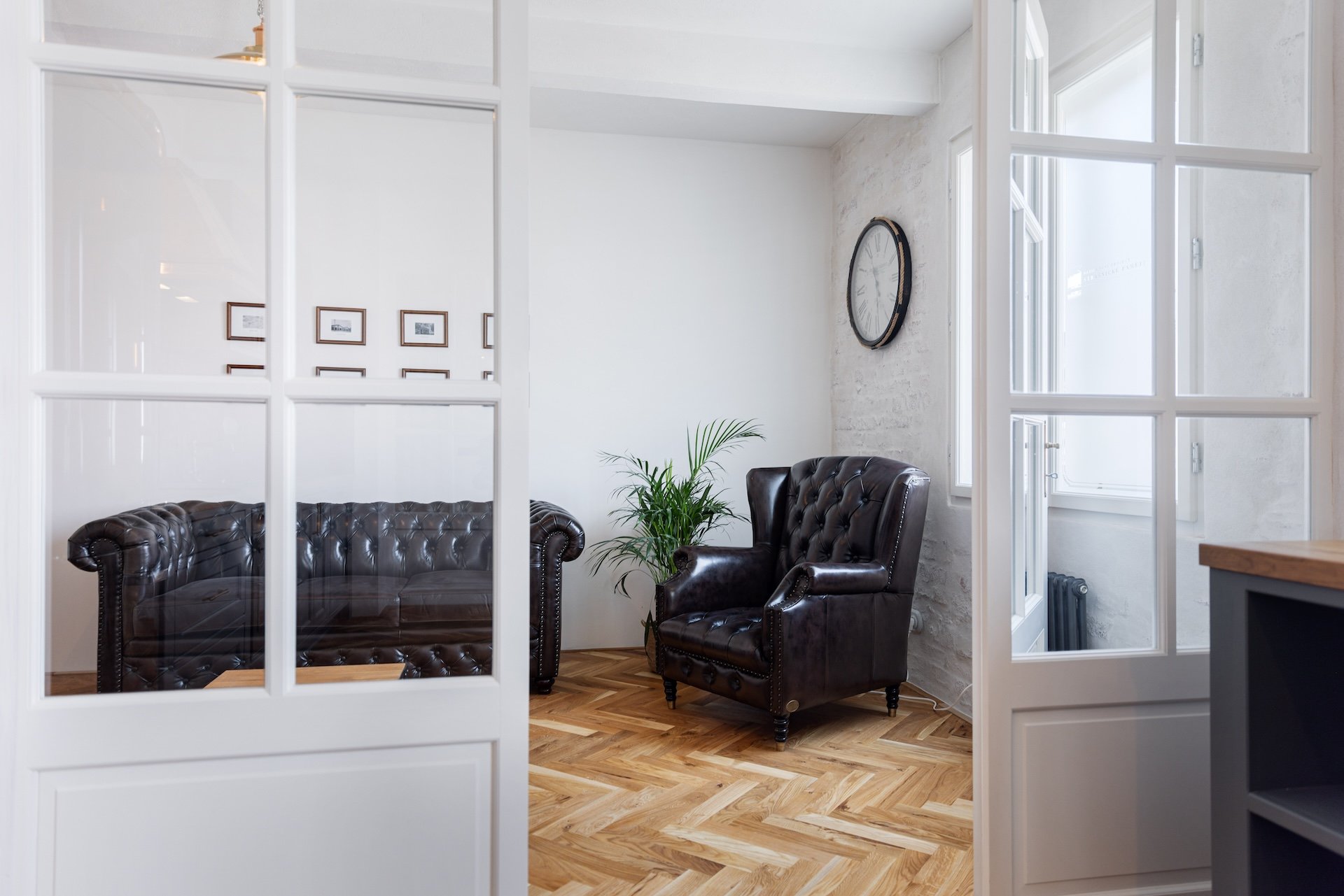 The apartment has been completely renovated under the leadership of an architect, who has infused the design with a distinctive signature inspired by the industrial and art deco styles. During the renovation, the 100-year-old beam floor structure was restored. Newly laid oak parquet floors, together with exposed brickwork and massive elements, create the atmosphere of a noble industrial apartment.