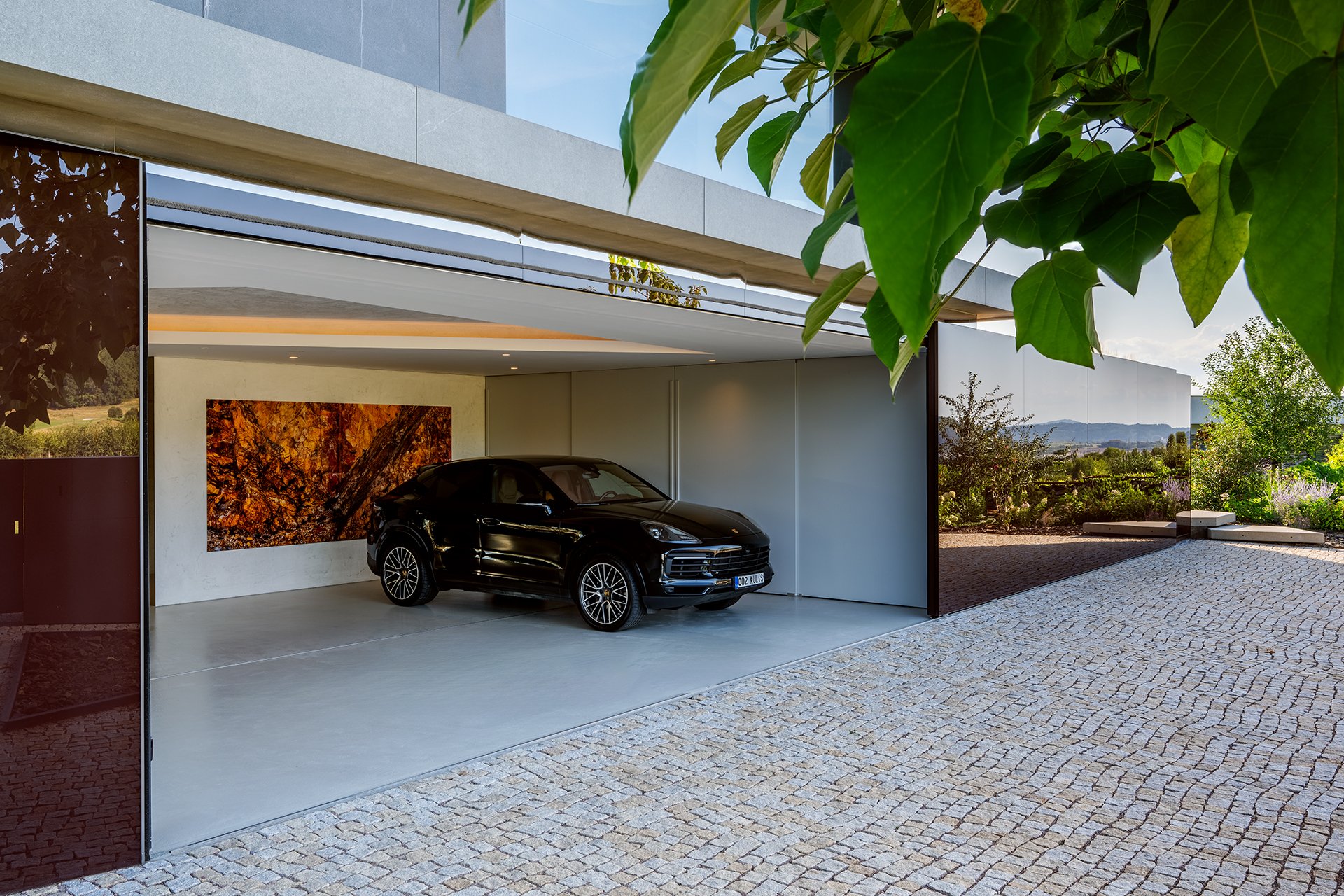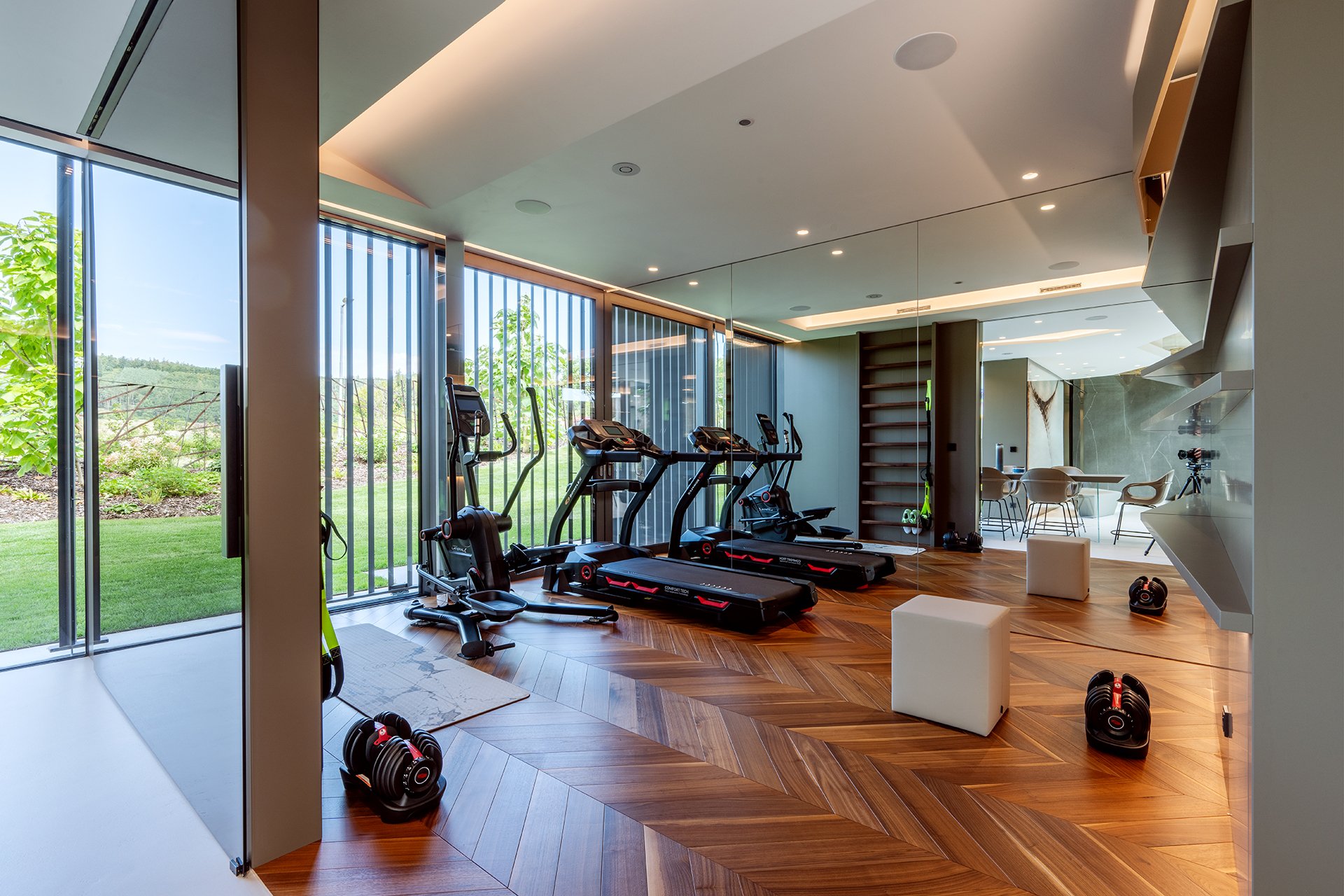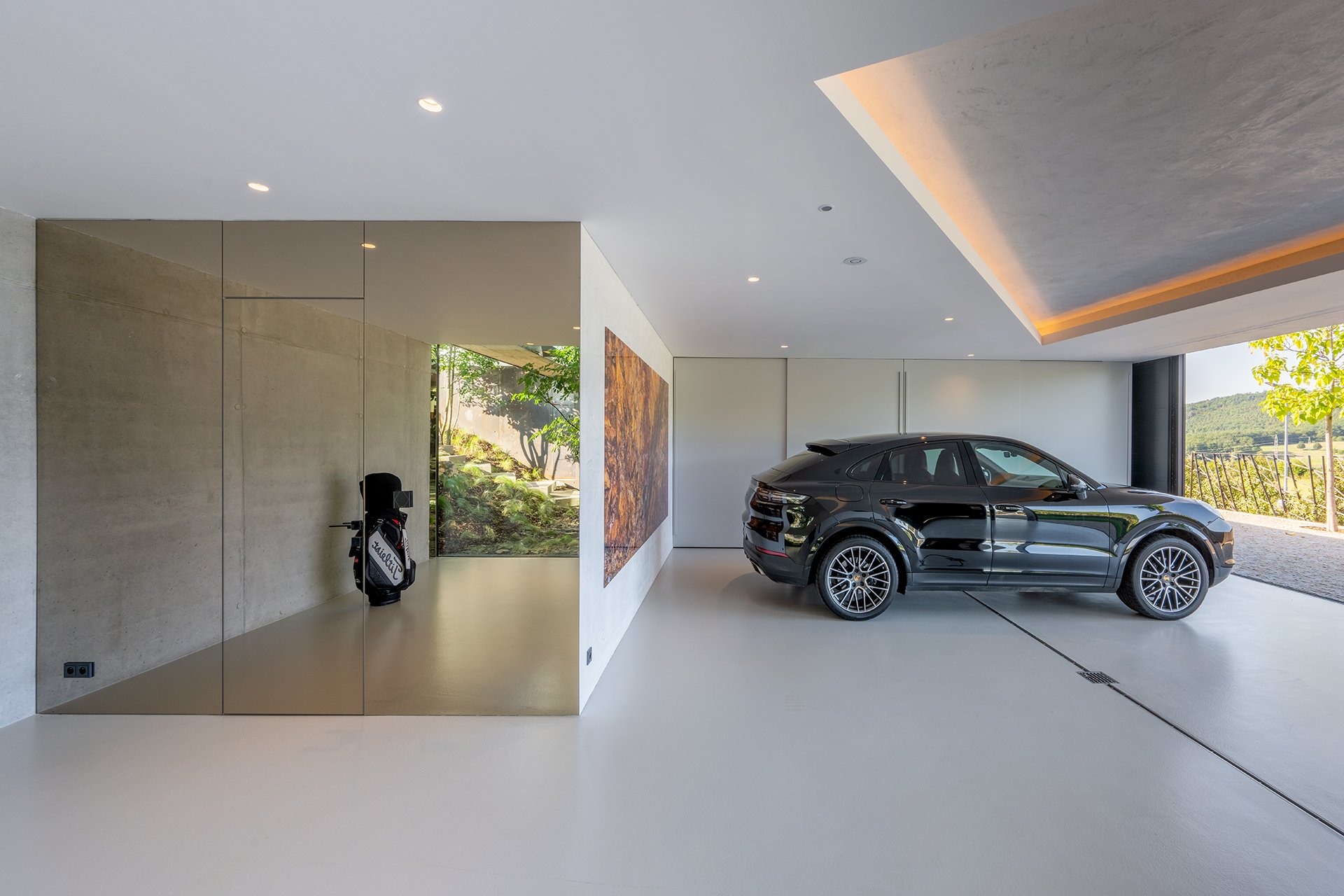 The lower floor is centred around an impressive living gallery—serving as the heart of this level. It is complemented by a bar lounge, kitchenette, bathroom with sauna, two separate guest bedrooms and a private gym. This floor also includes a three-car garage, full technical facilities and two charging stations for electric vehicles.