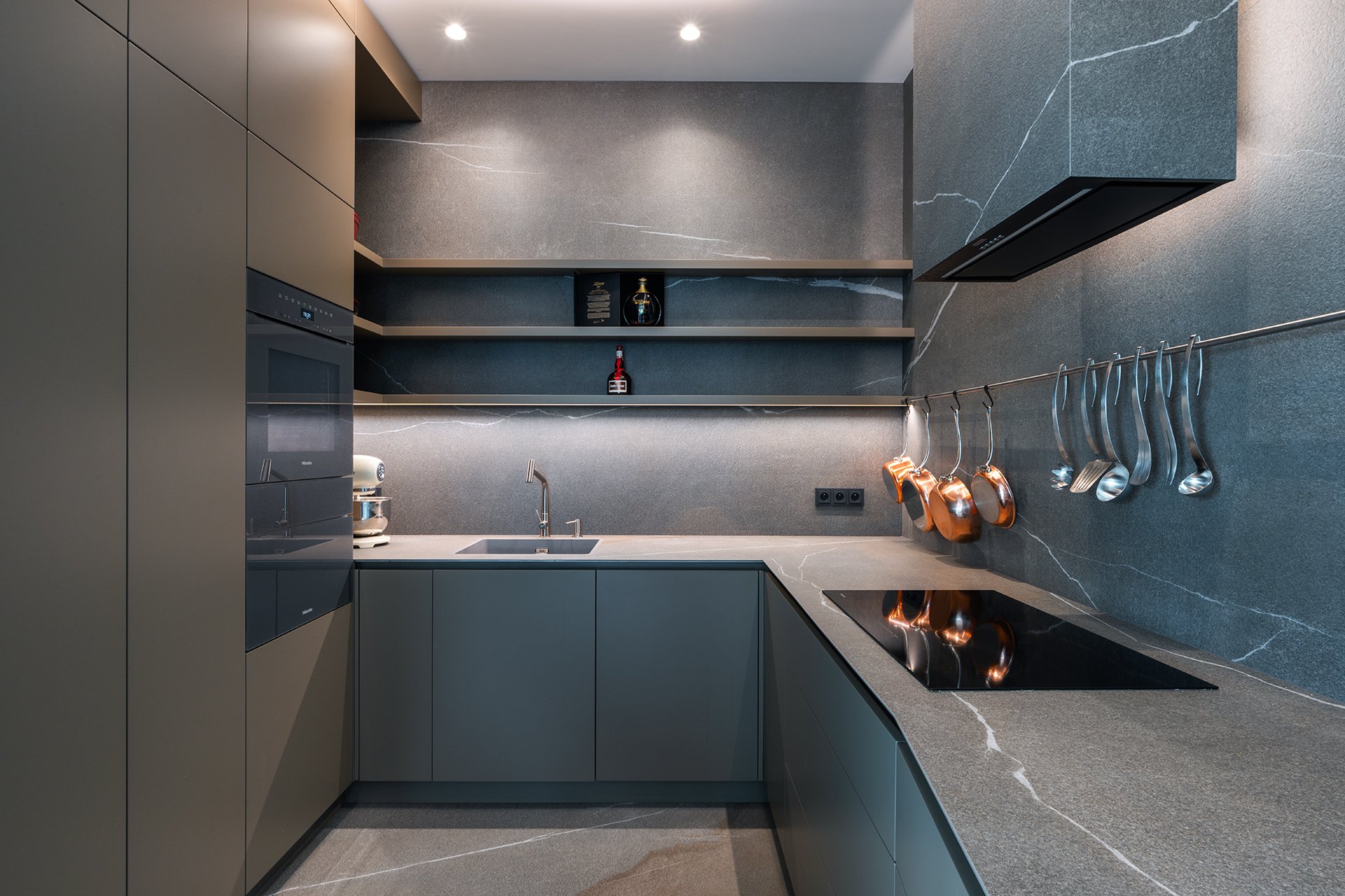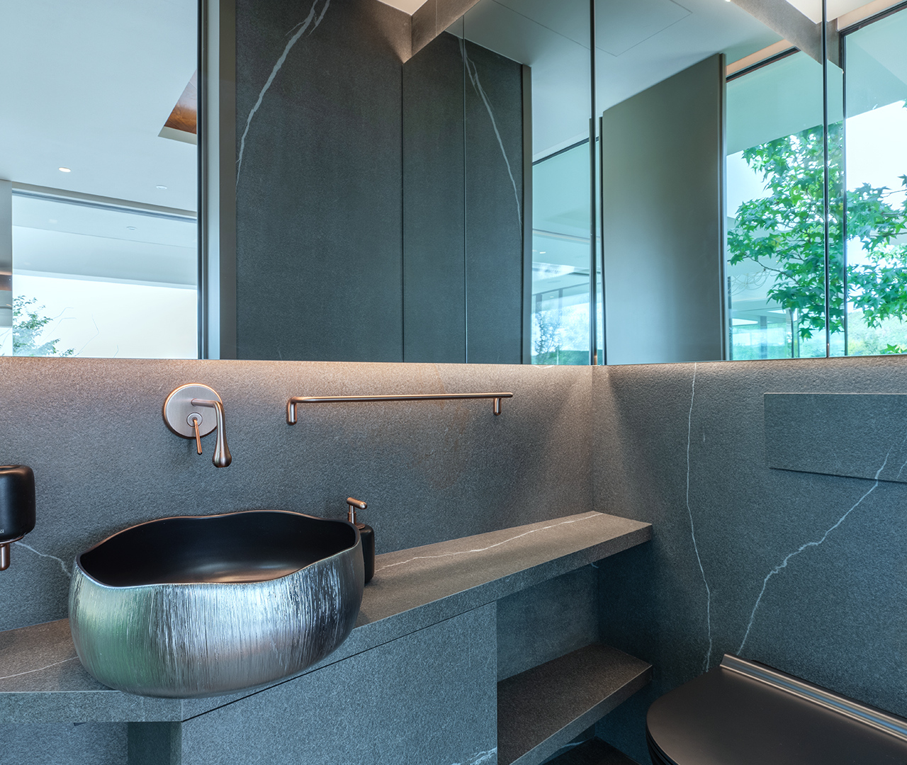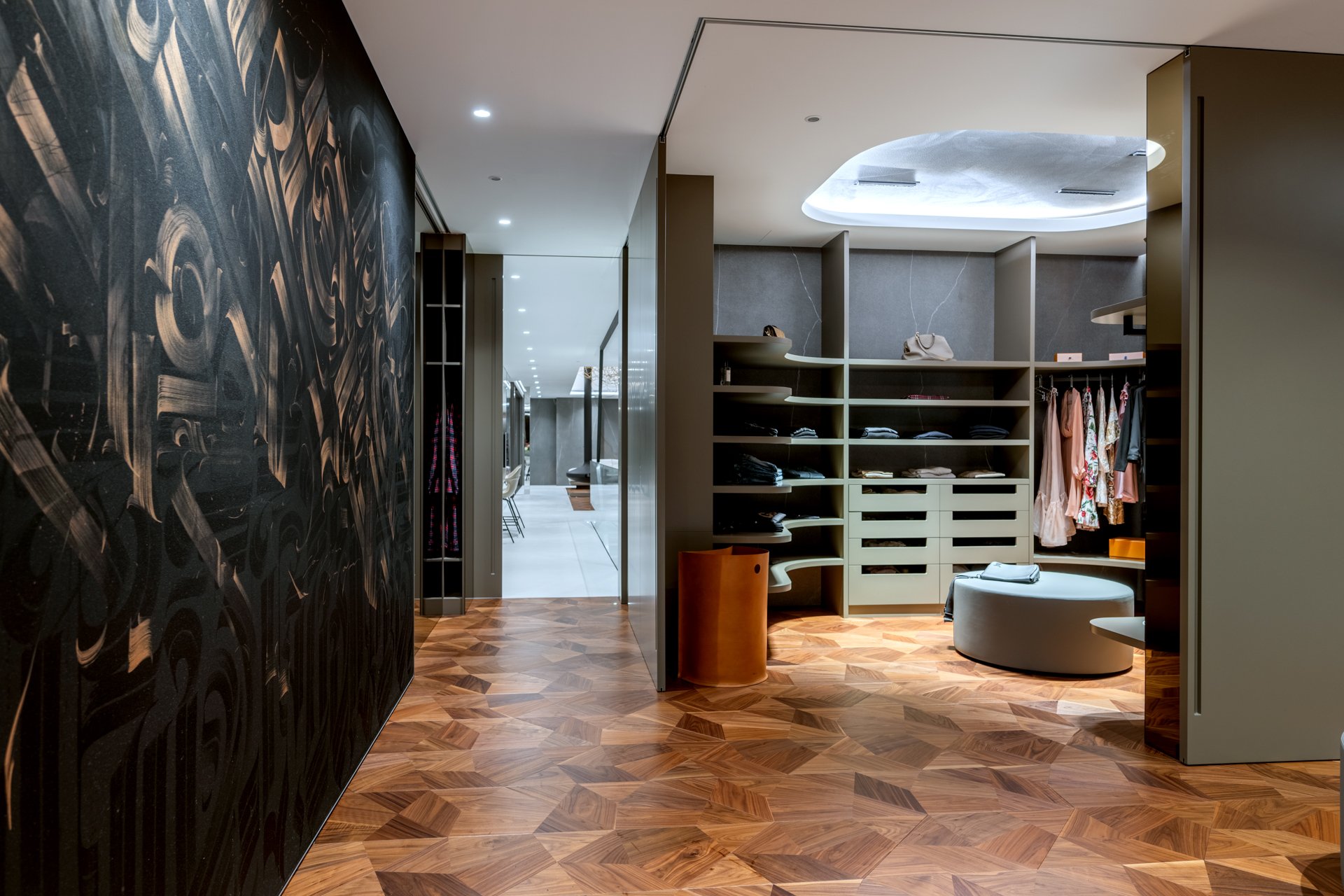 The lower floor is centred around an impressive living gallery—serving as the heart of this level. It is complemented by a bar lounge, kitchenette, bathroom with sauna, two separate guest bedrooms and a private gym. This floor also includes a three-car garage, full technical facilities and two charging stations for electric vehicles.