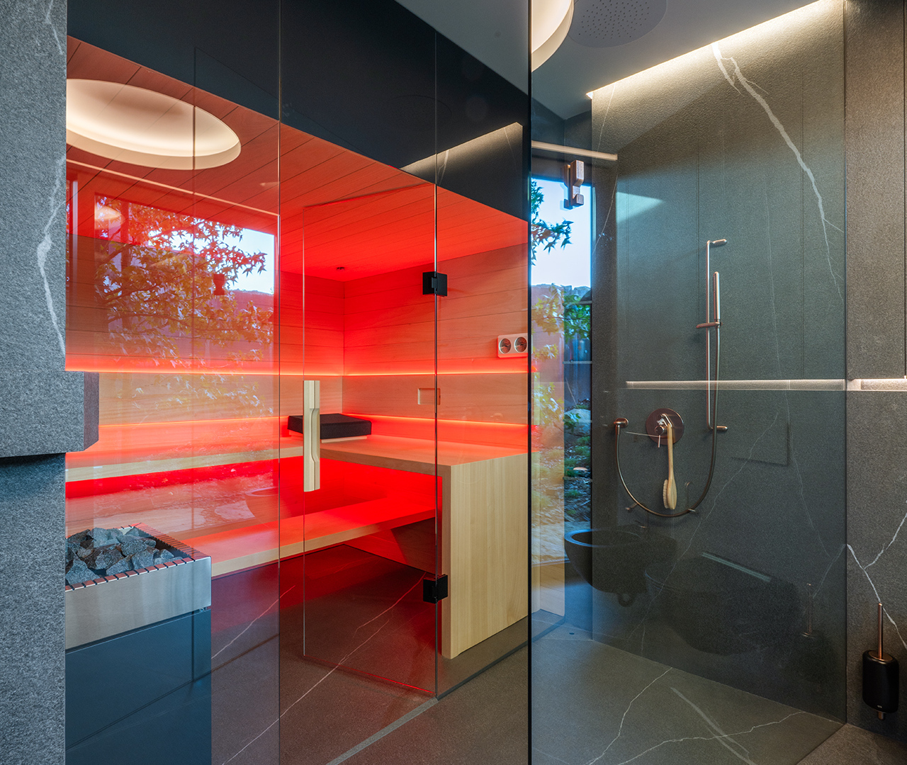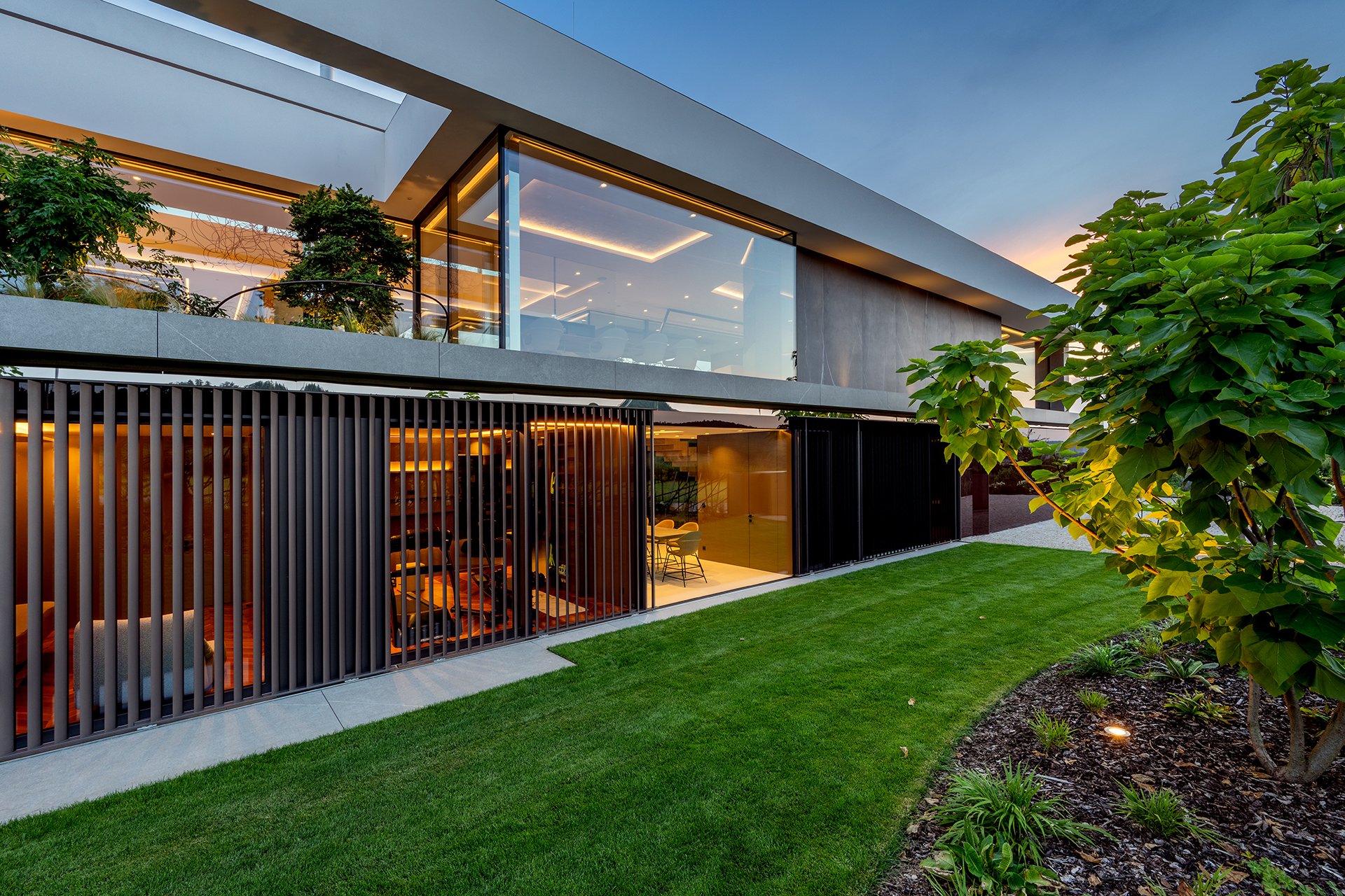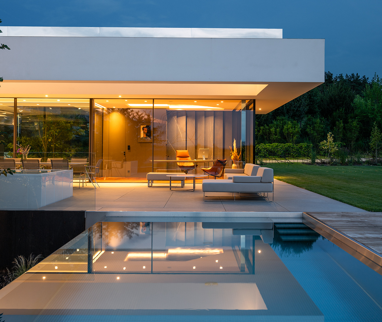 Both floors open onto terraces facing the pool. The exterior offers an 8 × 4 m stainless-steel infinity pool with lamella cover, a whirlpool, a large dining table, multiple seating areas and sophisticated outdoor lighting. The lower level is further brightened by cleverly designed atriums, which also provide direct garden access.