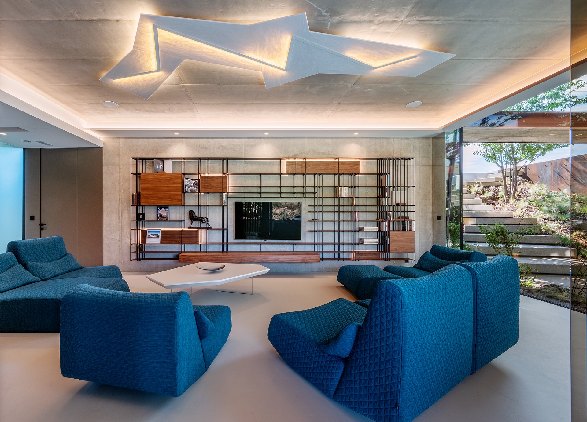 air-to-water heat pump, capillary heating and cooling integrated into ceilings and artistic sculptural elements, underfloor heating and cooling, electric window shading and a full smart-home management system. The roof is fitted with 10 kW solar panels.
