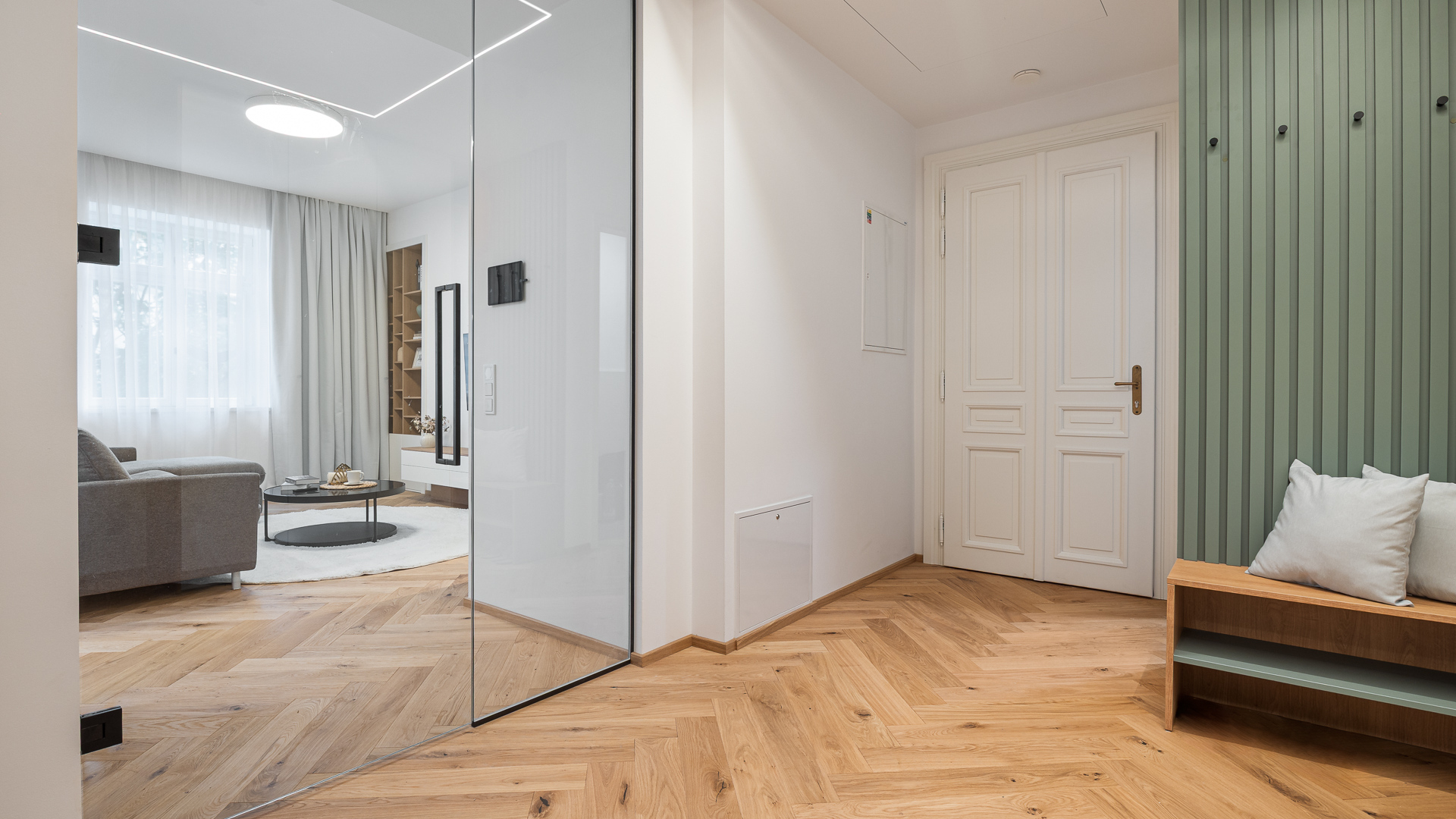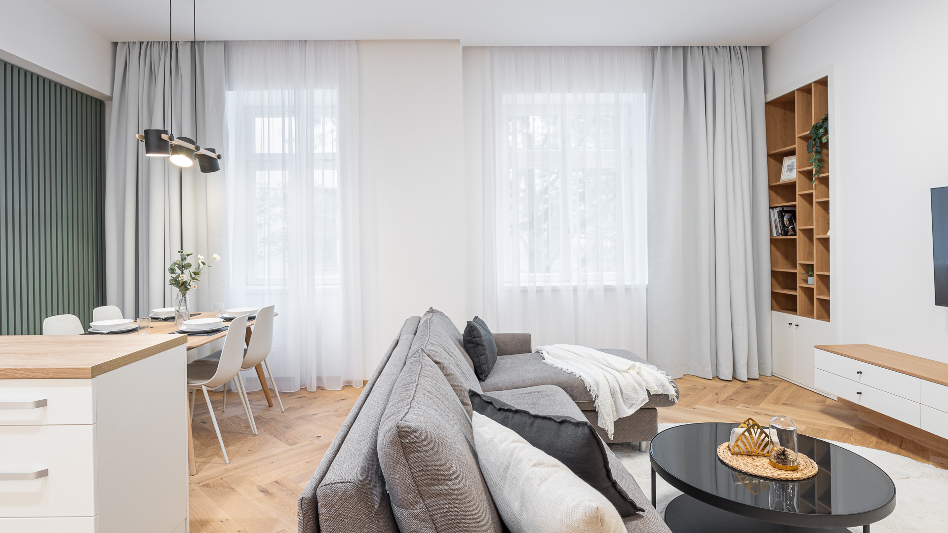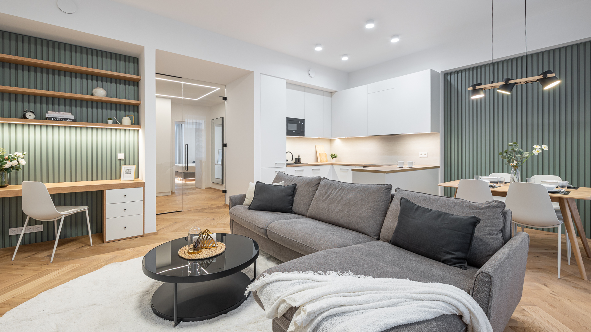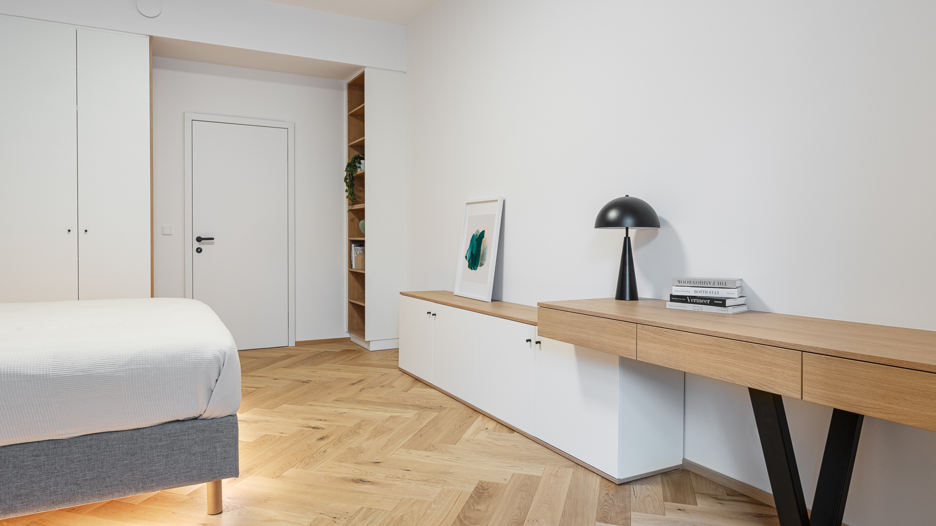 The interior has been designed with an emphasis on timelessness and high-quality craftsmanship, featuring OAKCENT wooden floors, a refined colour palette and carefully selected materials. The apartment is equipped with a modern kitchen and bespoke built-in storage.
