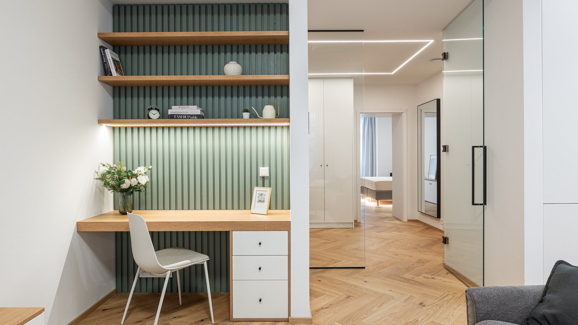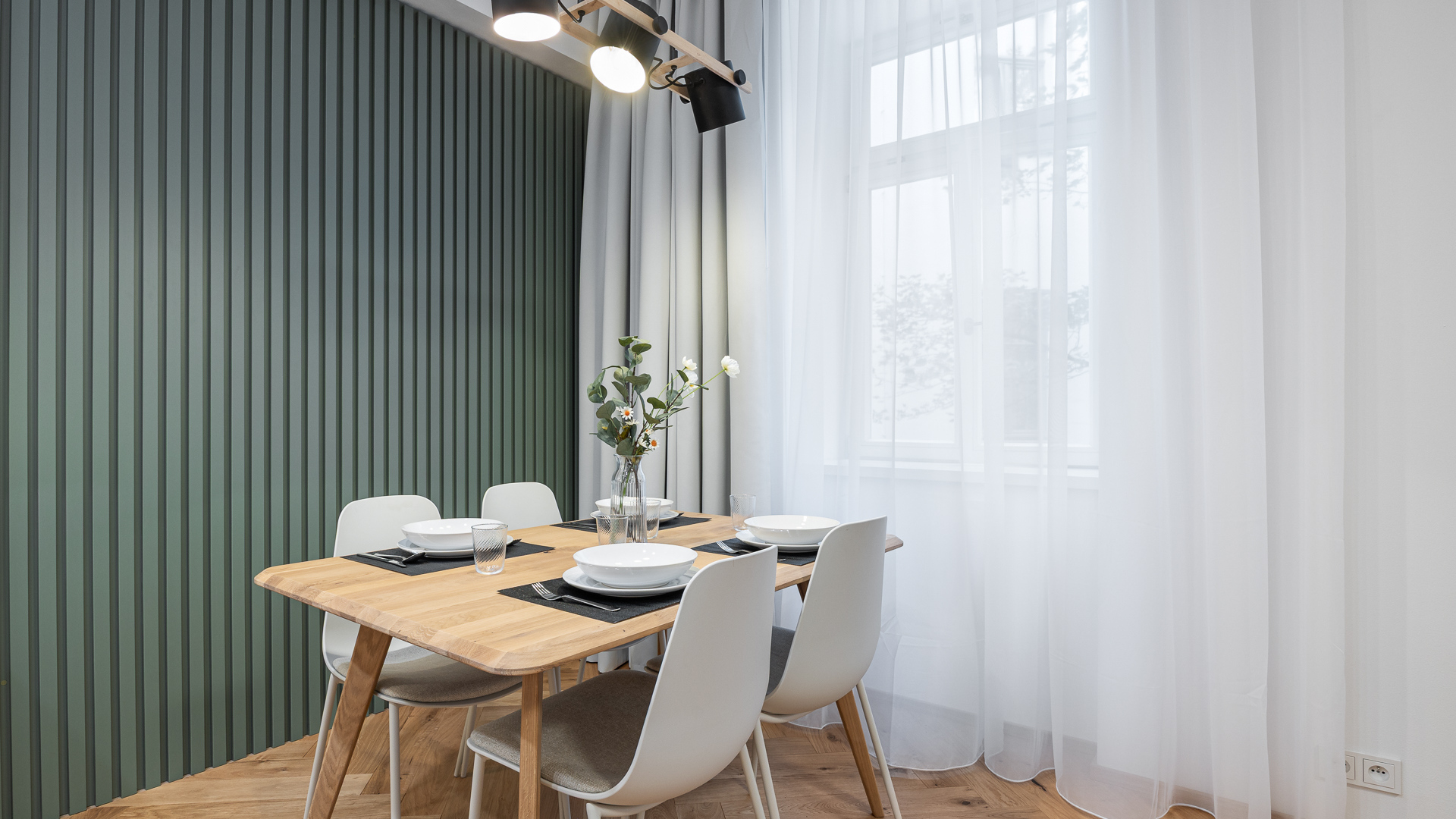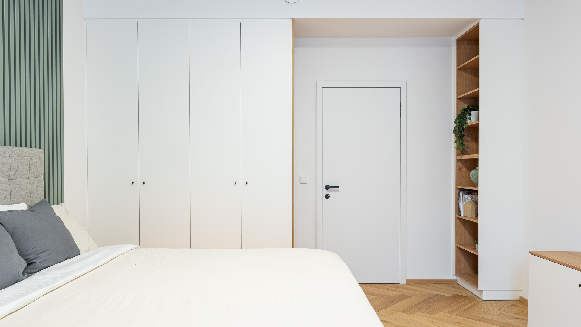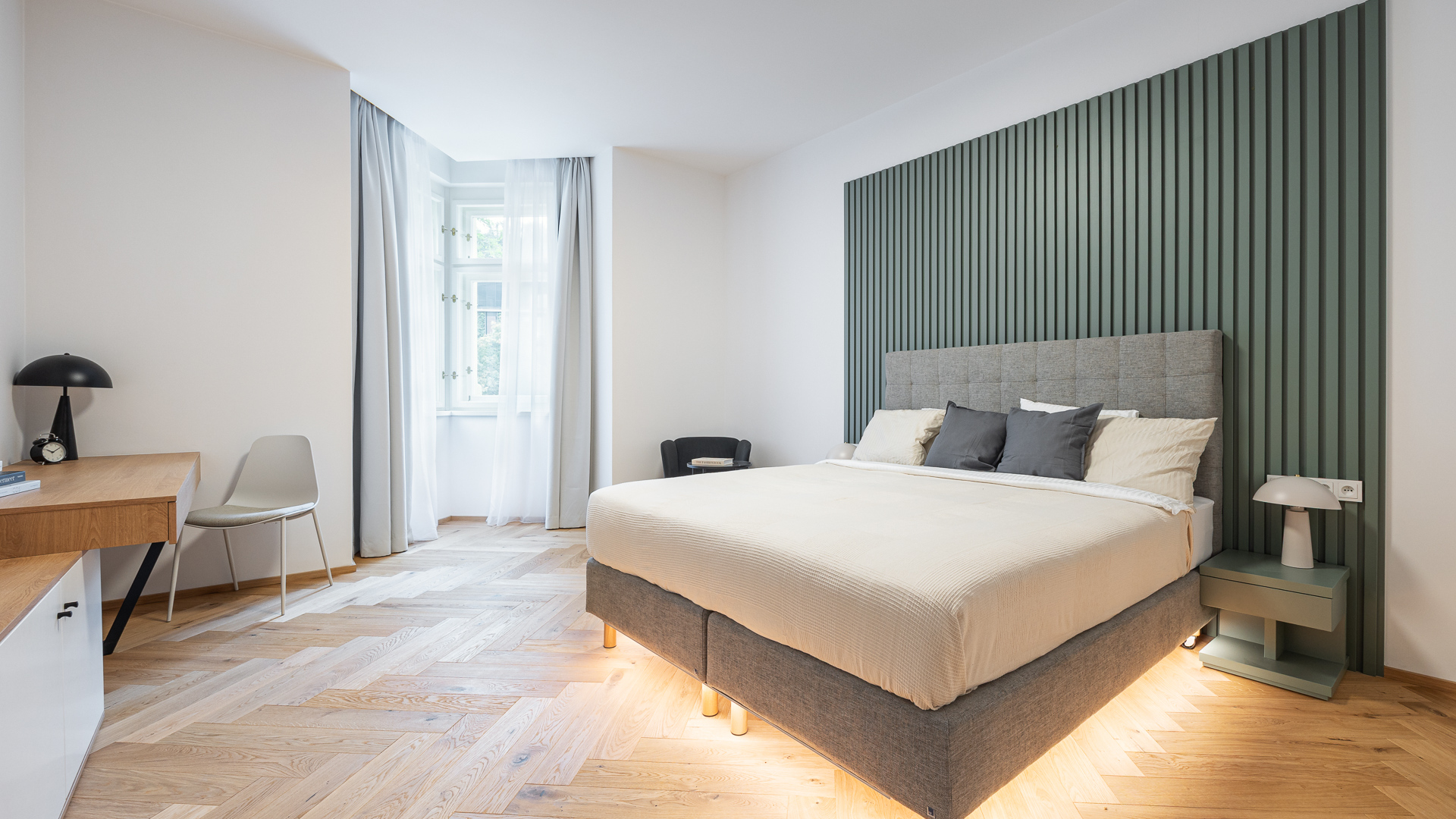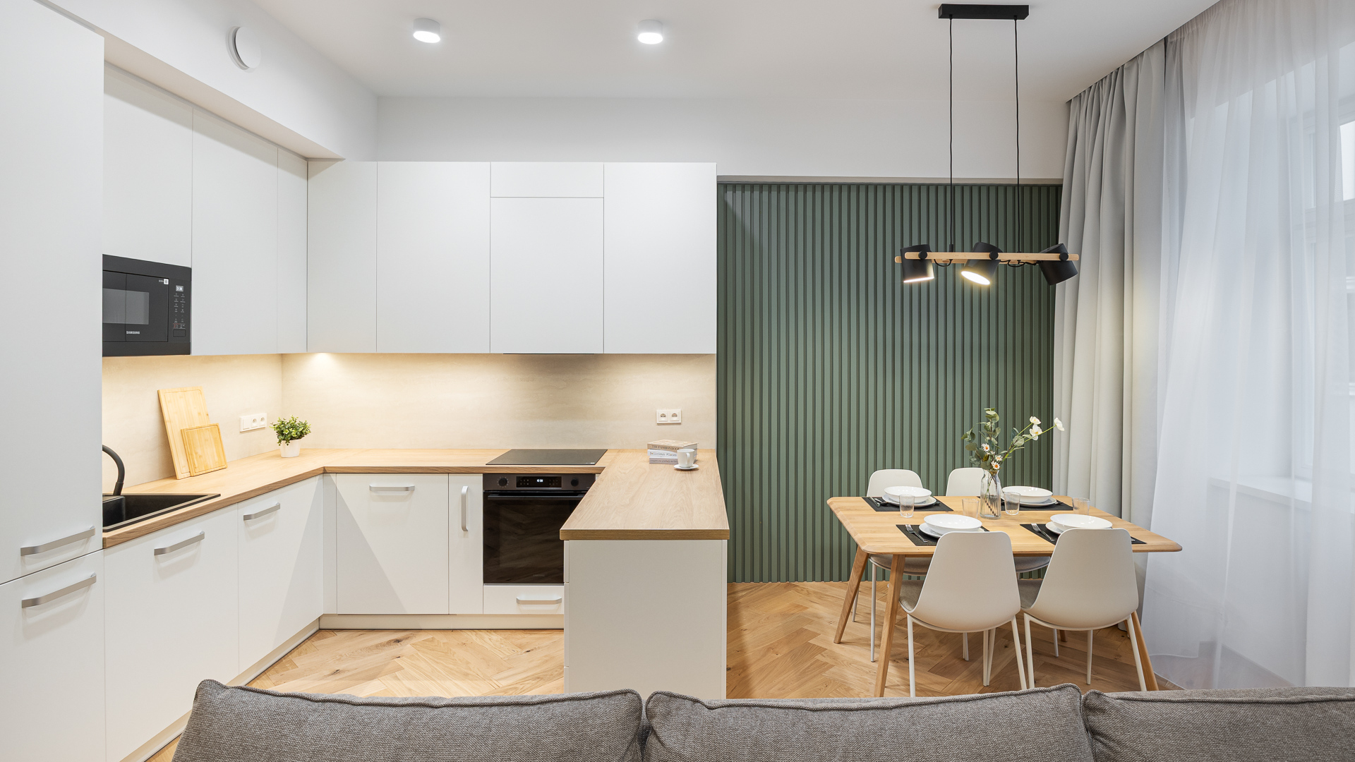 The interior has been designed with an emphasis on timelessness and high-quality craftsmanship, featuring OAKCENT wooden floors, a refined colour palette and carefully selected materials. The apartment is equipped with a modern kitchen and bespoke built-in storage.