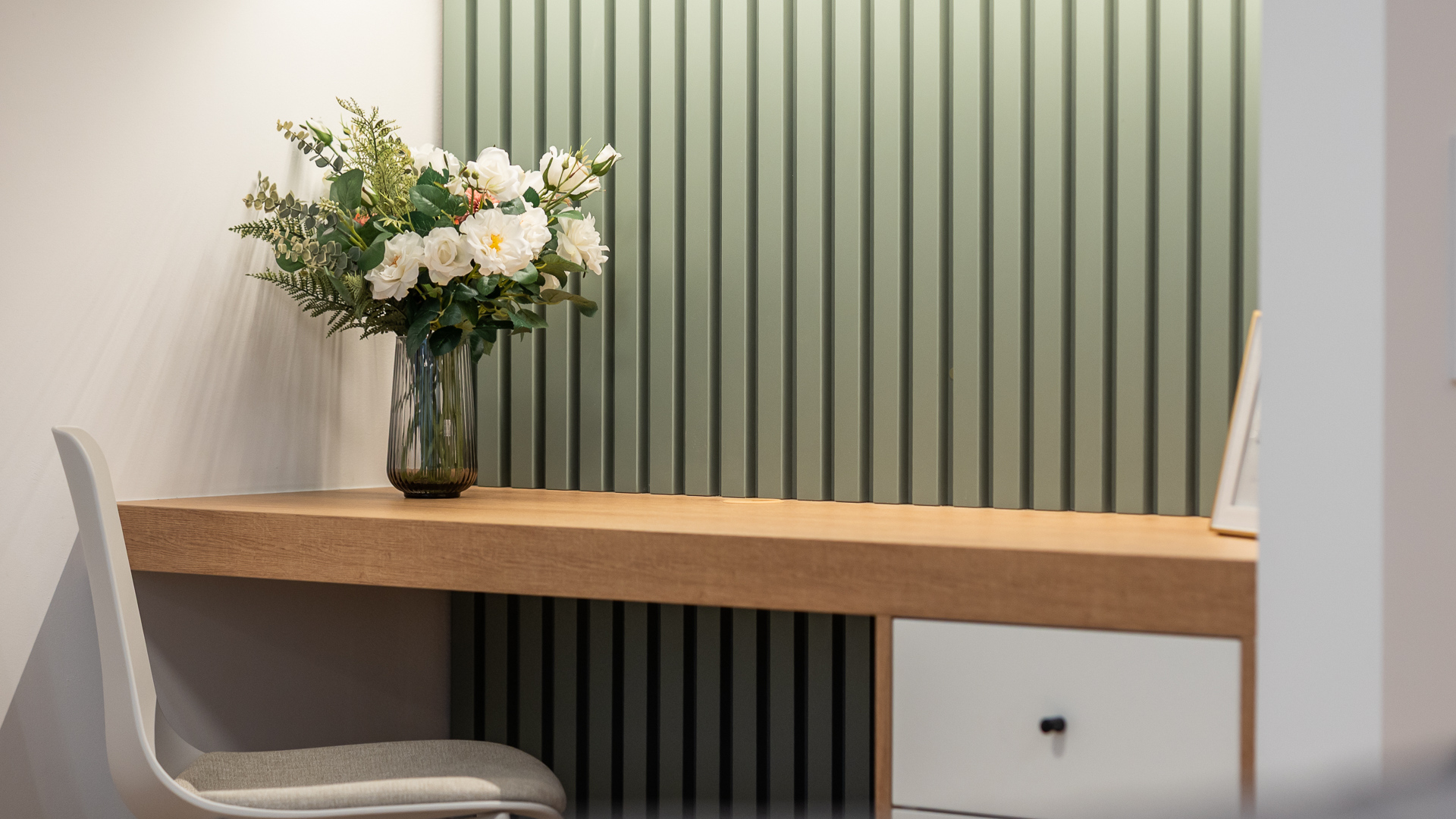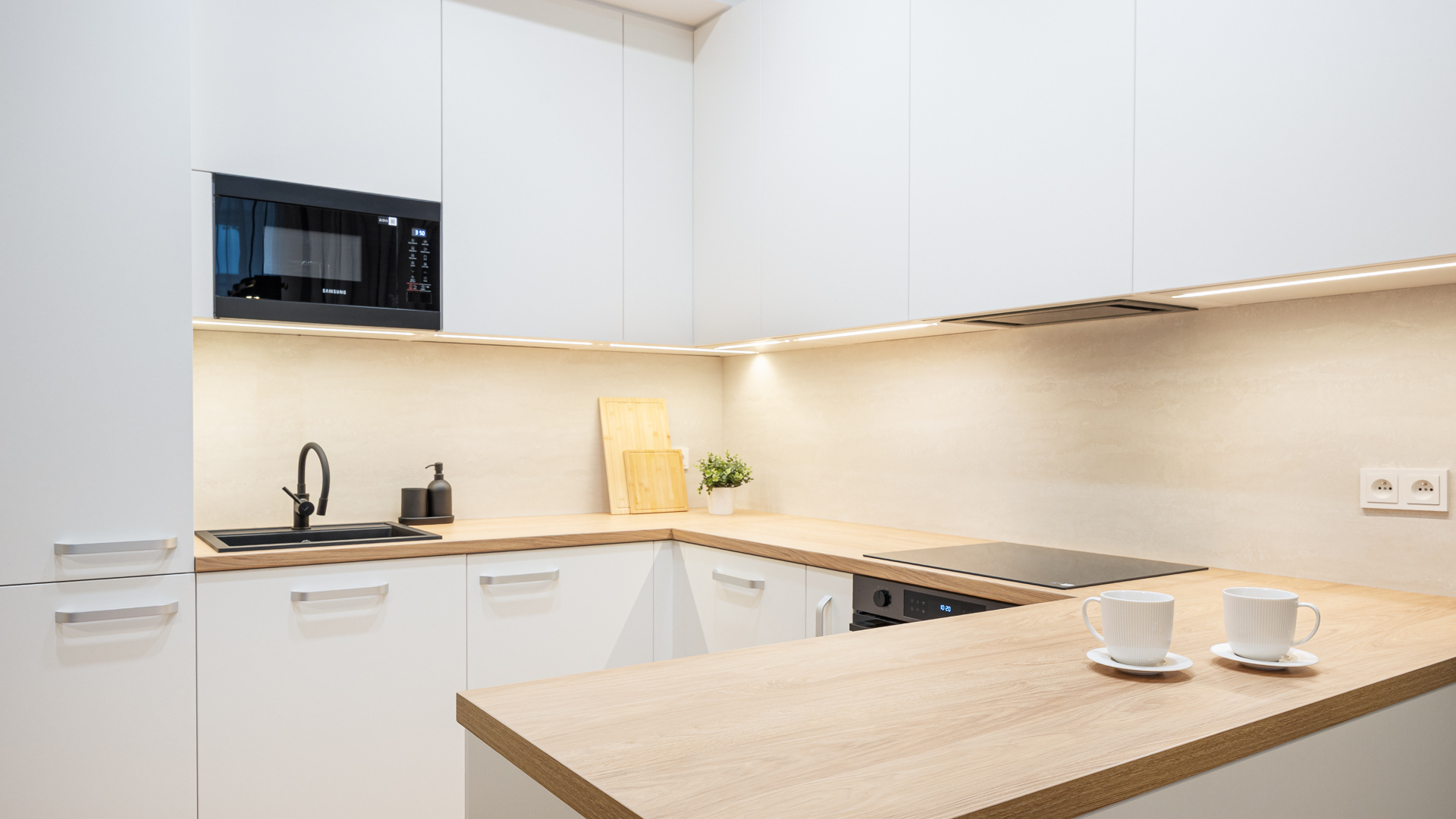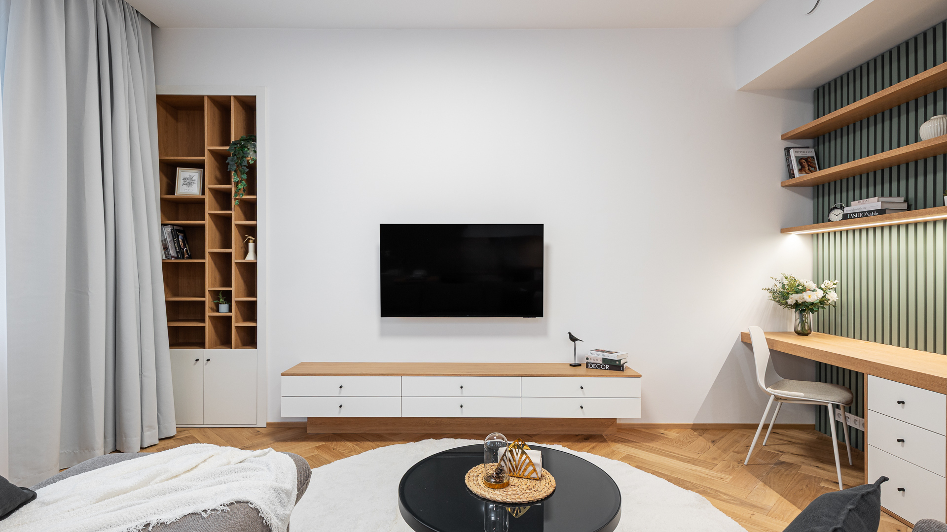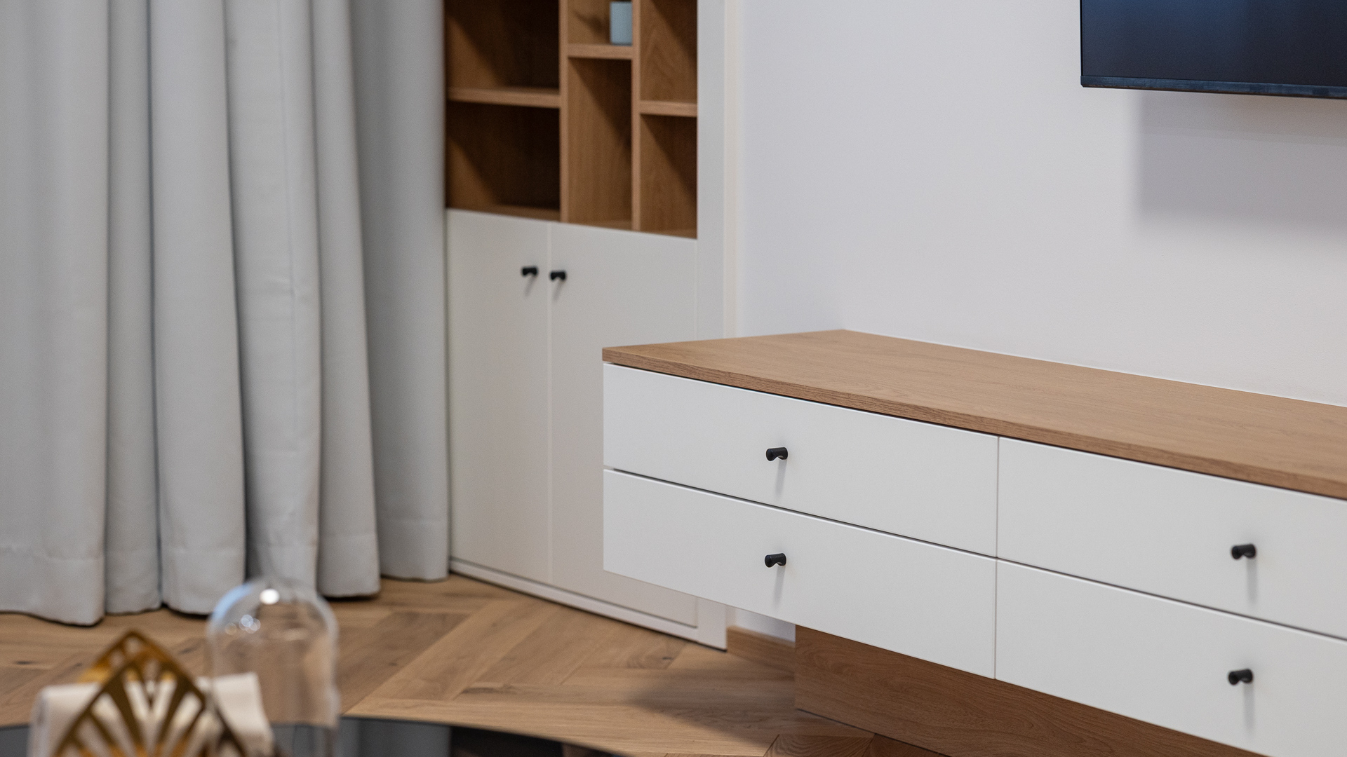 The interior has been designed with an emphasis on timelessness and high-quality craftsmanship, featuring OAKCENT wooden floors, a refined colour palette and carefully selected materials. The apartment is equipped with a modern kitchen and bespoke built-in storage.