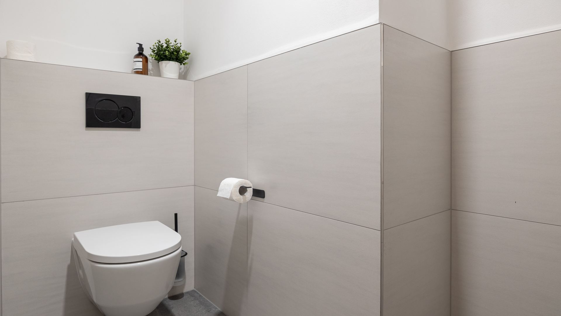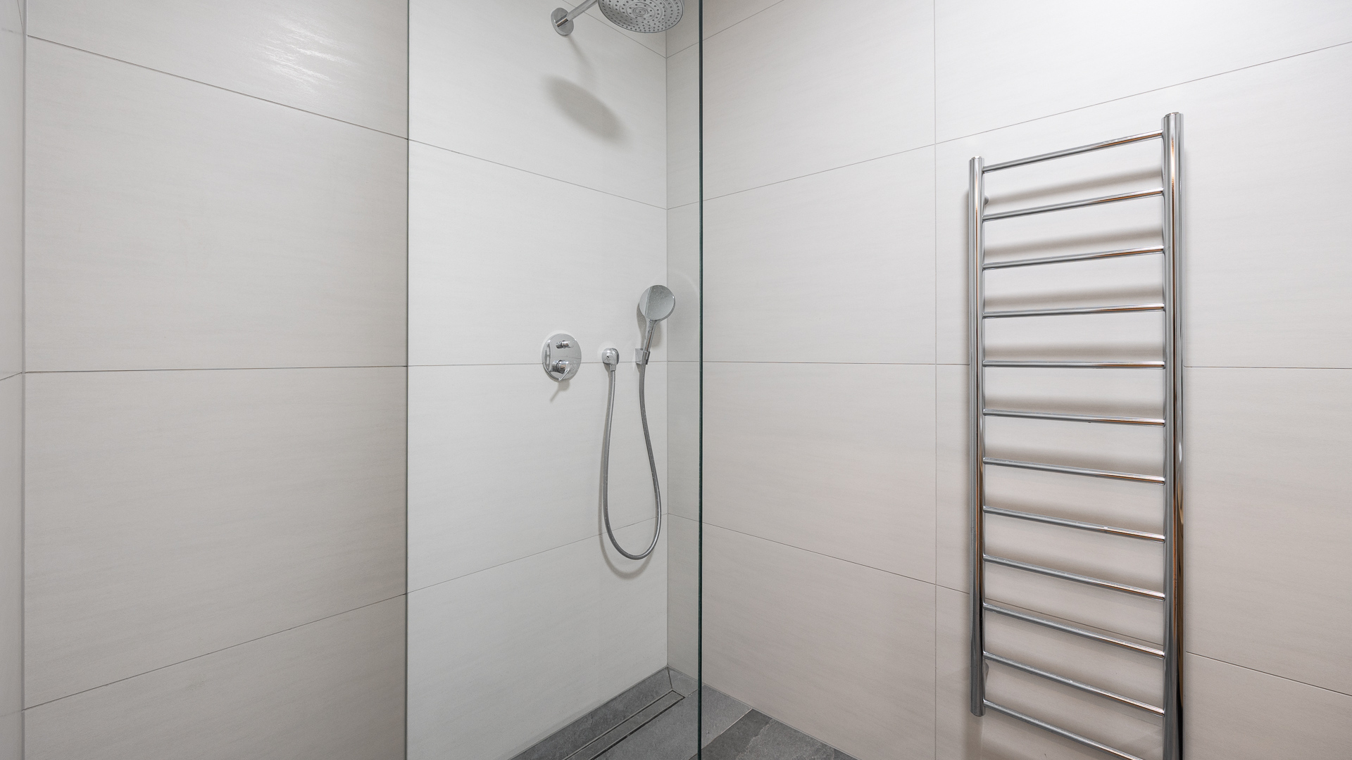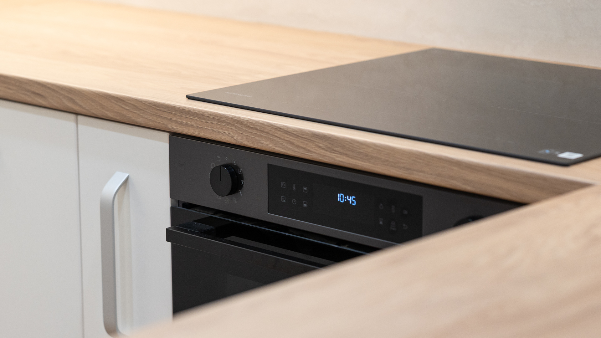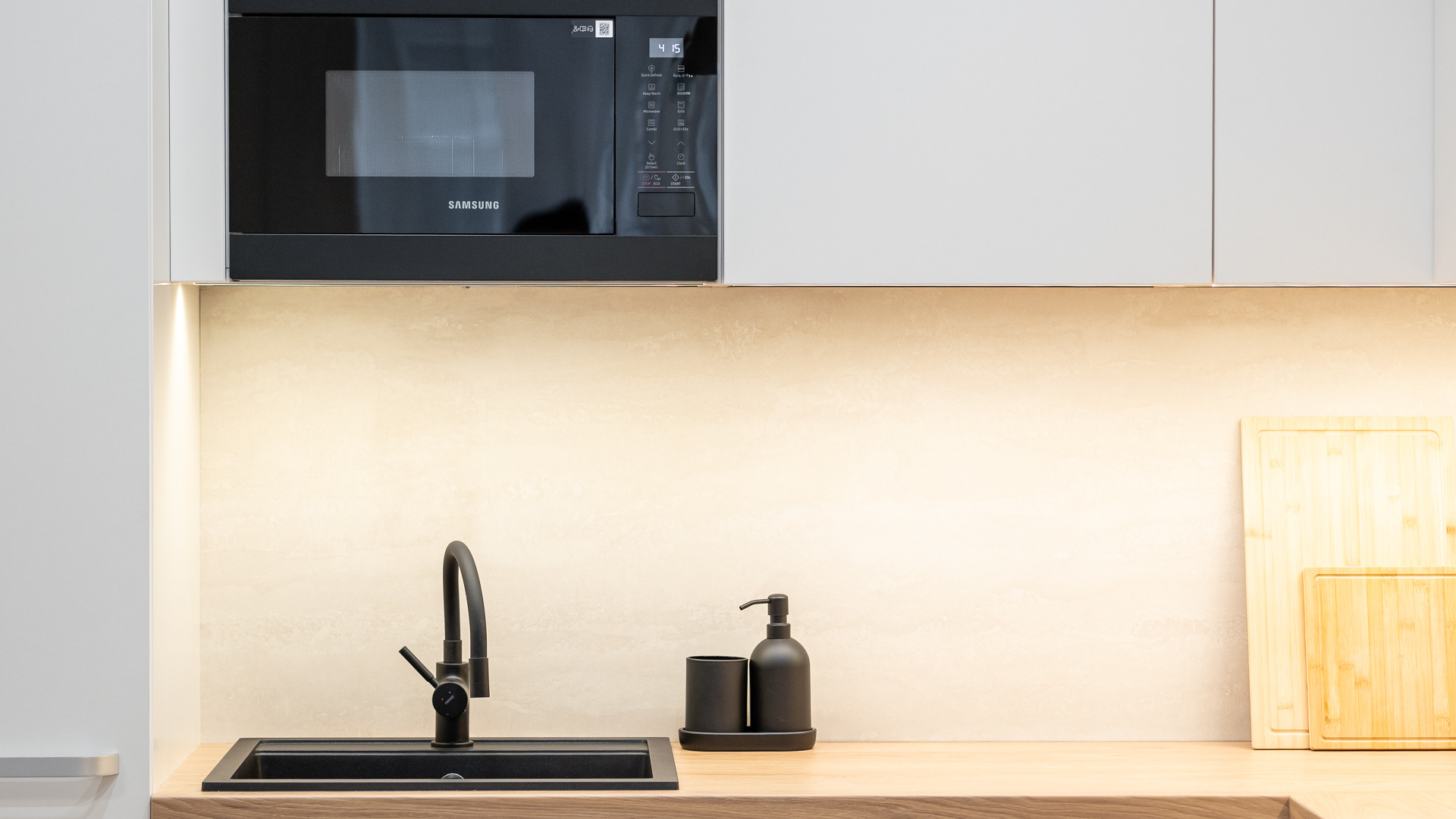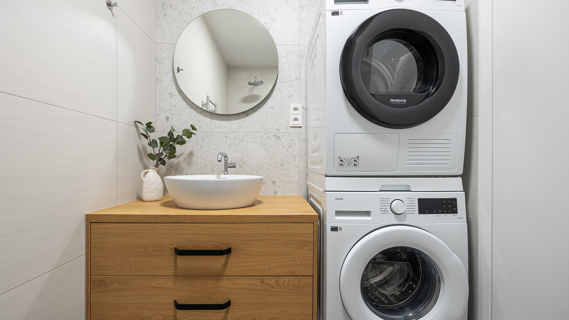 The technical features include underfloor heating and cooling, heat recovery ventilation and the LOXONE smart home system, enabling control of heating, cooling, shading and lighting. As a result, the apartment offers a comfortable climate throughout the entire year. The kitchen is fitted with built-in Samsung appliances; the bathroom includes a Samsung washer and dryer; and the living room is equipped with a multimedia TV.