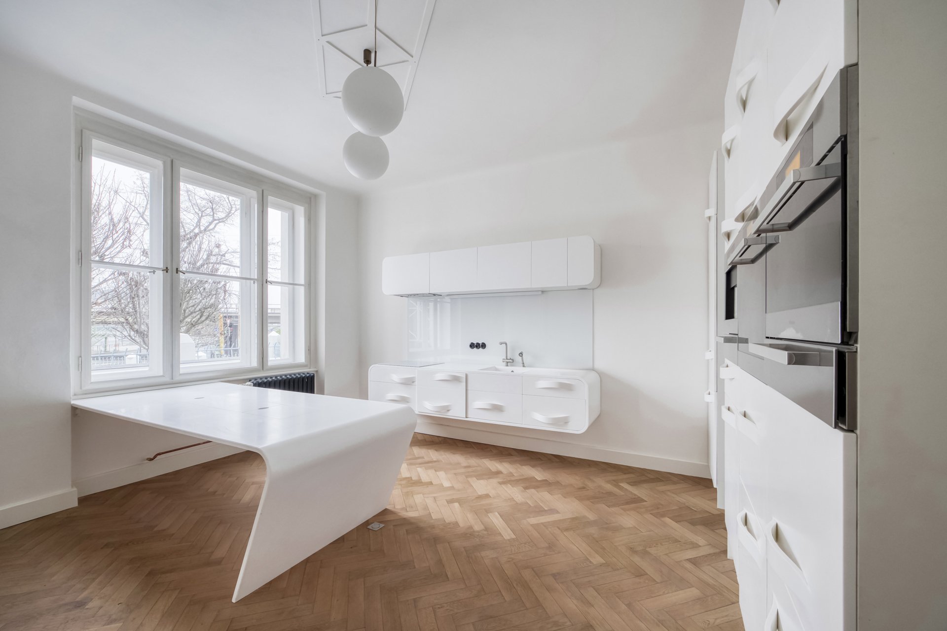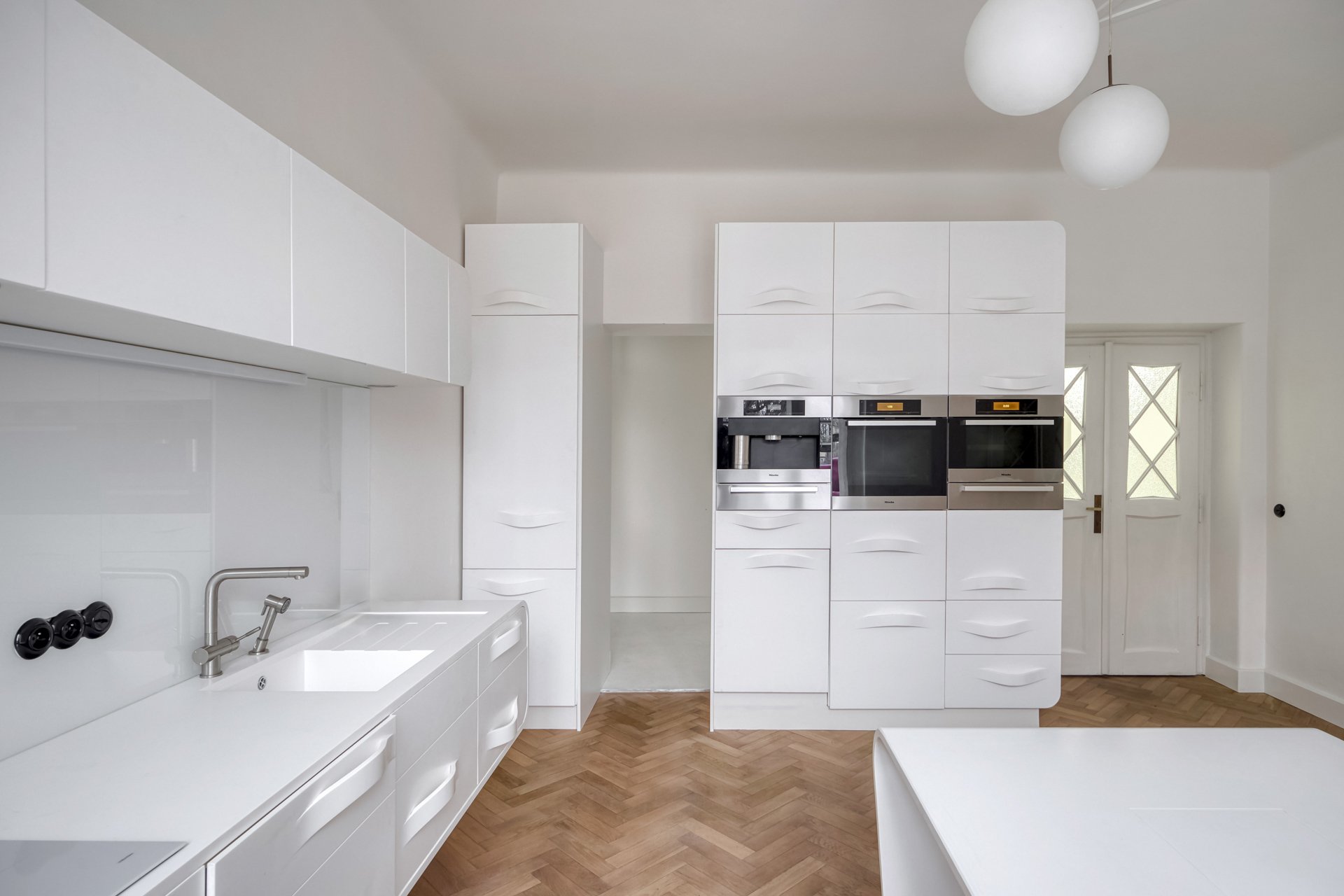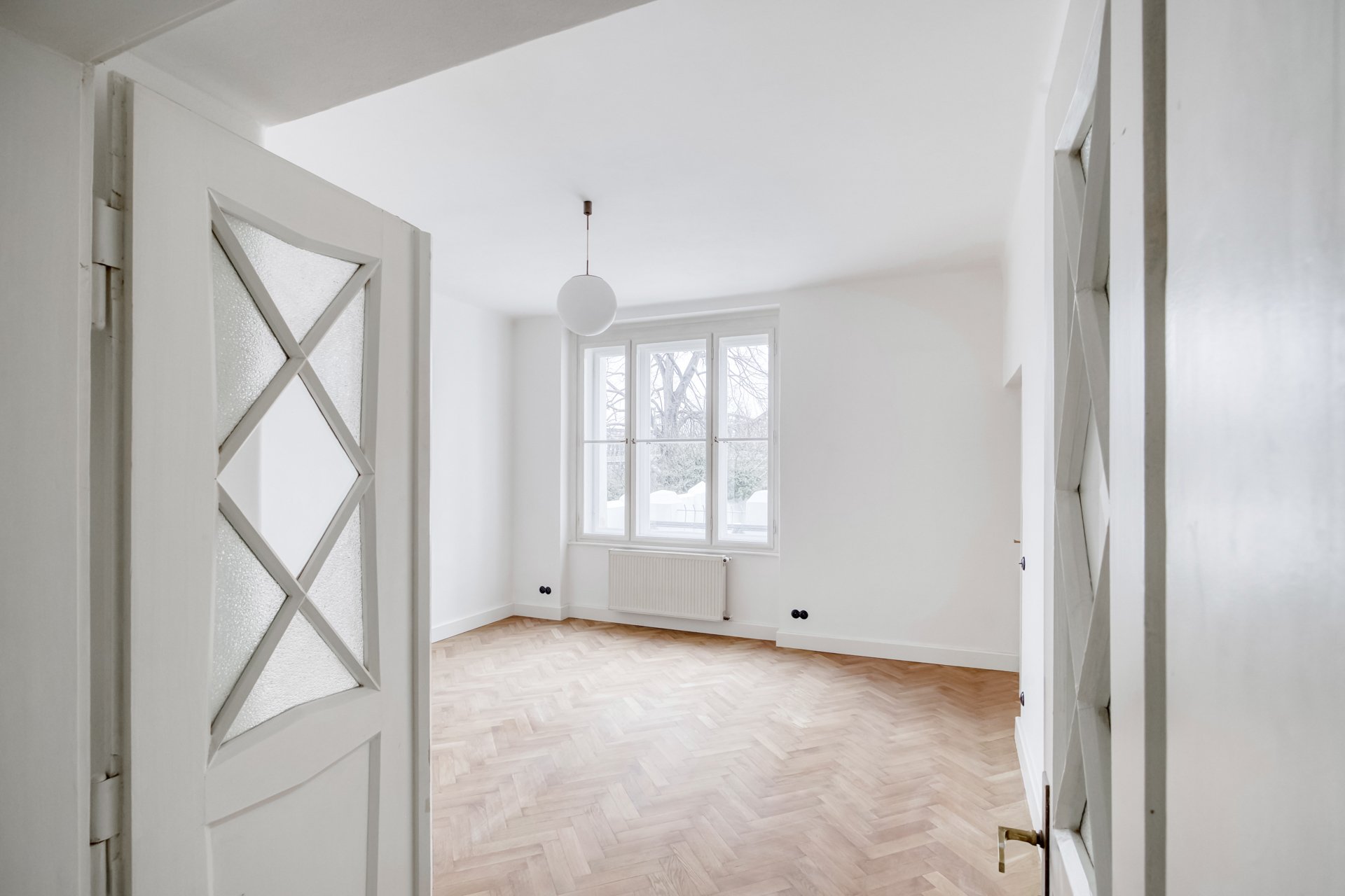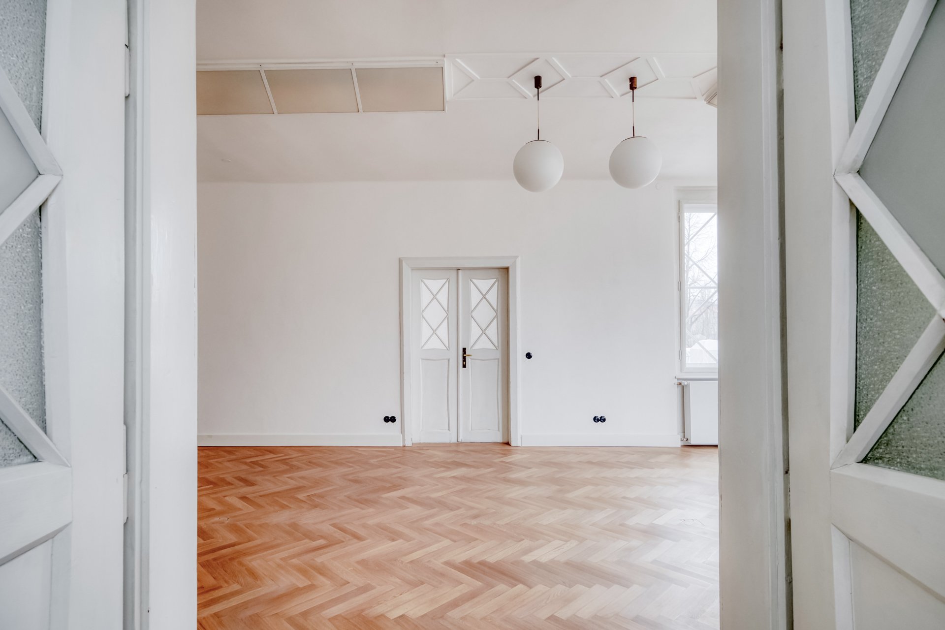 The interiors of the villa stand out with generous rooms with high ceilings, plenty of natural daylight and distinctive architectural details typical of the cubist aesthetic. The dominant element is the arched bay windows and a series of tall windows with original divisions, which lend the interiors a unique character and timeless elegance. The floors are made of renovated wooden parquet in a herringbone pattern, the interior is complemented by contemporary minimalist furnishings and modern technologies that sensitively respect the historical context of the building. The space also includes a designer kitchen with an island and built-in appliances, representative entrance areas and the possibility of variable office layouts, including open-space solutions.