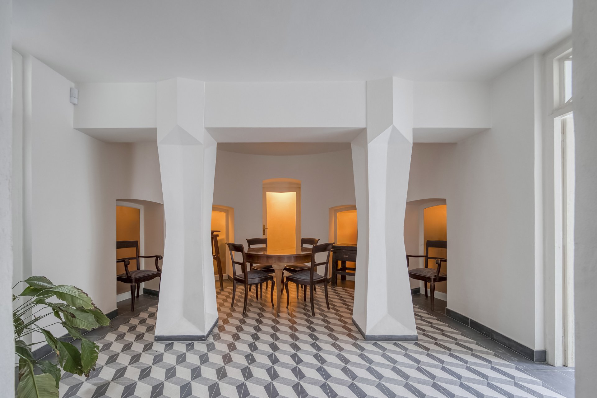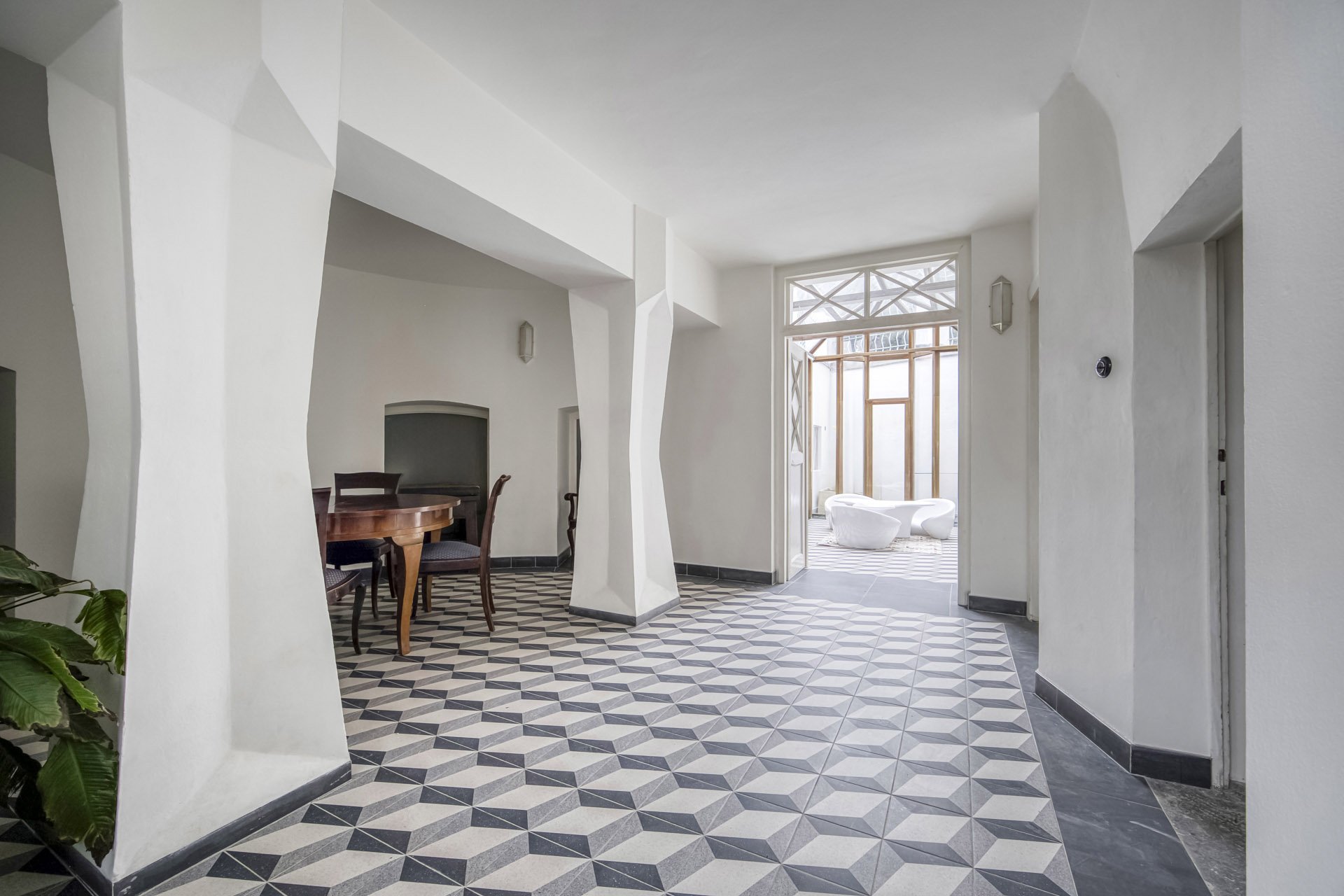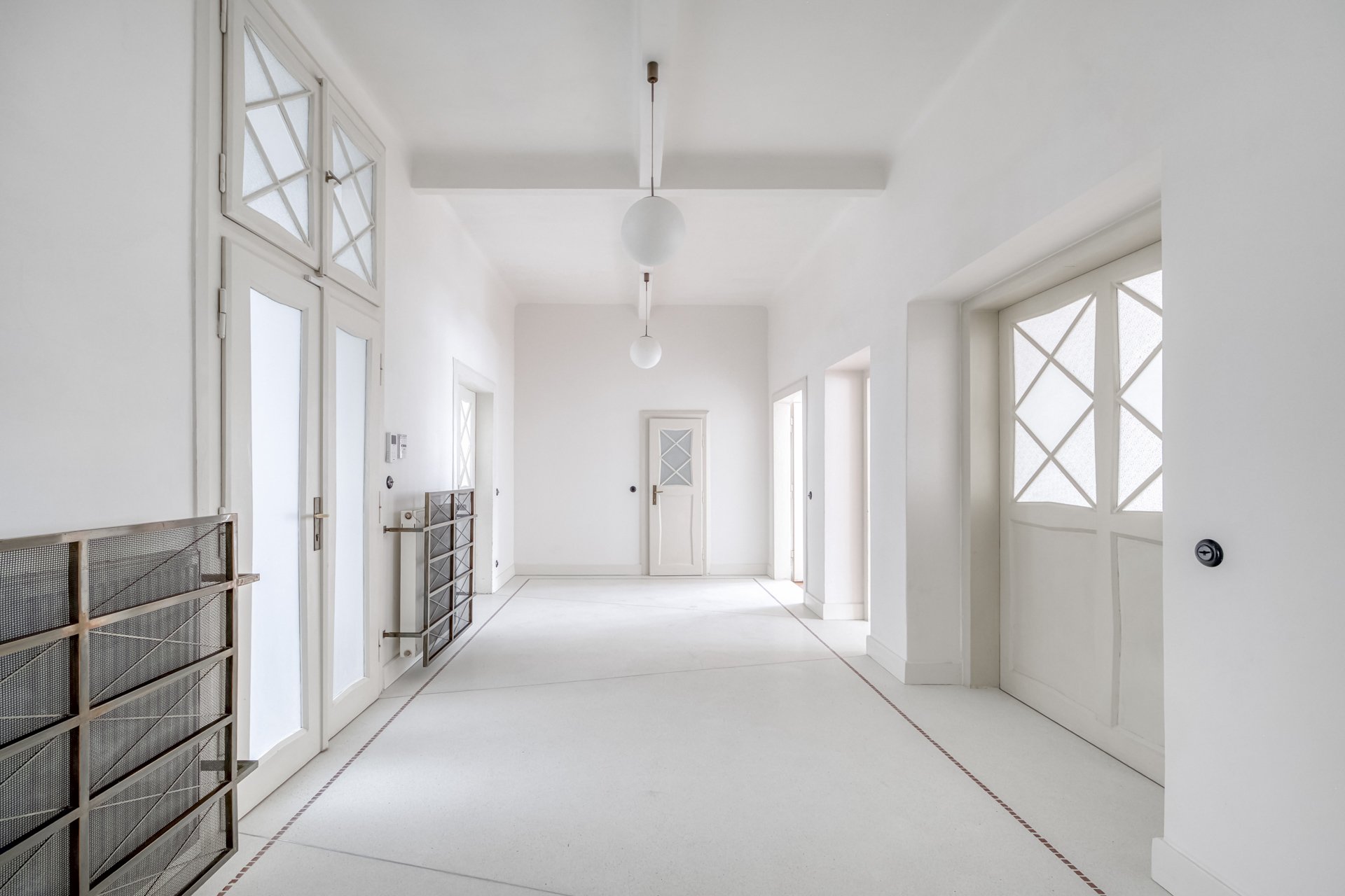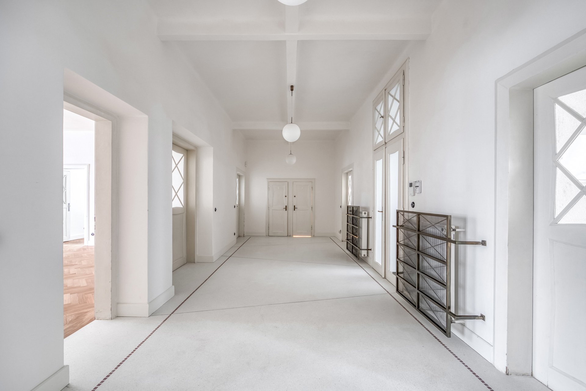 The interiors of the villa stand out with generous rooms with high ceilings, plenty of natural daylight and distinctive architectural details typical of the cubist aesthetic. The dominant element is the arched bay windows and a series of tall windows with original divisions, which lend the interiors a unique character and timeless elegance. The floors are made of renovated wooden parquet in a herringbone pattern, the interior is complemented by contemporary minimalist furnishings and modern technologies that sensitively respect the historical context of the building. The space also includes a designer kitchen with an island and built-in appliances, representative entrance areas and the possibility of variable office layouts, including open-space solutions.
