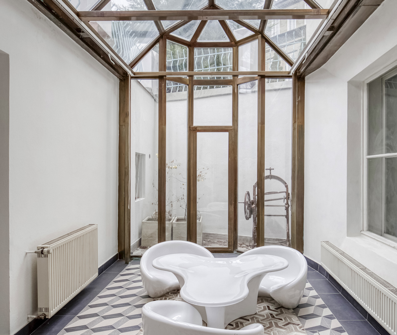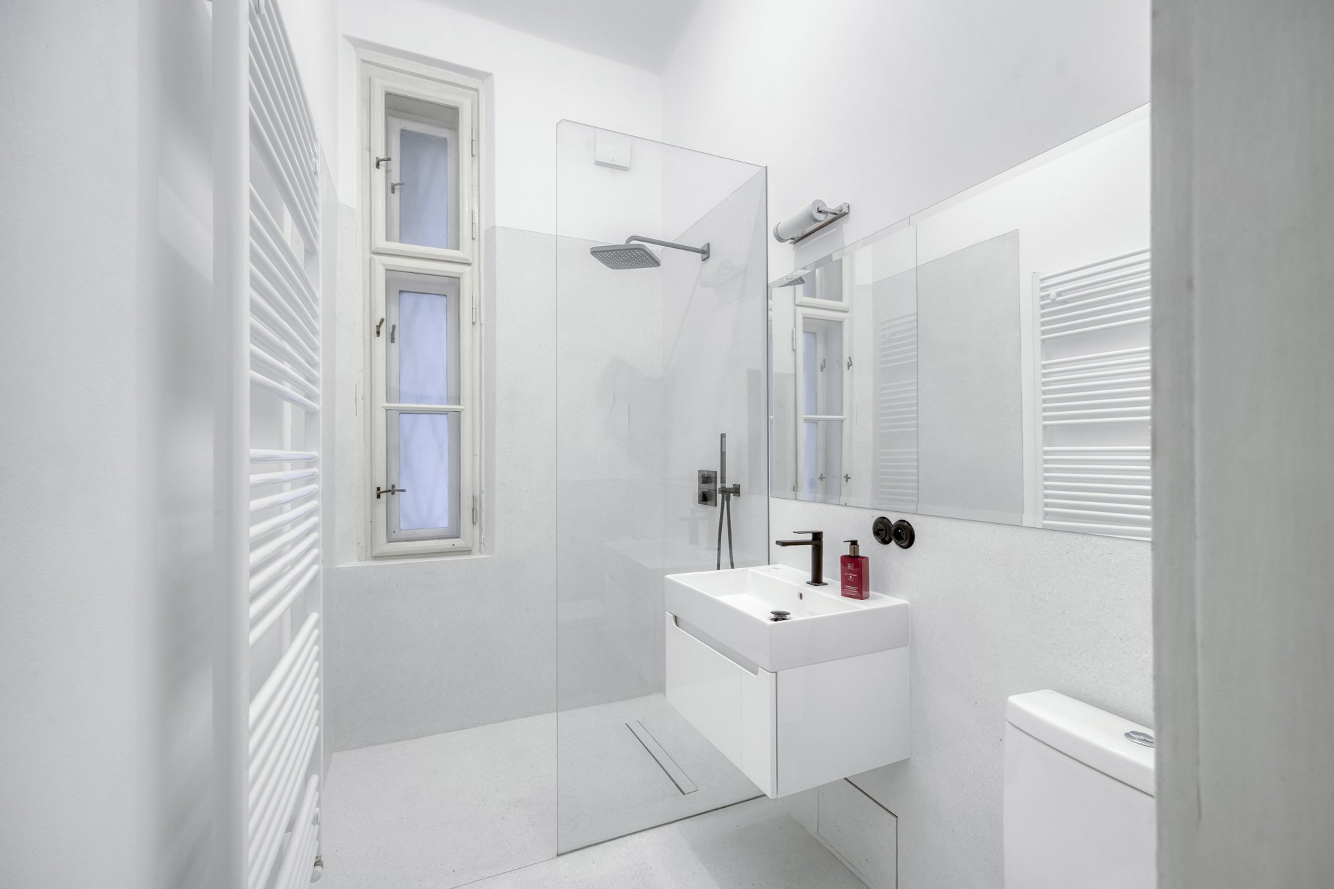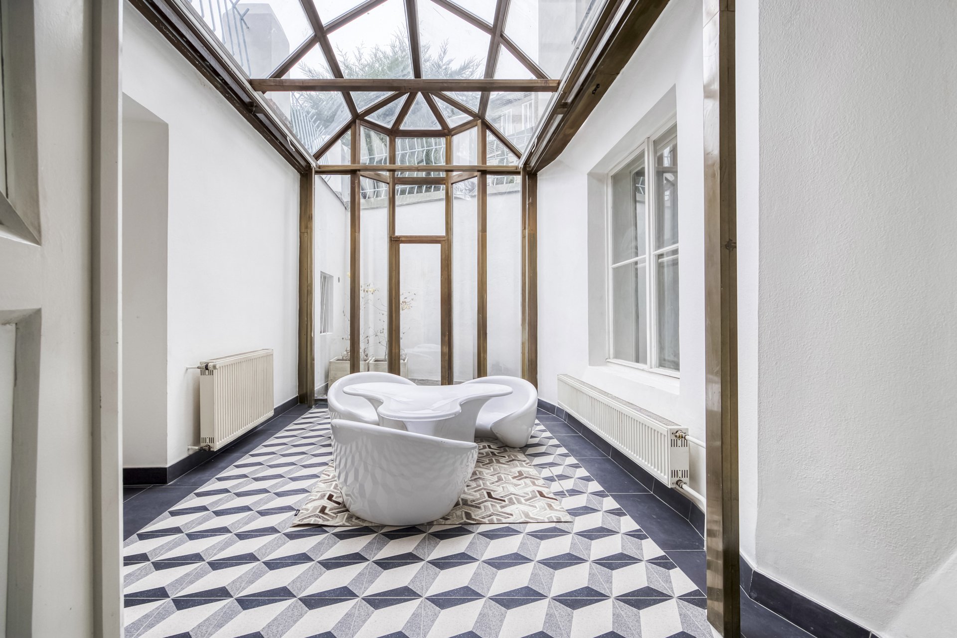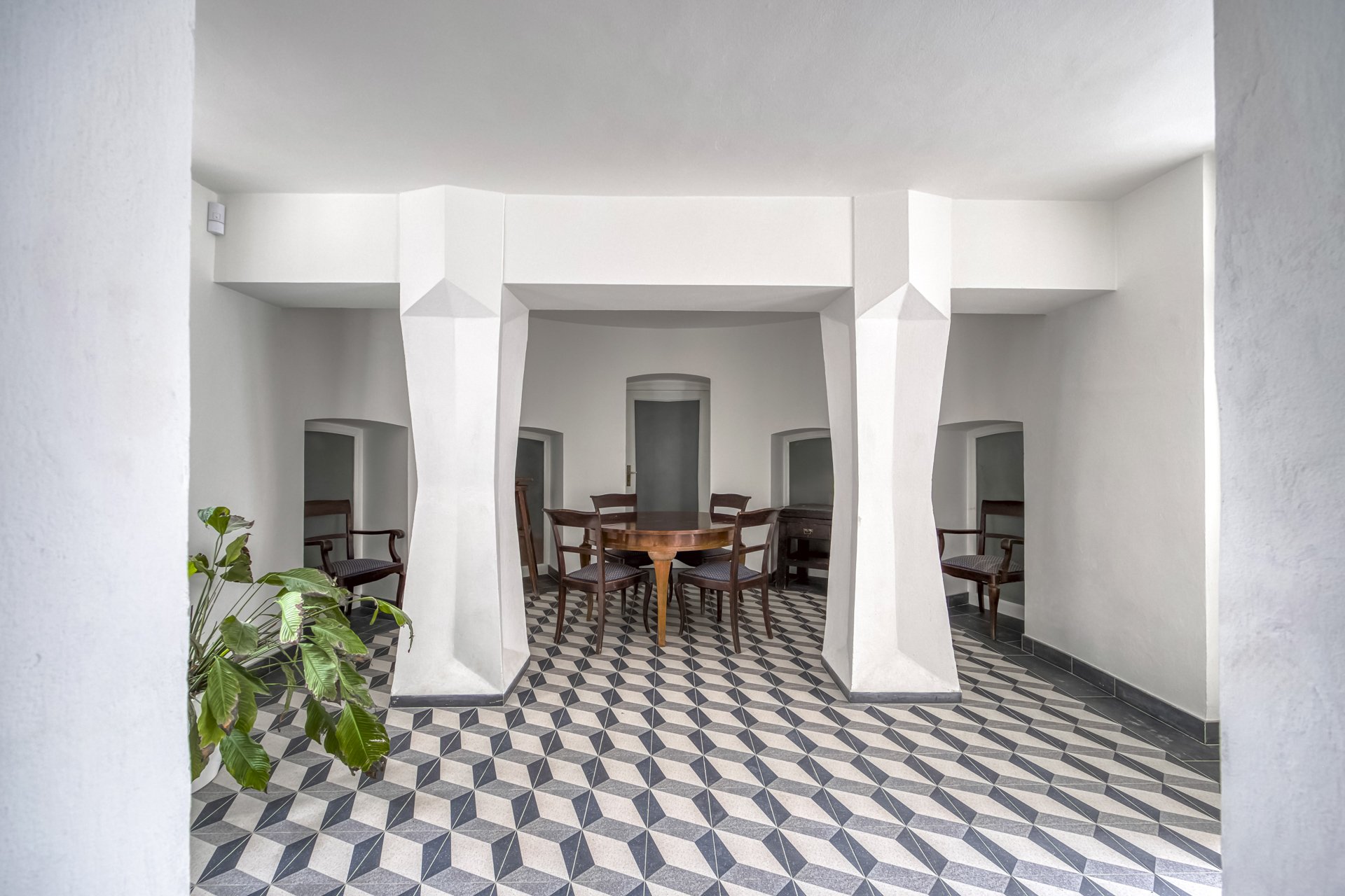 The interiors of the villa stand out with generous rooms with high ceilings, plenty of natural daylight and distinctive architectural details typical of the cubist aesthetic. The dominant element is the arched bay windows and a series of tall windows with original divisions, which lend the interiors a unique character and timeless elegance. The floors are made of renovated wooden parquet in a herringbone pattern, the interior is complemented by contemporary minimalist furnishings and modern technologies that sensitively respect the historical context of the building. The space also includes a designer kitchen with an island and built-in appliances, representative entrance areas and the possibility of variable office layouts, including open-space solutions.