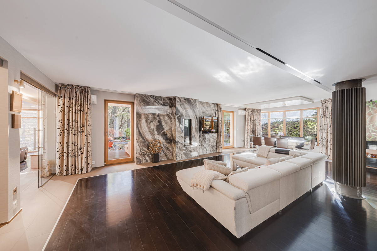 Pro chvíle relaxace a společného setkávání jsou v prvním nadzemním podlaží dva obývací pokoje s ambientním osvětlením, krbem a vstupem na terasu. Jedinečnou atmosféru dokresluje velké akvárium s živými korály a exotickými rybami. Druhému obývacímu pokoji dominuje krb s obložením z mramoru, na vzdušný prostor dále navazuje jídelna s výhledy do zahrady. Součástí interiéru je kompletně vybavená kuchyň s americkou lednicí a vinotékou.